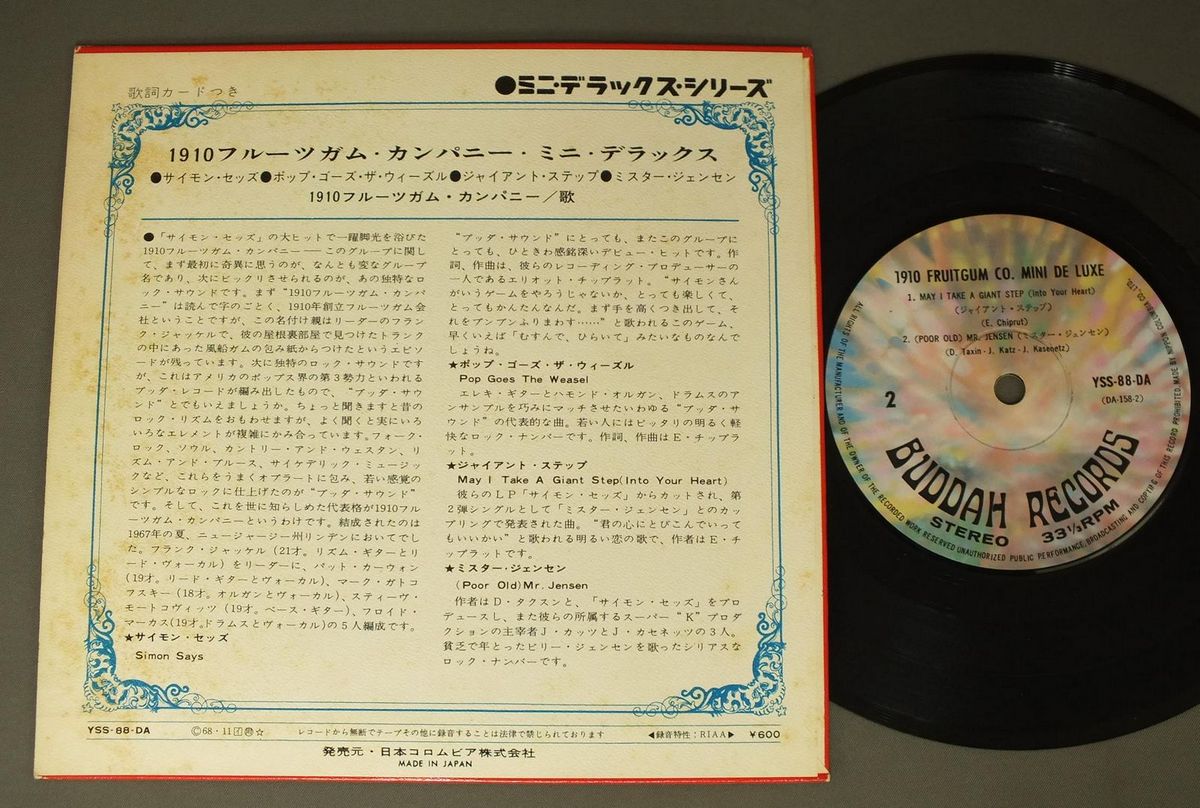 1910 FRUITGUM COMPANY1910フルーツガム・カンパニー/MINI DE LUXE EPミニ・デラックス EP YSS88DA 製造国:日本盤 / Media:7inch外観:EX-盤の状態:EX 価格(税込):¥550(売約済) 送料 7inch:定形外郵便 360円~LP:定形外郵便 660円~送料は、注文の最終画面で確認頂けます。 > > 1910 FRUITGUM COMPANY/MINI DE LUXE EP 外観 (EX-)特記事項:裏側は、細かいシミが少し有りますが、表側はシミやスリキズ等あまり無くきれいな感じです。外観EX-の共通説明:ダメージ軽度~多少。 中古品としては普通の状態。シミ、ヨゴレ、スレなど軽く~多少。 盤の状態 (EX)特記事項:薄いスリキズ・スレ少しある感じ。一見してきれいな感じです。盤EXの共通説明:盤面のスリキズが薄いものが少し~軽度 音に出そうなものは無いように見える(軽微なソフトティック音は除く)。 Tweet それぞれの画像をクリックすると、大きい写真が見られます こちらの商品もお勧めです 990円 BYREDSバーズ / BYRDSバーズ 880円 DOOBIE BROTHERSドゥービー・ブラザーズ / ONE STEP CLOSERワン・ステップ・クローサー 990円 DONNY & MARIE / WINNING COMBINATION 770円 SNEAKERスニーカー / LOOSE IN THE WORLDルーズ・イン・ザ・ワールド 770円 MOTT THE HOOPLE / LIVE華麗なる扇動者 770円 SANTANAサンタナ / FESTIVALフェスティバル 770円 STYXスティクス / CORNERSTONEコーナーストーン 1,320円 PLAYERプレイヤー / SPIES OF LIFEスパイズ・オブ・ライフ
