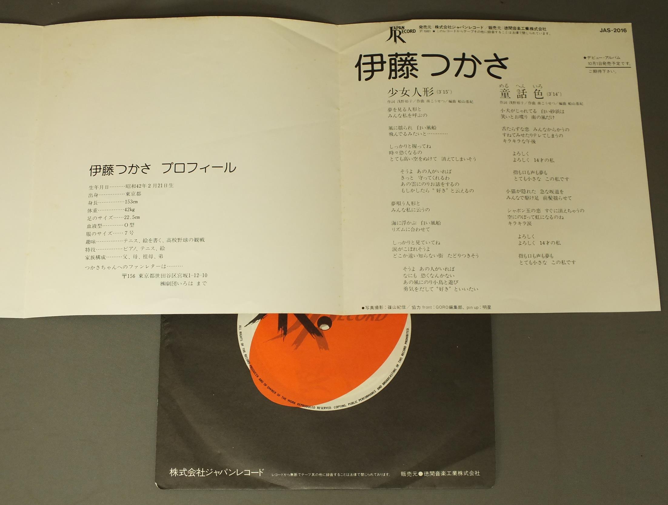 TSUKASA ITO伊藤つかさ/GIRL DOLL少女人形 JAS2016 製造国:日本盤 / Media:7inch外観:EX盤の状態:EX+ 価格(税込):¥550(売約済) 送料 7inch:定形外郵便 360円~LP:定形外郵便 660円~送料は、注文の最終画面で確認頂けます。 > > TSUKASA ITO/GIRL DOLL 外観 (EX)特記事項:ヘリスレやヨレ少し有り。内側は、薄い細かいシミが少し有ります。外観EXの共通説明:ダメージが限定的。中古品としては保存状態がよい方。シミ、ヨゴレ、スレ 少し~軽度。 盤の状態 (EX+)特記事項:極薄いスリキズ・スレ少し。一見してきれいな状態です。盤EX+の共通説明:盤面の極薄いスリキズ、スレ少し程度 音に出そうなものは無いように見える(極軽微なソフトティック音は除く)。 Tweet それぞれの画像をクリックすると、大きい写真が見られます こちらの商品もお勧めです 770円 SEIKO MATSUDA松田聖子 / CANDYキャンディー 1,210円 AKINA NAKAMORI中森明菜 / SILENT LOVE 1,320円 YOSHIMI IWASAKI岩崎良美 / RING-A-DING (1st ALBUM)リング・ア・ディング (1st ALBUM) 550円 ONYANKO CLUBおニャン子クラブ / KICK OFFキックオフ 770円 ERI NITTA新田恵利 / ERI 990円 SONOKO KAWAI河合その子 / MODE DE SONOKOモード・デ・その子 770円 NAOKO KAWAI河合奈保子 / TWILIGHT DREAM 1,210円 PINK LADYピンク・レディー / `78 JUMPING SUMMER CARNIVAL`78 ジャンピング・サマー・カーニバル