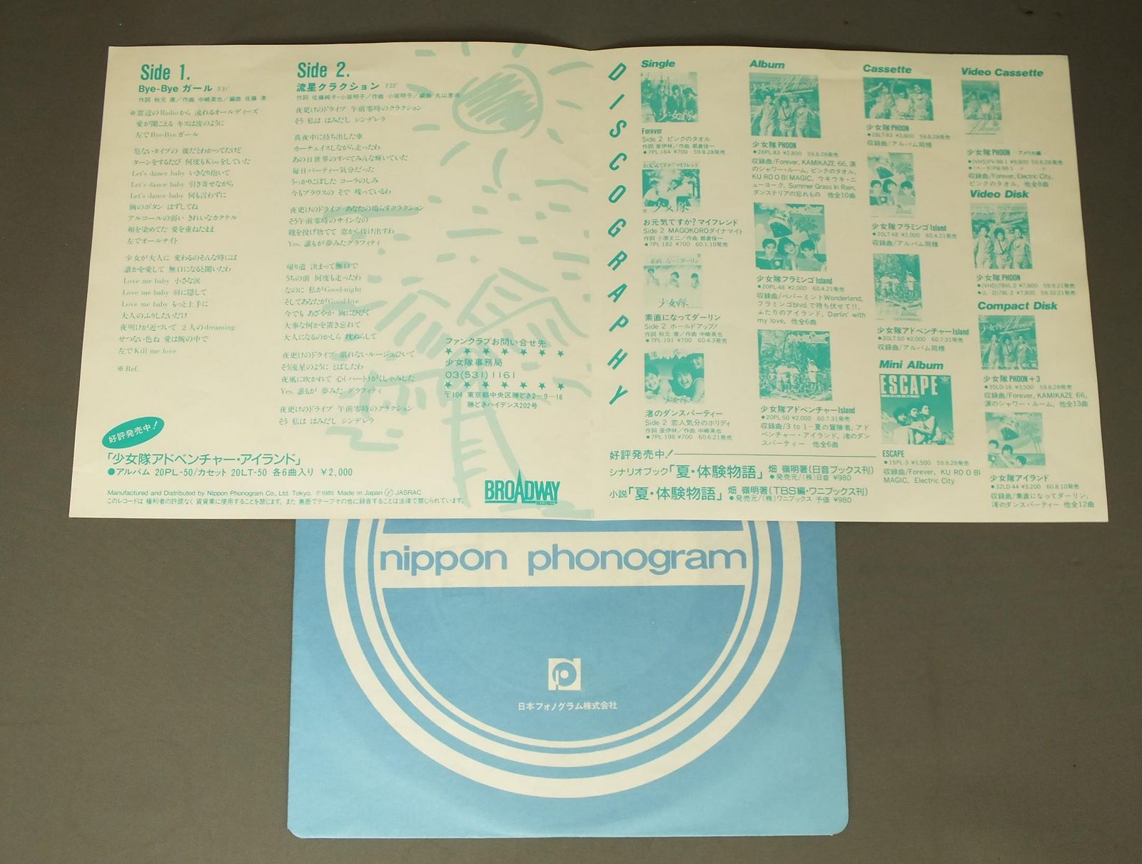 SHOUJYO TAI少女隊/BYE BYE GIRLドラマ「夏・体験物語」BYE-BYE ガール 7PL202 製造国:日本盤 / Media:7inch外観:EX+盤の状態:EX+ 価格(税込):¥330(売約済) 送料 7inch:定形外郵便 360円~LP:定形外郵便 660円~送料は、注文の最終画面で確認頂けます。 > > SHOUJYO TAI/BYE BYE GIRL 外観 (EX+)特記事項:ヨレ少し有りますが、きれいな感じです。外観EX+の共通説明:中古としては美品、一見してきれいでダメージが軽微。シミ、ヨゴレ、スレ有っても僅か~少し。 盤の状態 (EX+)特記事項:極薄いスリキズ・スレ少し。一見してきれいな状態です。盤EX+の共通説明:盤面の極薄いスリキズ、スレ少し程度 音に出そうなものは無いように見える(極軽微なソフトティック音は除く)。 Tweet それぞれの画像をクリックすると、大きい写真が見られます こちらの商品もお勧めです 770円 SHOKO SAWADA沢田聖子 / SHOKO LIVE 770円 YUKO ISHIKAWA石川優子 / YUKO TOKIMEKU-KORO優子ときめくころ 1,210円 USHIRO-YUBI SASAREGUMIうしろゆびさされ組 / 1st LP ( FUWAFURA )ふ・わ・ふ・ら 1,210円 PINK LADYピンク・レディー / PINK LADY CHALLENGE CONCERTピンク・レディー・チャレンジ・コンサート 770円 YOSHIE KASHIWABARA柏原よしえ / SUMMER SENSATIONサマー・センセイション 770円 CHIEMI KAI甲斐智枝美 / WINK ( 1st ALBUM )ウインク 1,210円 AKINA NAKAMORI中森明菜 / FANTASYファンタジー`幻想曲` 1,210円 TSUKASA ITOH伊藤つかさ / SAYONARA KONNICHIWAさよなら、こんにちは