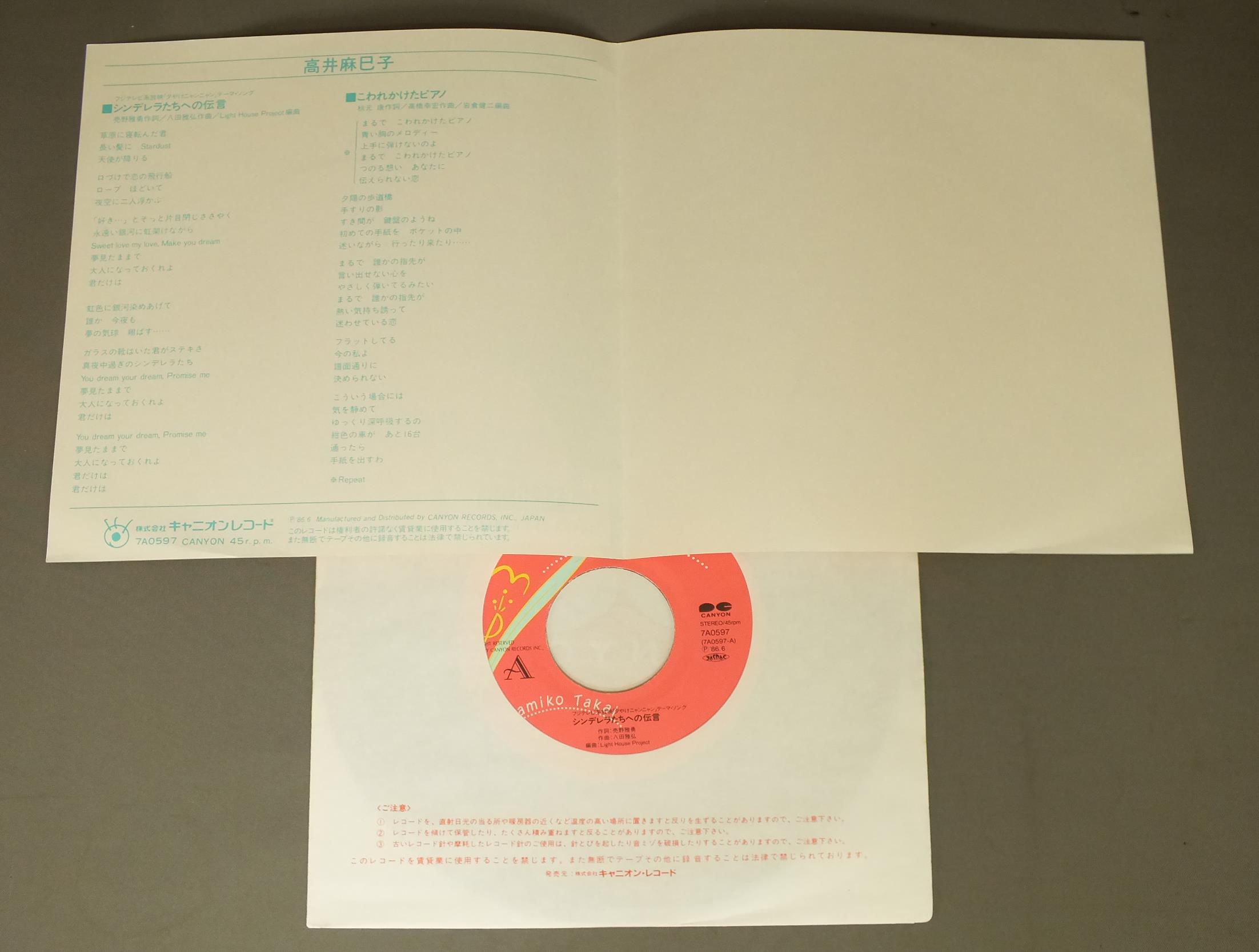 MAIKO TAKAI高井麻巳子/MESSAGE TO CINDERELLAS「夕やけニャンニャン」シンデレラたちへの伝言 7A0597 製造国:日本盤 / Media:7inch外観:EX+盤の状態:EX+ 価格(税込):¥330 送料 7inch:定形外郵便 360円~LP:定形外郵便 660円~送料は、注文の最終画面で確認頂けます。 > > MAIKO TAKAI/MESSAGE TO CINDERELLAS 外観 (EX+)特記事項:背スレが少し有りますが、きれいな感じです。外観EX+の共通説明:中古としては美品、一見してきれいでダメージが軽微。シミ、ヨゴレ、スレ有っても僅か~少し。 盤の状態 (EX+)特記事項:極薄いスリキズ・スレ少し。一見してきれいな状態です。盤EX+の共通説明:盤面の極薄いスリキズ、スレ少し程度 音に出そうなものは無いように見える(極軽微なソフトティック音は除く)。 Tweet それぞれの画像をクリックすると、大きい写真が見られます こちらの商品もお勧めです 990円 GO NAGABUCHI長渕剛 / GYAKURYU逆流 440円 MUNEYUKI SATOHさとう宗幸 / AOBAJO KOIUTA青葉城恋歌 1,320円 TAKAKO SHIRAI白井貴子 / PRINCESS NIGHTプリンセスナイト 990円 HATUMI SHIBATAしばたはつみ / BEST 16マイ・ラグジュアリー・ナイト しばたはつみ ベスト16 880円 TWIST世良公則 &ツイスト / ファースト・アルバム 770円 MOTOHARU SANO佐野元春 / VISITORS 990円 TULIP - YUMI MATSUTOYA etcチューリップ - ユーミン他 / PROMO ONLY店頭演奏総合試聴盤 1,210円 MASA TAKAGI高木麻早 / 1st ALBUM思い出が多すぎて