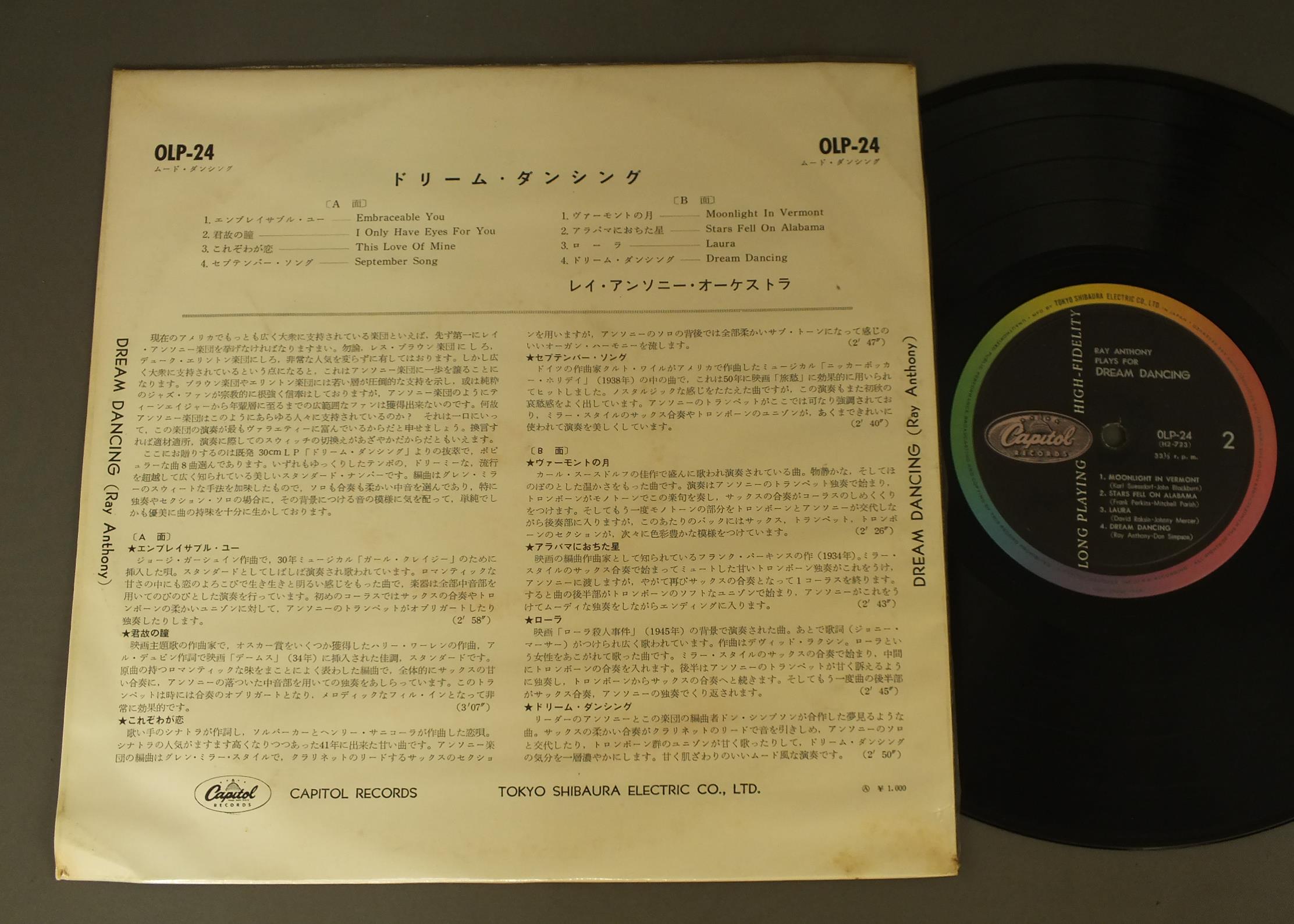 RAY ANTHONYレイ・アンソニー/DREAM DANCINGドリーム・ダンシング OLP24 製造国:日本盤 / Media:10inch外観:EX-盤の状態:EX- 価格(税込):¥660(売約済) 送料 7inch:定形外郵便 360円~LP:定形外郵便 660円~送料は、注文の最終画面で確認頂けます。 > > RAY ANTHONY/DREAM DANCING 外観 (EX-)特記事項:ジャケを覆っているビニールによごれやスリキズ。裏ジャケにシミ。外観EX-の共通説明:ダメージ軽度~多少。 中古品としては普通の状態。シミ、ヨゴレ、スレなど軽く~多少。 盤の状態 (EX-)特記事項:薄いスリキズ・細かい表面スレ軽くある感じ。全体的には殆どが軽微なものの様子です。盤EX-の共通説明:盤面のスリキズが多少有り。音に出そうなものは殆ど無いように見える~さほど気にならないぐらいの軽いプチ数カ所程度。 Tweet それぞれの画像をクリックすると、大きい写真が見られます こちらの商品もお勧めです 440円 SADAO WATANABE渡辺貞夫 / CALIFORNIA SHOWERカリフォルニア・シャワー 770円 CHARLIE PARKERチャーリー・パーカー / CHARLIE PARKER ON SAVOY VOL7チャーリー・パーカー・オン・サヴォイVOL7 770円 ANDREAS VOLLENWEIDERアンドレアス・フォーレンヴァイダー / WHITE WINDSホワイト・ウィンズ 990円 TAKEHIKO HONDA本田竹彦 / JODO浄土 770円 LOUIS ARMSTRONG & THE ALL-STARSルイ・アームストロングとオール・スターズ / SATCHMO ALL-STARS IN 1950サッチモ・オール・スターズ・イン 1950 990円 HOZAN YAMAMOTO山本邦山 / FYMN OF BUDDHA声明に挑む 770円 STANLEY CLARKE / JOURNEY TO LOVE 1,320円 JAMES LAST BANDジェームス・ラスト・バンド / SEDUCTIONセダクション