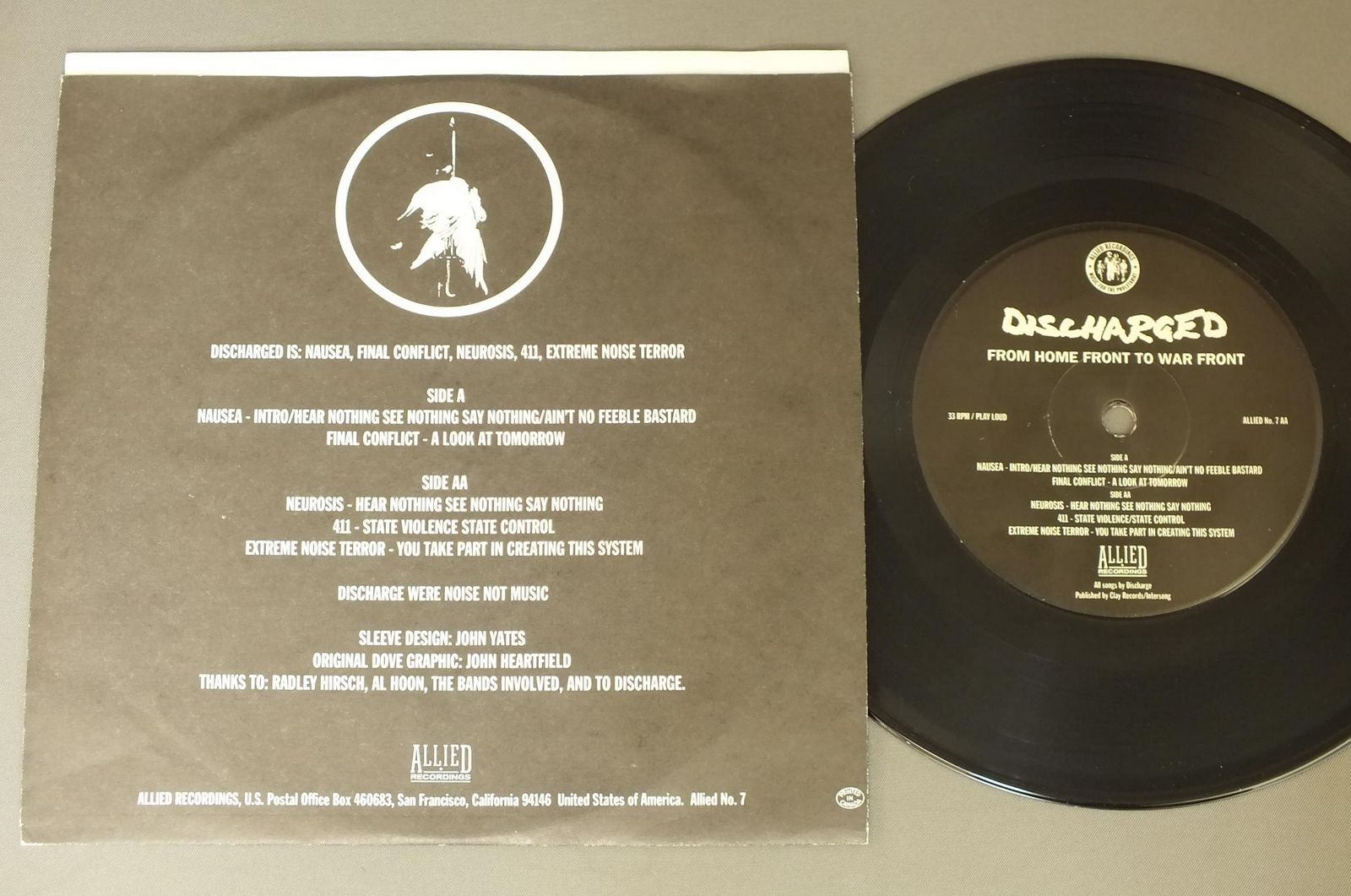 VARIOUS PUNK ARTISTS/DISCHARGED-FROM HOME TO WAR FRONT ALLIED7 製造国:米国盤 / Media:7inch外観:EX盤の状態:EX+ 価格(税込):¥770(売約済) 送料 7inch:定形外郵便 360円~LP:定形外郵便 660円~送料は、注文の最終画面で確認頂けます。 > > VARIOUS PUNK ARTISTS/DISCHARGED-FROM HOME TO WAR FRONT 外観 (EX)特記事項:角やヘリのスレ多少有りますが、ヨゴレはあまり無くきれいな感じ。外観EXの共通説明:ダメージが限定的。中古品としては保存状態がよい方。シミ、ヨゴレ、スレ 少し~軽度。 盤の状態 (EX+)特記事項:薄いスリキズ・スレ少し。一見してきれいな状態です。盤EX+の共通説明:盤面の極薄いスリキズ、スレ少し程度 音に出そうなものは無いように見える(極軽微なソフトティック音は除く)。 Tweet それぞれの画像をクリックすると、大きい写真が見られます こちらの商品もお勧めです 990円 KINGS OF OBLIVION / ALL THIS MADNESS 1,980円 CONFLICT / TURNING REBELLION INTO MONEY 770円 DUKES / DUKES 1,320円 STRAY CATS / GONNA BALL 1,650円 VARIOUS UK PUNK GROUPS / KIDS ARE UNITED 770円 DAVY JONES LOCKER / GREEN ALBUM 770円 NAME / DANGEROUS TIMES 770円 VARIOUS ARTISTS / HARDCORE BREAKOUT U.S.A