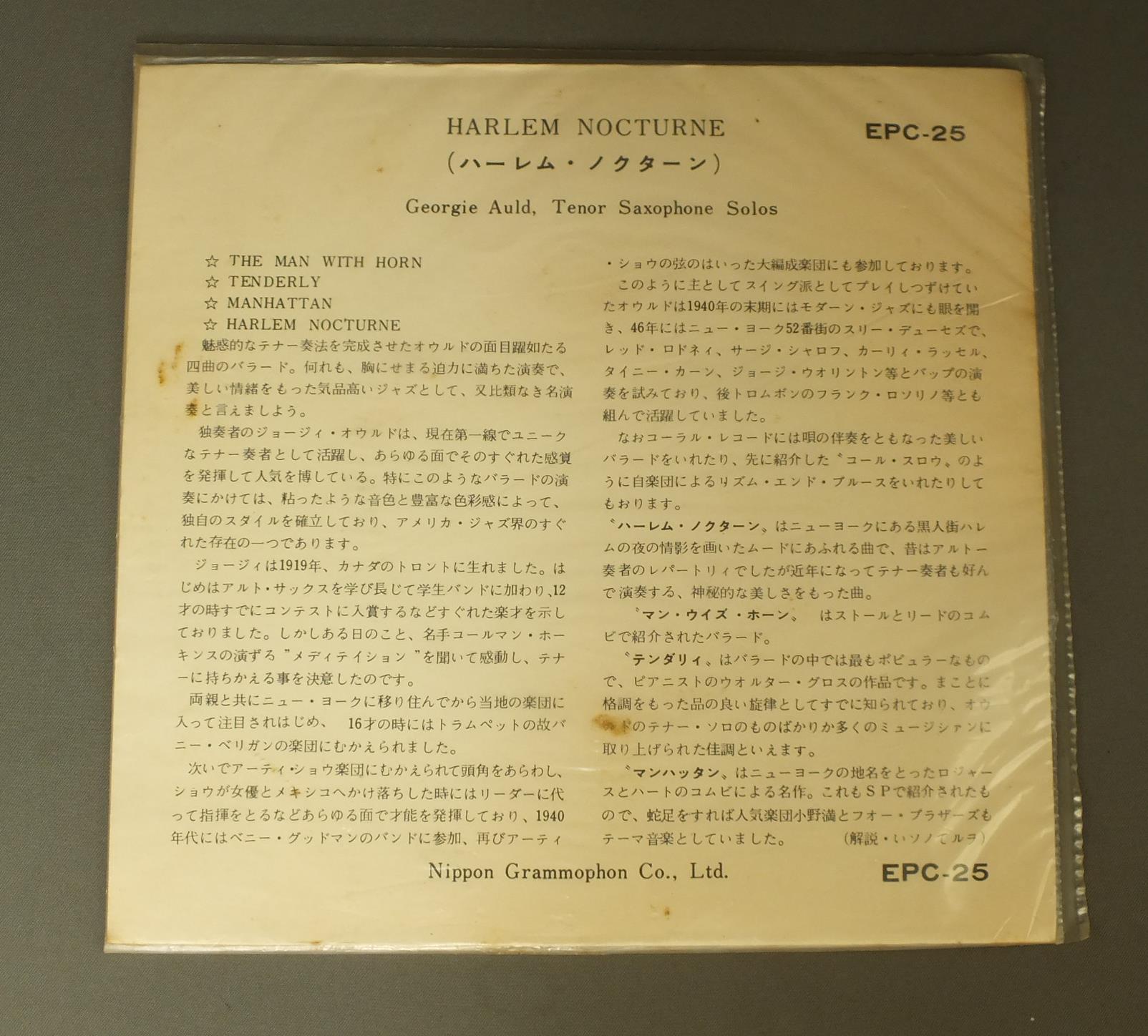 GEORGIE AULDジョージィ・オウルド/HARLEM NOCTURNEハーレム・ノクターン EPC25 製造国:日本盤 / Media:7inch外観:EX-盤の状態:EX 価格(税込):¥550(売約済) 送料 7inch:定形外郵便 360円~LP:定形外郵便 660円~送料は、注文の最終画面で確認頂けます。 > > GEORGIE AULD/HARLEM NOCTURNE 外観 (EX-)特記事項:背は、裏側のビニールが破れています。外観EX-の共通説明:ダメージ軽度~多少。 中古品としては普通の状態。シミ、ヨゴレ、スレなど軽く~多少。 盤の状態 (EX)特記事項:薄いスリキズ・スレ軽くある感じ。軽微なものの様子です。盤EXの共通説明:盤面のスリキズが薄いものが少し~軽度 音に出そうなものは無いように見える(軽微なソフトティック音は除く)。 Tweet それぞれの画像をクリックすると、大きい写真が見られます こちらの商品もお勧めです 1,210円 BUCK CLAYTON SEPTETバック・クレイトン / BUCKIN` THE BLUESバッキン・ザ・ブルース 1,210円 BINGO MIKI & INNER GALAXY ORCHESTRA三木敏悟&インナー・ギャラクシー・オーケストラ / EVE(EIGHT LETTERS)出航前夜-一通の手紙 1,210円 JAMES MOODYジェームス・ムーディ / EMARCY JAMES MOODY - THE COMPLETE MOODY STORYコンプリート・ジェームス・ムーディ・オン・エマーシー 770円 BRUBECK & LAVERNE TRIO / SEE HOW IT FEELS想いのままに 880円 JOE SULLIVAN-JESS STACY-WILLIE THE LION SMITH etcジョー・ブシュキン-ジェス・スティシー-ウィリーザ・ライオンスミス 他 / CHAIRMEN OF THE BOARD VOL2ピアノ・ジャズの競演 第2集 660円 SADAO WATANABE渡辺貞夫 / CALIFORNIA SHOWERカリフォルニア・シャワー 1,210円 ERROLL GARNERエロール・ガーナー / CONCERT BY THE SEACONCERT BY THE SEA 1,320円 JOE NEWMAN SEPTETジョー・ニューマン / MIDGETSミジェット