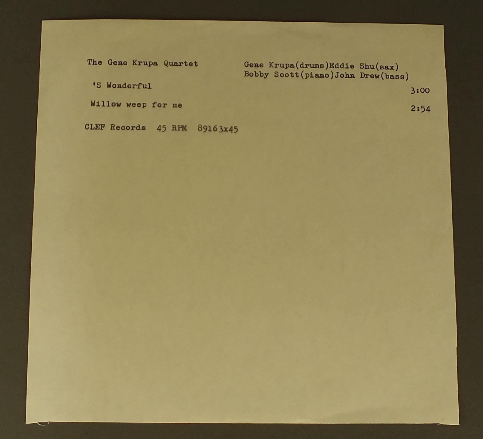 GENE KRUPA QUARTET/`S WONDERFUL 89163X45 製造国:米国盤 / Media:7inch外観:EX盤の状態:EX- 価格(税込):¥550(売約済) 送料 7inch:定形外郵便 360円~LP:定形外郵便 660円~送料は、注文の最終画面で確認頂けます。 > > GENE KRUPA QUARTET/`S WONDERFUL 外観 (EX)特記事項:表側はヨゴレが少々有りますが、きれいな感じです。歌詞カードは、ヨレ軽く有り。外観EXの共通説明:ダメージが限定的。中古品としては保存状態がよい方。シミ、ヨゴレ、スレ 少し~軽度。 盤の状態 (EX-)特記事項:薄いスリキズ・細かい表面スレ軽くある感じ。全体的には殆どが軽微なものの様子です。盤EX-の共通説明:盤面のスリキズが多少有り。音に出そうなものは殆ど無いように見える~さほど気にならないぐらいの軽いプチ数カ所程度。 Tweet それぞれの画像をクリックすると、大きい写真が見られます こちらの商品もお勧めです 770円 BOBBY HACKETT / AT THE EMBERS 1,100円 RIVERBOAT RAMBLERS / TAKE TEN +1 1,100円 DAVID AMRAM / DAVID AMRAM`S LATIN-JAZZ CELEBRATION 440円 EDDIE CONDON / SPIRIT OF CONDON 1,980円 MICHEL LEGLAND / AT SHELLY`S MANNE-HOLE 1,650円 MONGO SANTAMARIA / MONGOMANIA 770円 HANNA-FONTANA BAND / LIVE AT CONCORD 550円 DOWN TOWN JAZZ BAND / DIXIELAND FESTIVAL