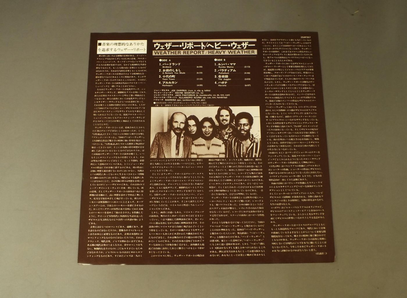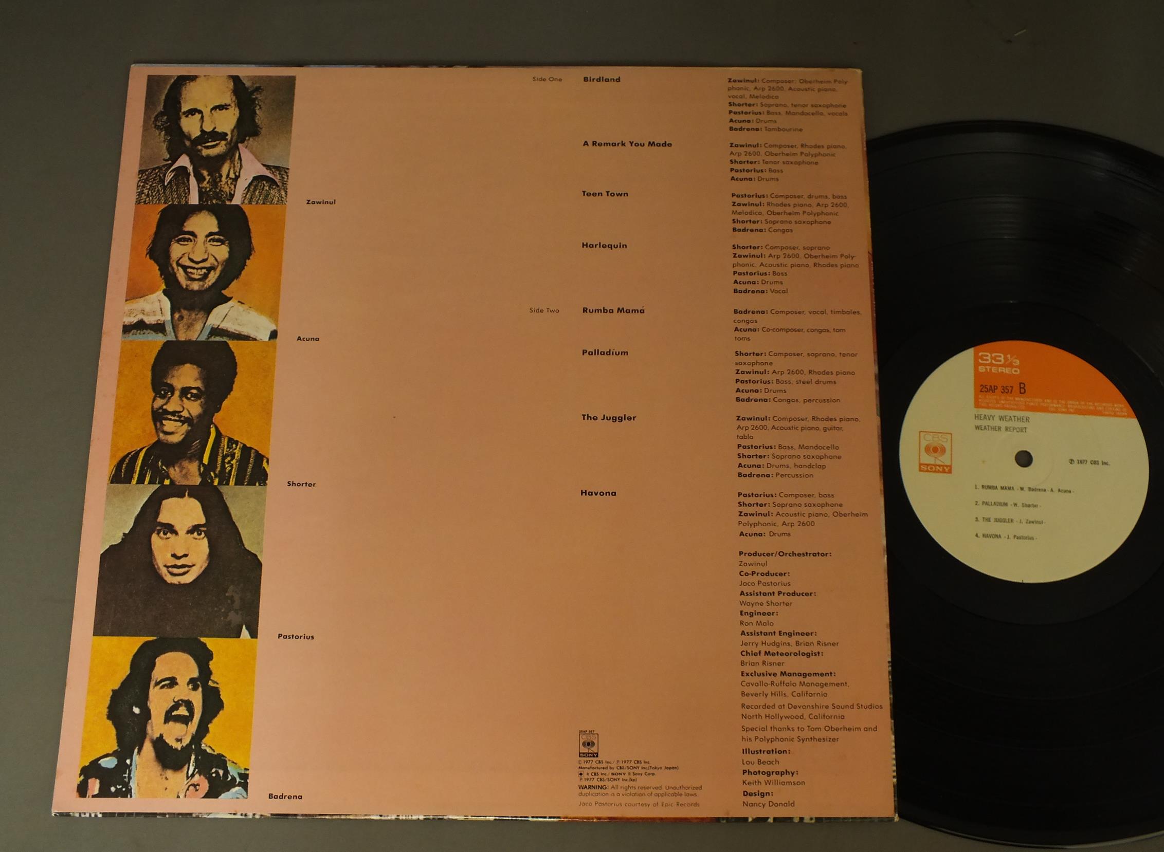 WEATHER REPORTウェザー・レポート/HEAVY WEATHERヘビー・ウェザー 25AP357 製造国:日本盤 / Media:LP外観:EX盤の状態:EX+ 価格(税込):¥1,100(売約済) 送料 7inch:定形外郵便 360円~LP:定形外郵便 660円~送料は、注文の最終画面で確認頂けます。 > > WEATHER REPORT/HEAVY WEATHER 外観 (EX)特記事項:ジャケ表面にシミ、よごれ有。外観EXの共通説明:ダメージが限定的。中古品としては保存状態がよい方。シミ、ヨゴレ、スレ 少し~軽度。 盤の状態 (EX+)特記事項:極薄いスリキズ・スレ少し。一見してきれいな状態です。盤EX+の共通説明:盤面の極薄いスリキズ、スレ少し程度 音に出そうなものは無いように見える(極軽微なソフトティック音は除く)。 Tweet それぞれの画像をクリックすると、大きい写真が見られます こちらの商品もお勧めです 1,210円 BUCK CLAYTON SEPTETバック・クレイトン / BUCKIN`THE BLUESバッキン・ザ・ブルース 880円 EUGENE CICEROオイゲン・キケロ / 3 GREAT ARTISTSスリー・グレイト・アーティスト 1,210円 JACQUES LOUSSIERジャック・ルーシエ / GOLDEN PLAYS BACH DOUBLE DELUXEゴールデン・プレイ・バッハ - ダブル・デラックス 1,210円 RED NICHOLS & HIS FIVE PENNIESレッド・ニコルスとファイブ・ペニーズ / RED NICHOLS STORYレッド・ニコルス物語 660円 EDDIE CONDONエディ・コンドン / CONDON A LA CARTEコンドン・ア・ラ・カルト 770円 TEDDY WILSONテディ・ウイルソン / NOBLE ART OF TEDDY WILSONノーブル・アート・オブ・テディ・ウイルソン 990円 FORCEフォース / SECOND FORCEセカンド・フォース 440円 SADAO WATANABE渡辺貞夫 / CALIFORNIA SHOWERカリフォルニア・シャワー