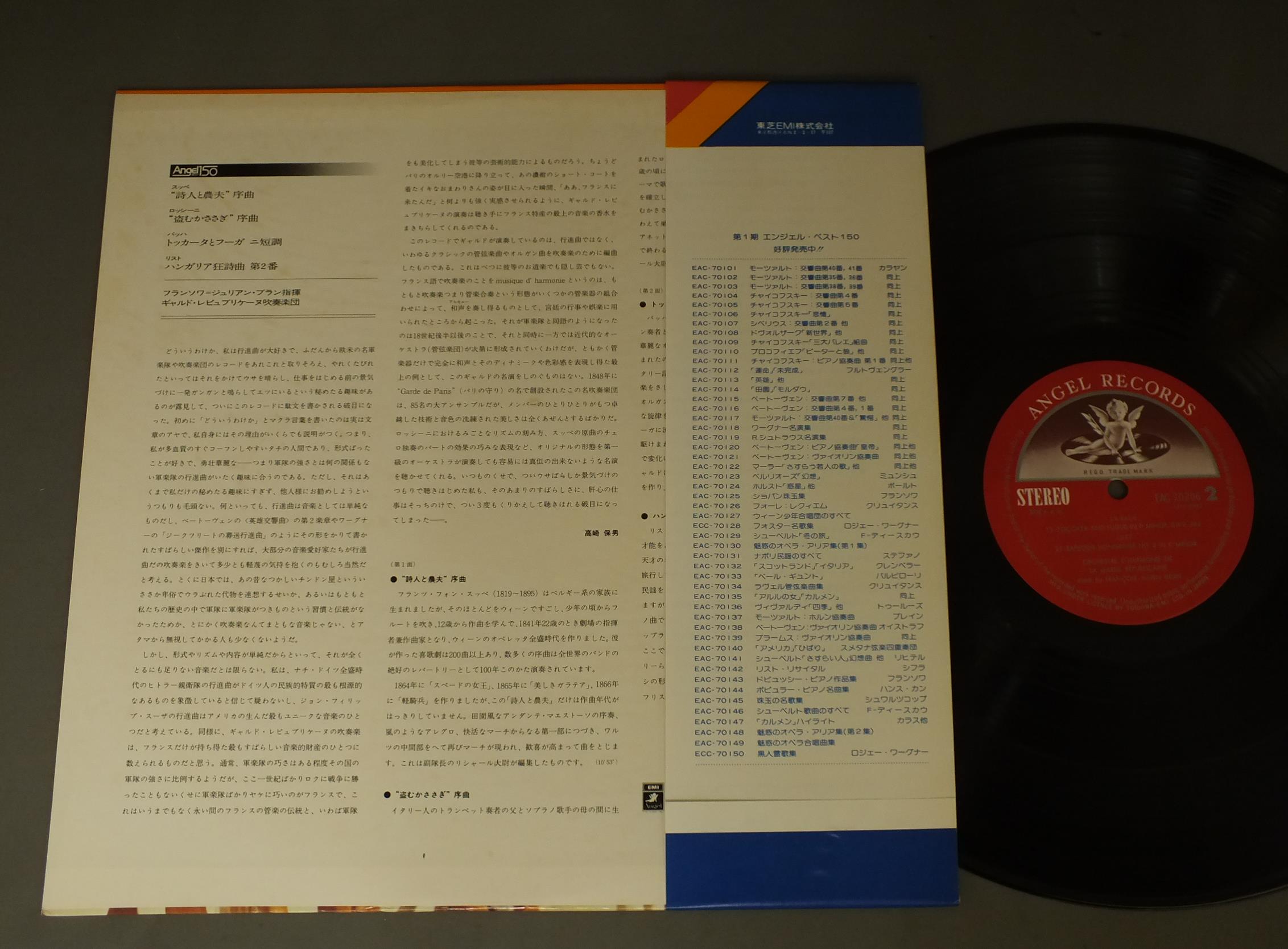 F.J. BRUNフランソワ=ジュリアン・ブラン/SUPPE: -POET AND PEASANTスッペ: 詩人と農夫 序曲 他 EAC70206 製造国:日本盤 / Media:LP外観:EX-盤の状態:EX+ 価格(税込):¥990(売約済) 送料 7inch:定形外郵便 360円~LP:定形外郵便 660円~送料は、注文の最終画面で確認頂けます。 > > F.J. BRUN/SUPPE: -POET AND PEASANT 外観 (EX-)特記事項:裏ジャケにシミ、よごれ有。外観EX-の共通説明:ダメージ軽度~多少。 中古品としては普通の状態。シミ、ヨゴレ、スレなど軽く~多少。 盤の状態 (EX+)特記事項:極薄いスリキズ・スレ少し。一見してきれいな状態です。盤EX+の共通説明:盤面の極薄いスリキズ、スレ少し程度 音に出そうなものは無いように見える(極軽微なソフトティック音は除く)。 帯の状態 ():特記なし。 Tweet それぞれの画像をクリックすると、大きい写真が見られます こちらの商品もお勧めです 1,980円 CAPEケープ / LA HALLE - LE JEU DE ROBIN ET-MARION 13 RONDEAUX etcラ・アーレ - ロバンとマリオンの愛の戯れ 十三のロンド 他 990円 MICHIO MAMIYA間宮芳生 / DEUX TABLEAUX POUR ORCHESTREオーケストラのための2つのタブロー 990円 HUBEAU - MERCKEL - TORTELIERユボー - マルケル - トルトゥリエ / SCHUMANN - TRIO NO1 &3シューマン - ピアノ3重奏曲 990円 FRANCOIS GLORIEUXフランソワ・グロリュー / FRANCOIS GLORIEUX PLAYS THE BEATLES驚異の才人 グロリュー-ビートルズを弾く 990円 MATOVANI AND HIS ORCH.マントヴァーニ管弦楽団 / STRAUSS WALTZESシュトラウス・ワルツ・アルバム 990円 BERNSTEIN etc.中村絋子と大町陽一郎 / NEW BEST CLASSICS 150楽しい音楽談義による名曲ガイダンス 770円 フィルハーモニア・ウインド・アンサンブル他 / BAND MUSIC GUIDANCE VOL.2-ORIGINAL REPERTORIE BEST 100-吹奏楽名曲ガイドVOL.2 オリジナル・レパートリー・ベスト100 1,870円 RATIA & MARIELLE LABEQUEラベック姉妹 / STRAVINSKY - CONC. FOR TWO PIANOSペルトーシュカ