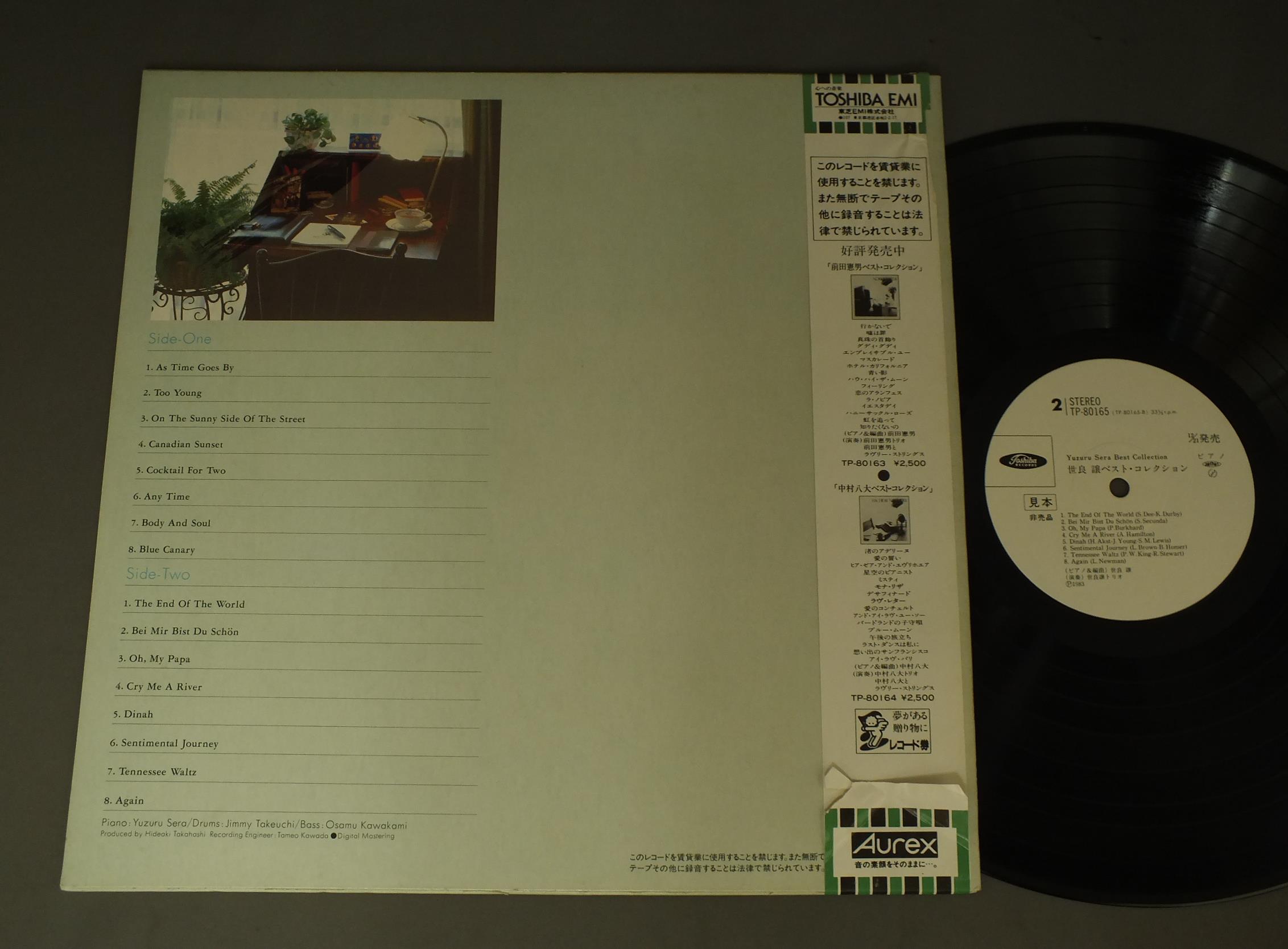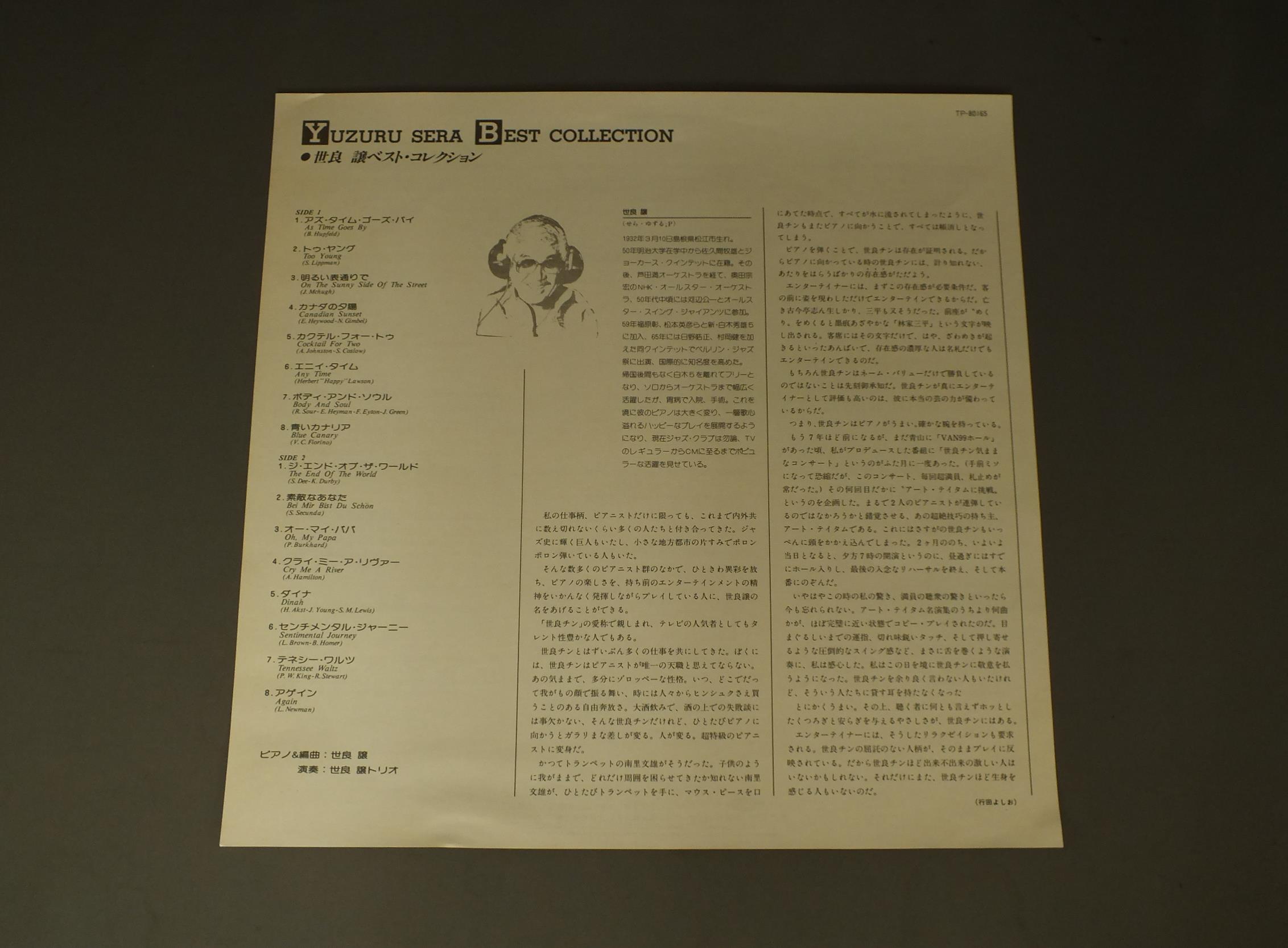 YUZURU SERA世良 譲トリオ/YUZURU SERA BEST COLLECTION世良 譲ベスト・コレクション TP80165 製造国:日本盤 / Media:LP外観:EX盤の状態:EX帯:EX- 価格(税込):¥1,100(売約済) 送料 7inch:定形外郵便 360円~LP:定形外郵便 660円~送料は、注文の最終画面で確認頂けます。 > > YUZURU SERA/YUZURU SERA BEST COLLECTION 外観 (EX)特記事項:ジャケ表面にシミ有。外観EXの共通説明:ダメージが限定的。中古品としては保存状態がよい方。シミ、ヨゴレ、スレ 少し~軽度。 盤の状態 (EX)特記事項:薄いスリキズ・スレ少しある感じ。一見してきれいな感じです。盤EXの共通説明:盤面のスリキズが薄いものが少し~軽度 音に出そうなものは無いように見える(軽微なソフトティック音は除く)。 帯の状態 (EX-):裏の折り返しに破れやヨレ その他:白見本盤 Tweet それぞれの画像をクリックすると、大きい写真が見られます こちらの商品もお勧めです 990円 MILT JACKSON/RAY BROWN JAMミルト・ジャクソン&レイ・ブラウン / MONTREUX`77ミルト・ジャクソン&レイ・ブラウン・ジャム・アット・モントゥルー`77 990円 MODERN JAZZ QUARTETモダン・ジャズ・カルテット / TOGETHER AGAINトゥゲザー・アゲイン 1,320円 SHIRO MICHI道志郎 / WONDERFUL WORLD OF ELECTONEエレクトーンの驚異 990円 CHARLIE PARKERチャーリー・パーカー / CHARLIE PARKER ON SAVOY VOL6チャーリー・パーカー・オン・サヴォイVOL6 660円 EDDIE CONDONエディ・コンドン / CONDON A LA CARTEコンドン・ア・ラ・カルト 770円 ENSEMBLE NIPPONIA日本音楽集団 / WORKS OF KATSUTOSHI NAGASAWA (HOSHUN)長澤勝俊作品集萌春 770円 KAI WINDING & J.J.JOHNSONケイ・ウィンディング5重奏団 + J.J.ジョンソン / AFTERNOON AT BIRDLANDバードランドのJ & K 1,320円 GREAT JAZZ TRIOグレート・ジャズ・トリオ / AT THE VILLAGE VANGUARD VOL2アット・ザ・ヴィレッジ・ヴァンガードVOL2