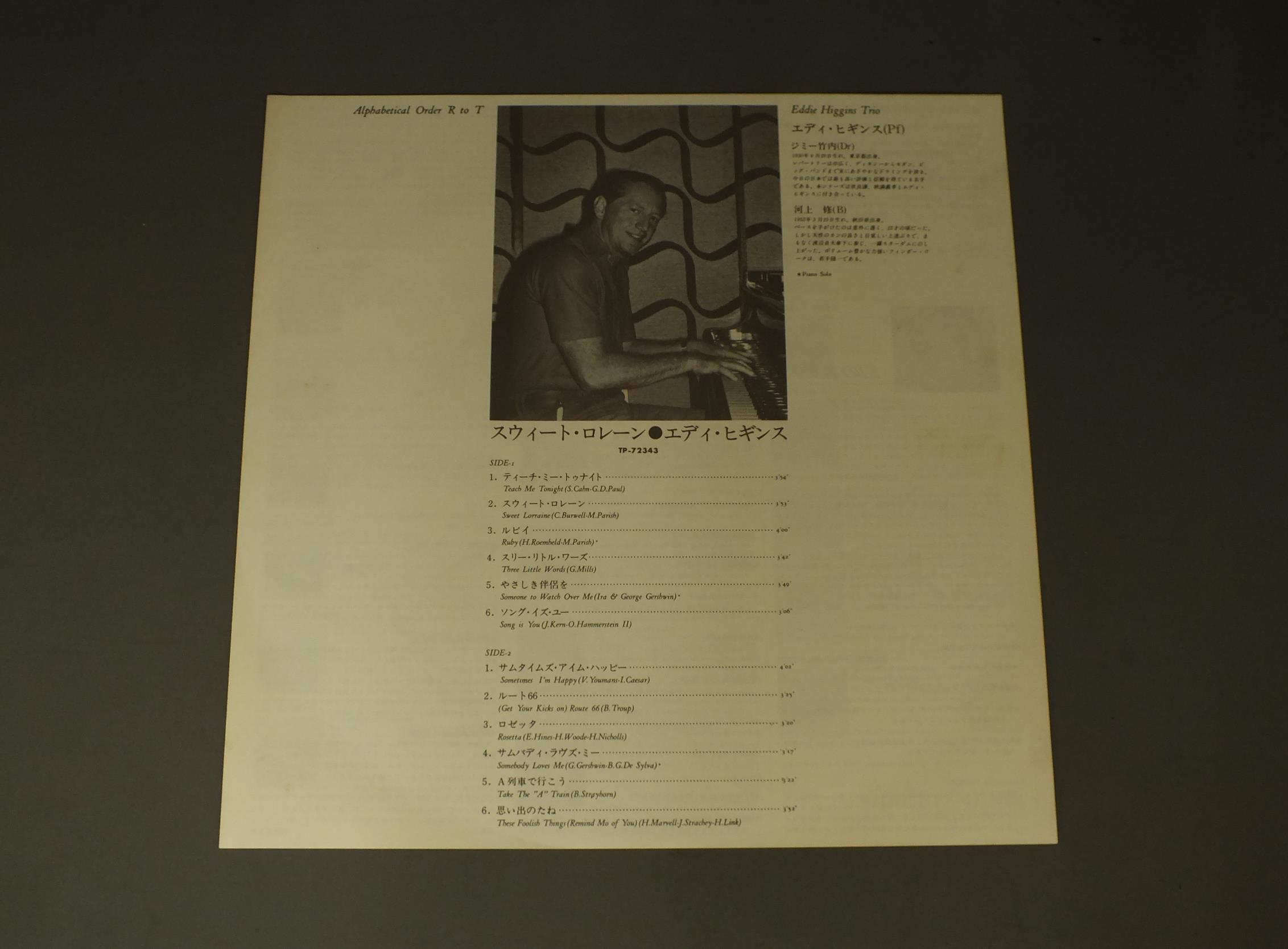 EDDIE HIGGINSエディ・ヒギンス/SWEET LORRAINEスウィート・ロレーン TP72343 製造国:日本盤 / Media:LP外観:EX盤の状態:EX帯:EX- 価格(税込):¥1,320(売約済) 送料 7inch:定形外郵便 360円~LP:定形外郵便 660円~送料は、注文の最終画面で確認頂けます。 > > EDDIE HIGGINS/SWEET LORRAINE 外観 (EX)特記事項:特記なし。外観EXの共通説明:ダメージが限定的。中古品としては保存状態がよい方。シミ、ヨゴレ、スレ 少し~軽度。 盤の状態 (EX)特記事項:薄いスリキズ・スレ軽くある感じ。軽微なものの様子です。盤EXの共通説明:盤面のスリキズが薄いものが少し~軽度 音に出そうなものは無いように見える(軽微なソフトティック音は除く)。 帯の状態 (EX-):裏の折り返しに破れやヨレ その他:白見本盤 Tweet それぞれの画像をクリックすると、大きい写真が見られます こちらの商品もお勧めです 990円 TAL FARLOWタル・ファーロウ / SWINGINNG GUITARスウィンギング・ギター 1,320円 THE JOHN BUNCH QUINTETジョン・バンチ / JONE`S OTHER BUNCHジョンズ・アザー・バンチ 1,210円 ESQUIRE ALL STARS etc / FLYIN` ON A V-DISC (V-DISC ALL STAR JAZZ SESSIONS VOL2)フライン・オン・ア・Vディスク (Vディスク・オールスターズ第2集) 990円 JOSHUA RIFKINジョシュア・リフキン / PIANO RAGS BY SCOTT JOPLINスコット・ジョプリンの芸術 770円 SINGERS UNLIMITEDシンガーズ・アンリミテッド / CAPELLAア・カペラ 2,640円 EDDIE CONDON ALL STARSエディ・コンドン・オール・スターズ / EDDIE CONDON ALL STARS 1944 5LP BOX SETエディ・コンドン・オール・スターズ1944 5枚組 770円 SADAO WATANABE渡辺貞夫 / MY DEAR LIFEマイ・ディア・ライフ 1,320円 BUD POWELLバド・パウエル / BUD POWELL TRIOバド・パウエル トリオ