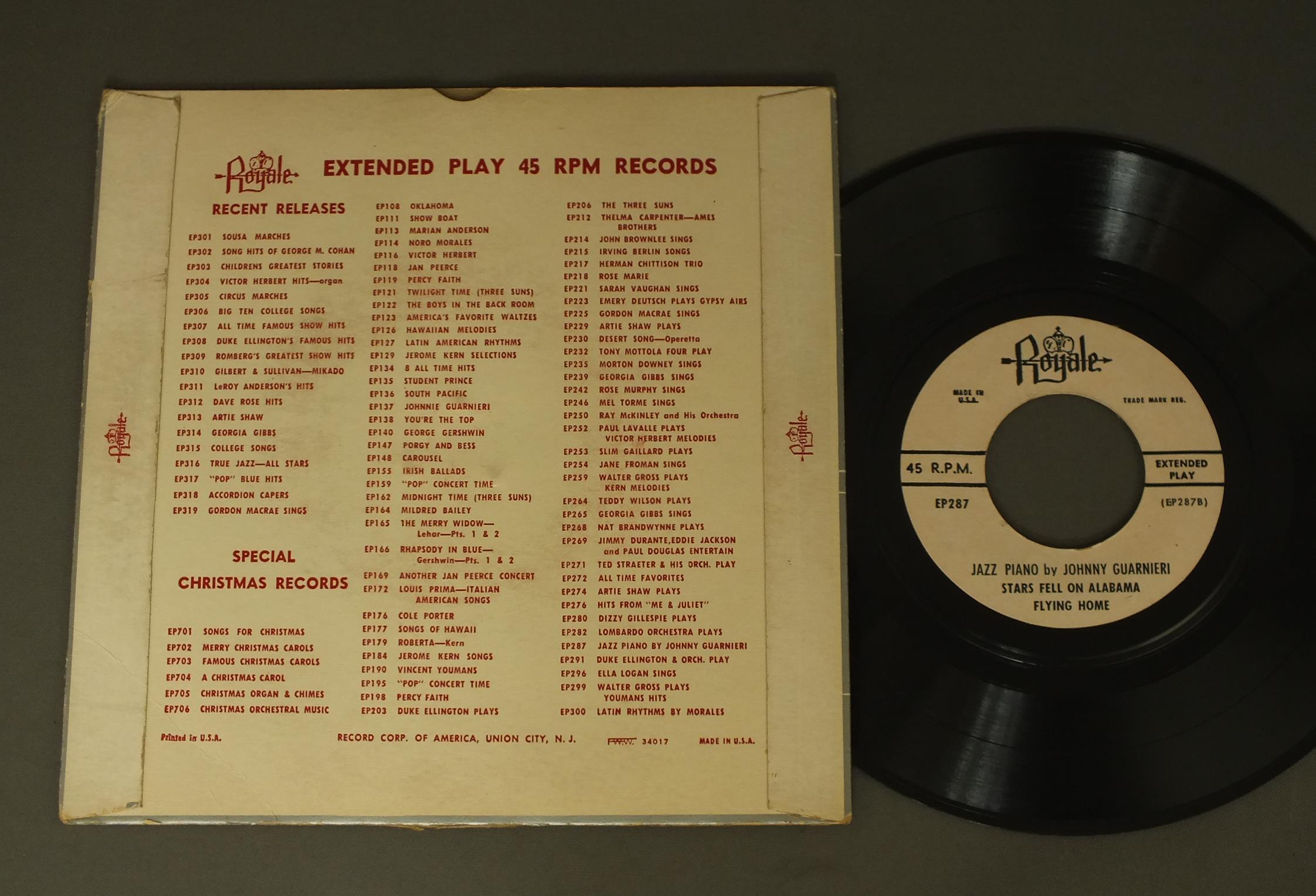 JOHNNIE GUARNIERI/JAZZ PIANO EP EP287 製造国:米国盤 / Media:7inch外観:VG+盤の状態:EX- 価格(税込):¥1,320(売約済) 送料 7inch:定形外郵便 360円~LP:定形外郵便 660円~送料は、注文の最終画面で確認頂けます。 > > JOHNNIE GUARNIERI/JAZZ PIANO EP 外観 (VG+)特記事項:角やヘリのスレ大。背抜けやや有り。表側は、スレやヨレ多少有ります。外観VG+の共通説明:ダメージやや有り。シミ、ヨゴレ、スレなど多少~やや多め。 盤の状態 (EX-)特記事項:薄いスリキズ・細かい表面スレ軽くある感じです。プチ出そうな所は少し。軽微なものが中心の様子です。盤EX-の共通説明:盤面のスリキズが多少有り。音に出そうなものは殆ど無いように見える~さほど気にならないぐらいの軽いプチ数カ所程度。 Tweet それぞれの画像をクリックすると、大きい写真が見られます こちらの商品もお勧めです 770円 RED RICHARDS / I`M SHOOTING HIGH 1,650円 MODAN JAZZ QUARTET / THE SHERIFF 1,320円 PHOENIX JAZZERS WITH BOB PELLAND / REVIVAL! 880円 PAUL RENARD / MANY KEYBOARDS OF THE AMAZING PAUL RENARD 770円 GUY LOMBARDO / PRESENTS KENNY GARDNER 1,650円 BILLY BYERS`BIG BAND / TAKE THE DUKE`S TRAIN 440円 WOODY HERMAN AND ALLAN JONES / 1944 OCT & 1946 1,210円 BOBBY HACKETT / BUTTERFLY AIRS VOLUME 1 SIR CHARLES AUTOGRAPHEDSIR CHARLESサイン付