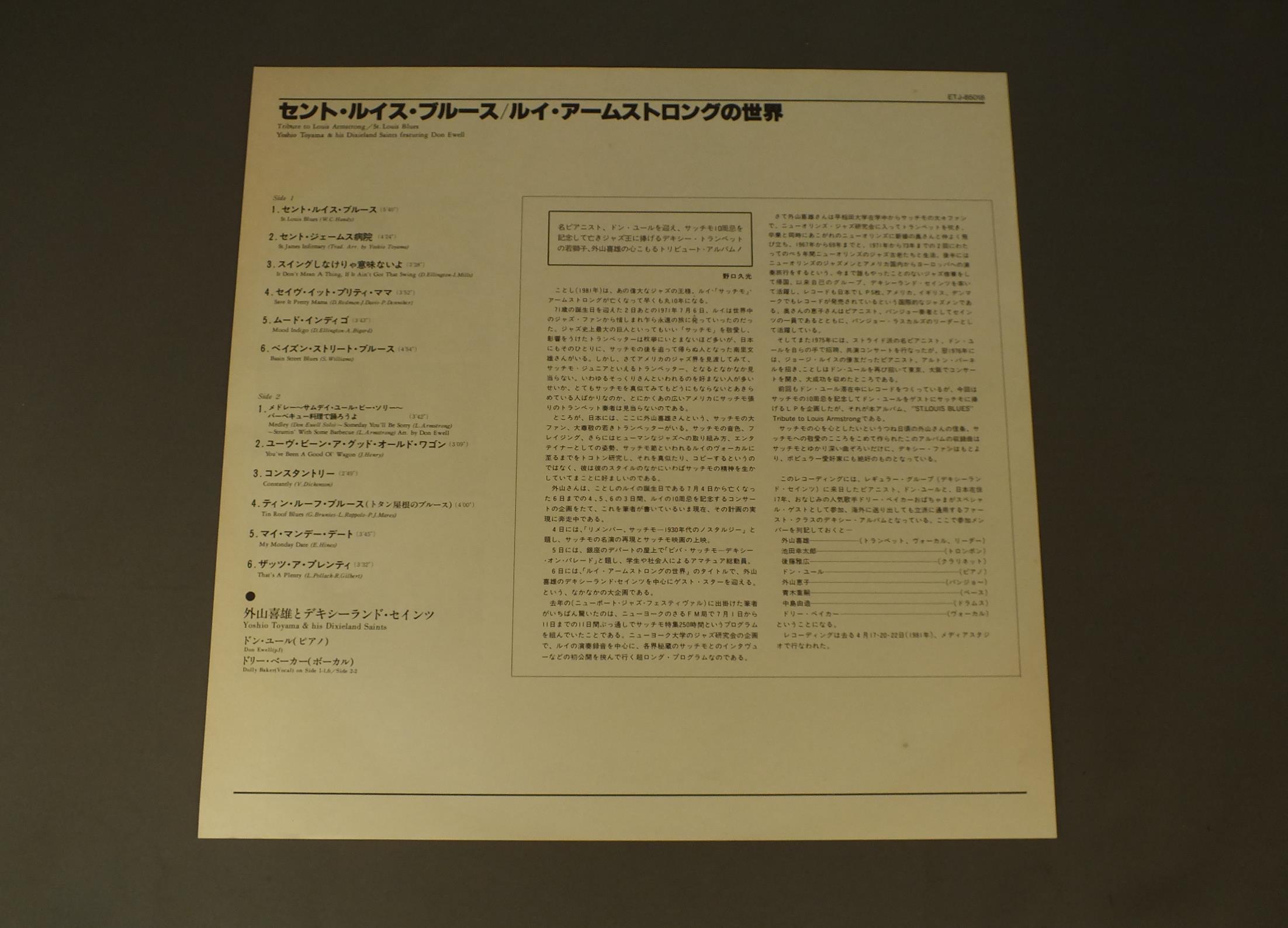 YOSHIO TOYAMA外山喜雄/ST.LOUIS BLUESセント・ルイス・ブルース ETJ85018 製造国:日本盤 / Media:LP外観:EX盤の状態:EX+ 価格(税込):¥1,650(売約済) 送料 7inch:定形外郵便 360円~LP:定形外郵便 660円~送料は、注文の最終画面で確認頂けます。 > > YOSHIO TOYAMA/ST.LOUIS BLUES 外観 (EX)特記事項:背や上ヘリ付近に日焼けシミ。ジャケ表面にスレやよごれ多少有り。外観EXの共通説明:ダメージが限定的。中古品としては保存状態がよい方。シミ、ヨゴレ、スレ 少し~軽度。 盤の状態 (EX+)特記事項:極薄いスリキズ・スレ少し。一見してきれいな状態です。盤EX+の共通説明:盤面の極薄いスリキズ、スレ少し程度 音に出そうなものは無いように見える(極軽微なソフトティック音は除く)。 帯の状態 ():特記なし。 その他:白見本盤 Tweet それぞれの画像をクリックすると、大きい写真が見られます こちらの商品もお勧めです 770円 STANLEY CLARKE / JOURNEY TO LOVE 880円 WILTON FELDERウイルトン・フェルダー / WE ALL HAVE A STAR星の伝説 990円 FRANCES FAYEフランセス・フェイ / CAUGHT IN THE ACTコート・イン・ジ・アクト 1,210円 MAKOTO OZONE小曽根真 / AFTERアフター 1,210円 BUD POWELL TRIOバド・パウエル・トリオ / ROOST SESSION BEST 6-VOL.1バド・パウエルの芸術 1,210円 DUKE ELLINGTON WITH JIMMY JONESデューク・エリントン & ジミー・ジョーンズ / DUKE ELLINGTON`S MY PEOPLEマイ・ピープル 880円 NEWPORT ALL STARSニューポート・オールスターズ / TRIBUTE TO DUKE ( LIVE IN BASEL SWISS 1969 OCT )デューク・エリントンに捧ぐ 990円 PETER SPRAGUEピーター・スプラッチ / MUSICA DEL MARムジカ・デル・マール