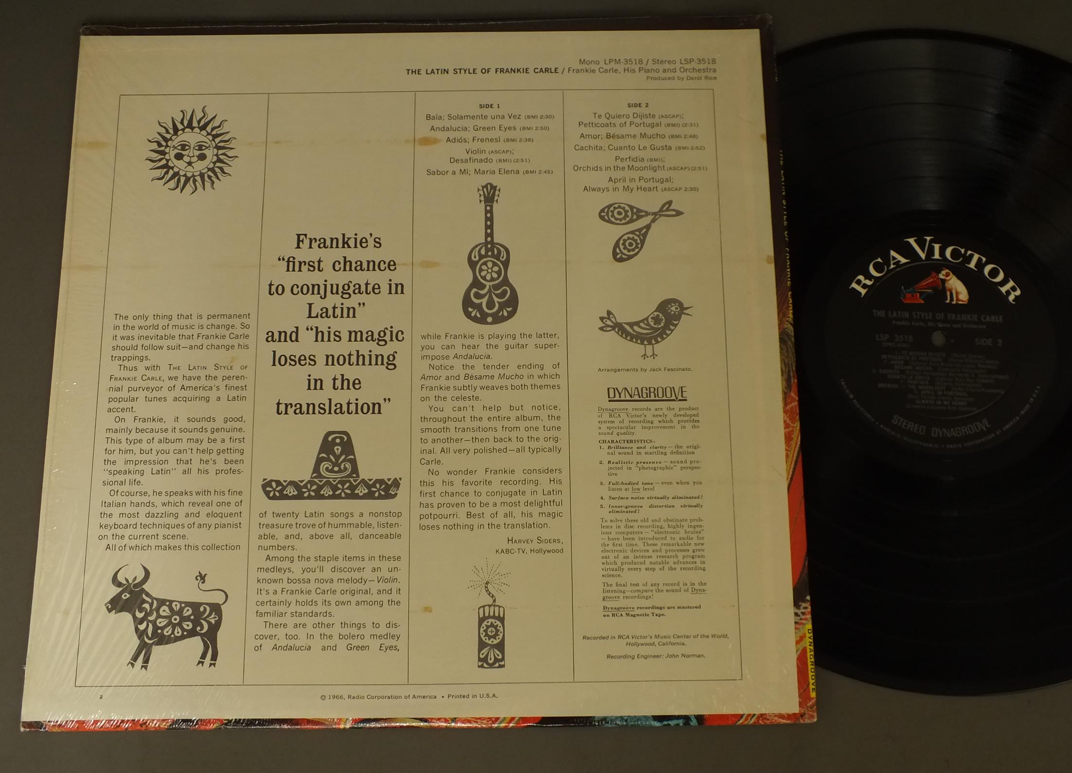 FRANKIE CARLE/LATIN STYLE OF FRANKIE CARLE LSP3518 製造国:米国盤 / Media:LP外観:EX盤の状態:EX- 価格(税込):¥1,100(売約済) 送料 7inch:定形外郵便 360円~LP:定形外郵便 660円~送料は、注文の最終画面で確認頂けます。 > > FRANKIE CARLE/LATIN STYLE OF FRANKIE CARLE 外観 (EX)特記事項:特記なし。外観EXの共通説明:ダメージが限定的。中古品としては保存状態がよい方。シミ、ヨゴレ、スレ 少し~軽度。 盤の状態 (EX-)特記事項:薄いスリキズ・細かい表面スレ軽くある感じです。プチ出そうな所は少し。軽微なものが中心の様子です。盤EX-の共通説明:盤面のスリキズが多少有り。音に出そうなものは殆ど無いように見える~さほど気にならないぐらいの軽いプチ数カ所程度。 Tweet それぞれの画像をクリックすると、大きい写真が見られます こちらの商品もお勧めです 770円 ALFRED NEWMAN / LOVE SCENES 990円 SUSAN MAZER - STEVEN HALPERN - DALLAS SMITH / LIFETIDE 770円 CLAUDE BLOUIN / BALLROOM DANCIHG