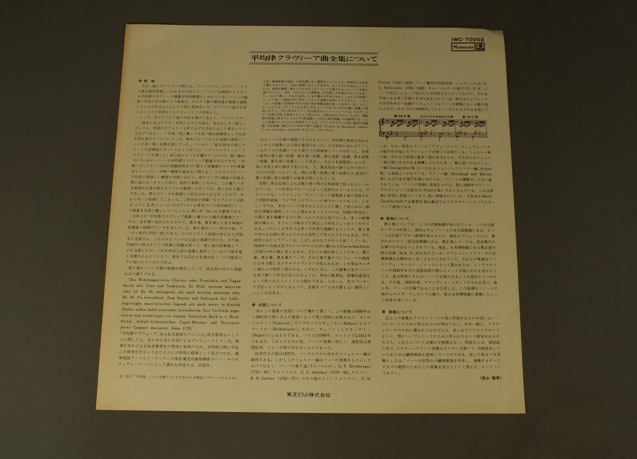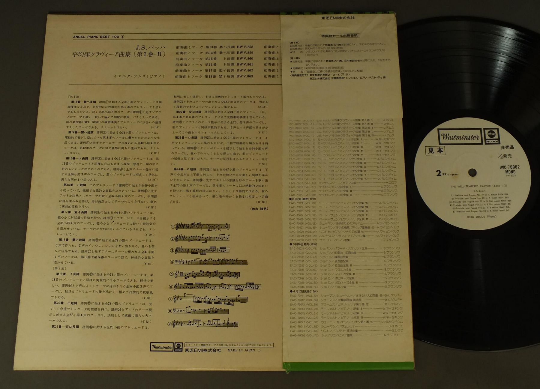 DEMUSデムス/BACH/WELL-TEMPERED CLAVIER(BOOK1-2)バッハ/平均律クラヴィーア曲集(第1巻その2) IWC70002 製造国:日本盤 / Media:LP外観:EX-盤の状態:EX+帯:EX- 価格(税込):¥1,100(売約済) 送料 7inch:定形外郵便 360円~LP:定形外郵便 660円~送料は、注文の最終画面で確認頂けます。 > > DEMUS/BACH/WELL-TEMPERED CLAVIER(BOOK1-2) 外観 (EX-)特記事項:ジャケ表面にシミ、よごれ有。外観EX-の共通説明:ダメージ軽度~多少。 中古品としては普通の状態。シミ、ヨゴレ、スレなど軽く~多少。 盤の状態 (EX+)特記事項:極薄いスリキズ・スレ少し。一見してきれいな状態です。盤EX+の共通説明:盤面の極薄いスリキズ、スレ少し程度 音に出そうなものは無いように見える(極軽微なソフトティック音は除く)。 帯の状態 (EX-):切れ、やぶれ有。ヨレ有。シミ有。 その他:白見本盤 Tweet それぞれの画像をクリックすると、大きい写真が見られます こちらの商品もお勧めです 990円 RENA KYRIAKOUレナ・キリアコウ / MENDELLSSOHN - PIANO MUSIC VOL4メンデルスゾーン - ピアノ曲全集第4集 990円 HOROWITZホロヴィッツ / CHOPIN 2ショパン 990円 FEBIAN REZA PANE フェビアン・レザ・パネ / SKETCH OF SPAINスケッチ・オブ・スペイン 1,320円 CLAUDIO ARRAUクラウディオ・アラウ / CHOPIN - PRELUDESプレリュード作品28 770円 BERMANベルマン / PLAYS LISZTリスト・リサイタル 990円 MARIE-CLAIRE JAMETマリー=クレール・ジャメ / LIVRE D`OR DE LA HARPEハープ・リサイタル 990円 WALTER KLIENワルター・クリーン / MOZART - THREE PIANO SONATASモーツァルト - 三大ピアノ・ソナタ 990円 BERMANベルマン / SCHUMANN - PIANO SONATA NO1シューマン - ピアノ ソナタ第1番