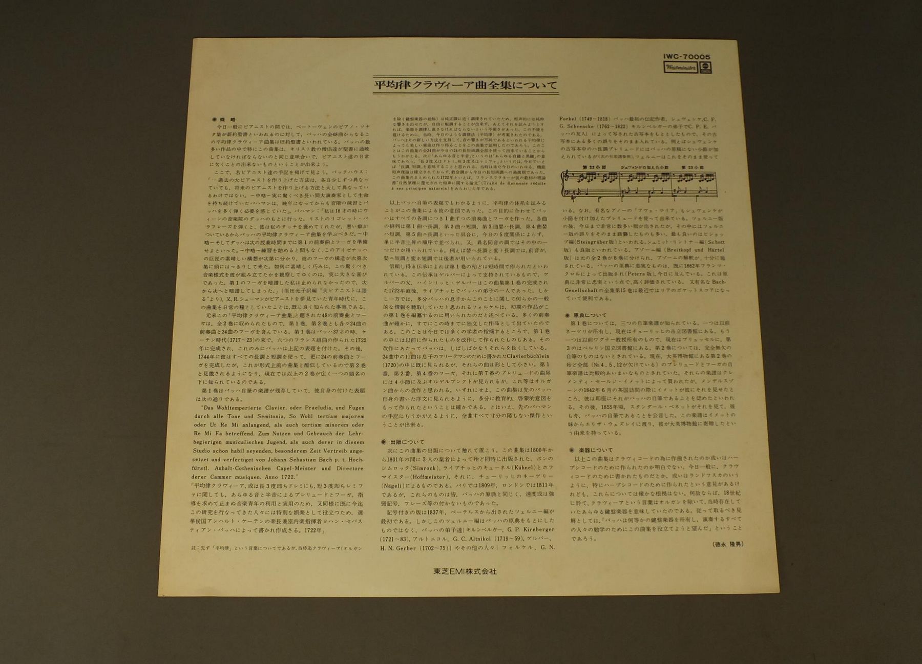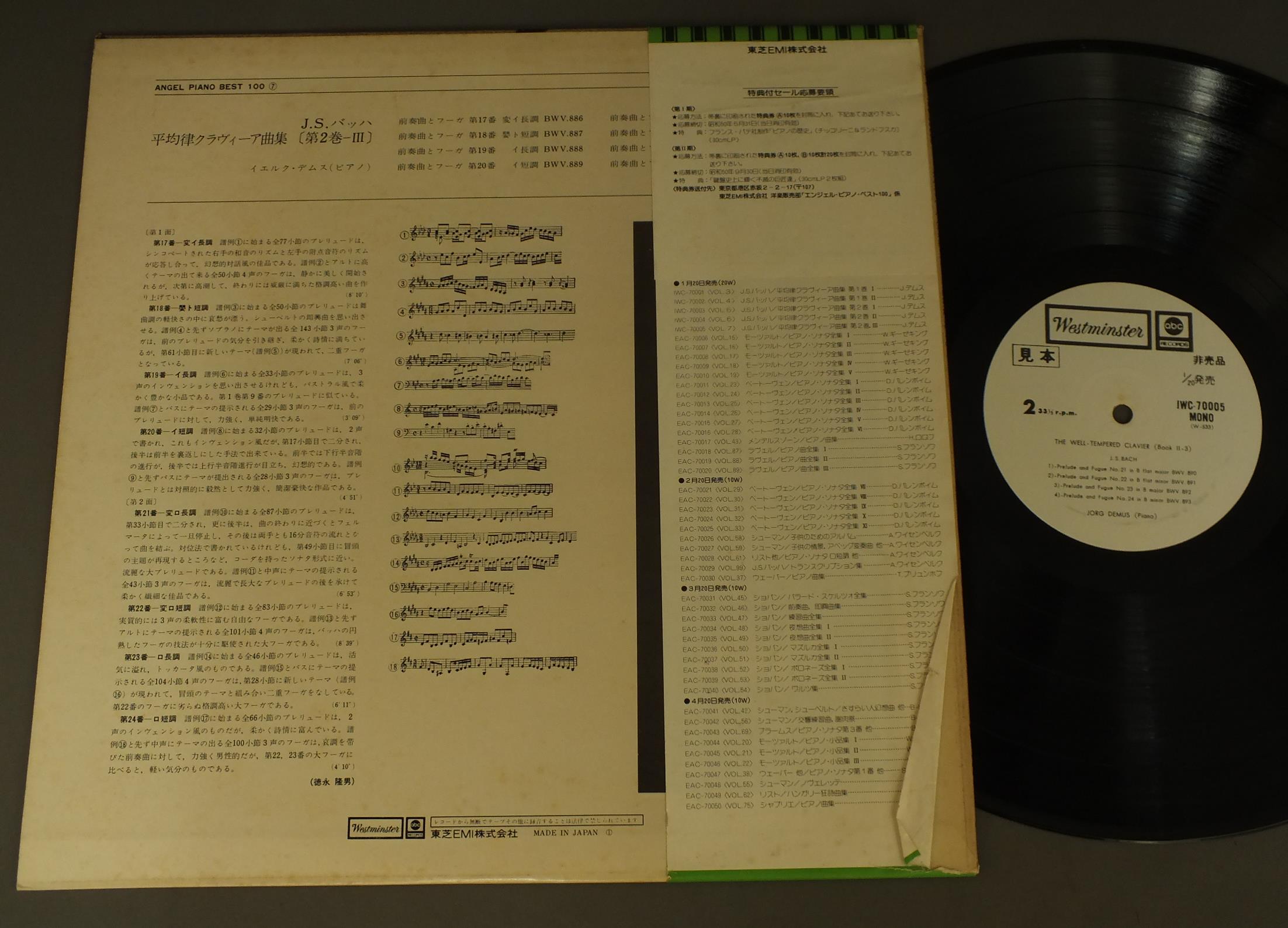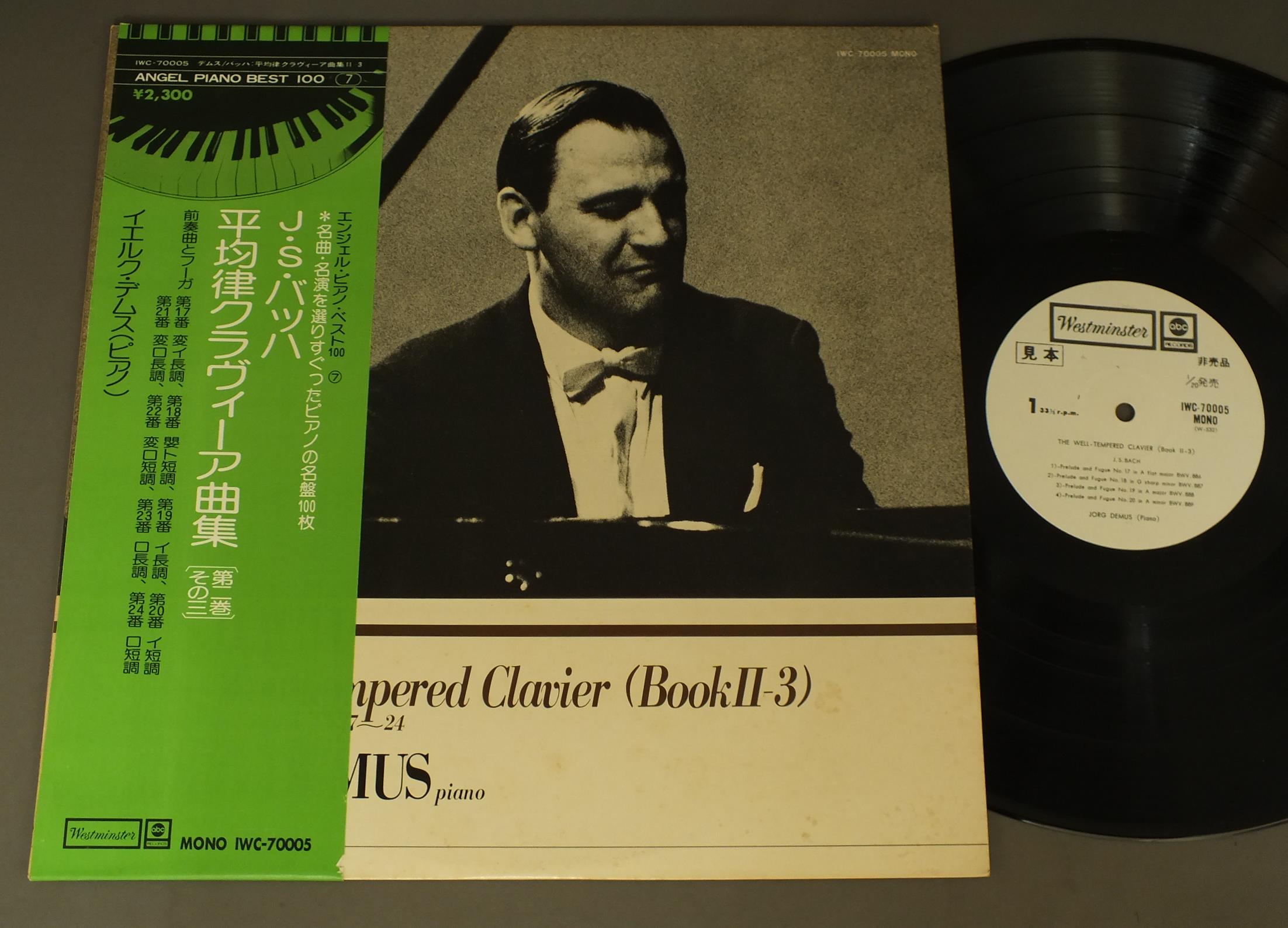 DEMUSデムス/BACH/WELL-TEMPERED CLAVIER(BOOK2-3)バッハ/平均律クラヴィーア曲集(第2巻その3) IWC70005 製造国:日本盤 / Media:LP外観:EX-盤の状態:EX帯:EX- 価格(税込):¥1,100(売約済) 送料 7inch:定形外郵便 360円~LP:定形外郵便 660円~送料は、注文の最終画面で確認頂けます。 > > DEMUS/BACH/WELL-TEMPERED CLAVIER(BOOK2-3) 外観 (EX-)特記事項:ジャケ表面にシミ、よごれ有。外観EX-の共通説明:ダメージ軽度~多少。 中古品としては普通の状態。シミ、ヨゴレ、スレなど軽く~多少。 盤の状態 (EX)特記事項:薄いスリキズ・スレ少しある感じ。一見してきれいな感じです。盤EXの共通説明:盤面のスリキズが薄いものが少し~軽度 音に出そうなものは無いように見える(軽微なソフトティック音は除く)。 帯の状態 (EX-):切れ、やぶれ有。ヨレ有。シミ有。 その他:白見本盤 Tweet それぞれの画像をクリックすると、大きい写真が見られます こちらの商品もお勧めです 990円 GRUMIAUXグリュミオー / ARTHUR GRUMIAUX RECITALベスト・アルバム 990円 KEMPFFケンプ / BEETHOVEN - 3 PIANO SONATASベートーヴェン - ピアノ奏鳴曲 (三曲)- 悲愴- 月光- 熱情 770円 RUBINSTEIN - RACHMANINOFF - RHAPSODY ON A THEME OF PAGANINIルービンシュタイン / アンコール集 990円 ASHKENAZYアシュケナージ / SCHUMANN - ETUDES SYMPHONIQUEシューマン・リサイタル 770円 POLLINIポリーニ / CHOPIN - ETUDESショパン前奏曲集 770円 TAMAS VASARYタマーシュ・ヴァシャーリ / CHOPIN - 4 IMPROMPTUS. 4 BALLADESショパン - 4つの即興曲.4つのバラード 1,320円 FRANCOIS-RENE DUCHABLEフランソワ=ルネ・デュシャーブル / CHOPIN - ETUDESショパン - 練習曲全集 作品10 25 990円 TAMAS VASARYヴァシャーリ / CHOPIN - 4 IMPROMPTUSショパン - 4つの即興曲