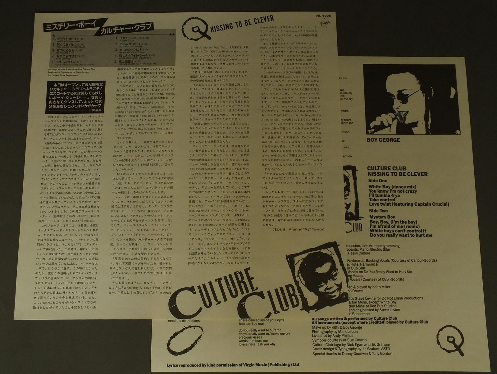 CULTURE CLUBカルチャー・クラブ/KISSING TO BE CLEVERミステリー・ボーイ VIL6008 製造国:日本盤 / Media:LP外観:EX盤の状態:EX帯:EX+ 価格(税込):¥550(売約済) 送料 7inch:定形外郵便 360円~LP:定形外郵便 660円~送料は、注文の最終画面で確認頂けます。 > > CULTURE CLUB/KISSING TO BE CLEVER 外観 (EX)特記事項:特記なし。外観EXの共通説明:ダメージが限定的。中古品としては保存状態がよい方。シミ、ヨゴレ、スレ 少し~軽度。 盤の状態 (EX)特記事項:薄いスリキズ・スレ少しある感じ。一見してきれいな感じです。盤EXの共通説明:盤面のスリキズが薄いものが少し~軽度 音に出そうなものは無いように見える(軽微なソフトティック音は除く)。 帯の状態 (EX+):特記なし。 Tweet それぞれの画像をクリックすると、大きい写真が見られます こちらの商品もお勧めです 440円 TEN TENテン・テン / WALK ONウォーク・オン 440円 TAXXIタクシー / STATES OF EMERGENCY緊急発進 ! 770円 CULTURE CLUBカルチャー・クラブ / WAR SONG戦争のうた 770円 CULTUTE CLUB / HOUSE ON FIRE 440円 WILD BLUEワイルド・ブルー / NO MORE JINXノー・モア・ジンクス 660円 CULTURE CLUBカルチャー・クラブ / KISSING TO BE CLEVER 1,320円 TAZMANIAN DEVILSタズマニアン・デヴィルズ / TAZMANIAN DEVILSアメリカン・ドリームを探して 550円 HUNG CHUNGワン・チャン / HUNG CHUNGダンス・ホール・デイズ