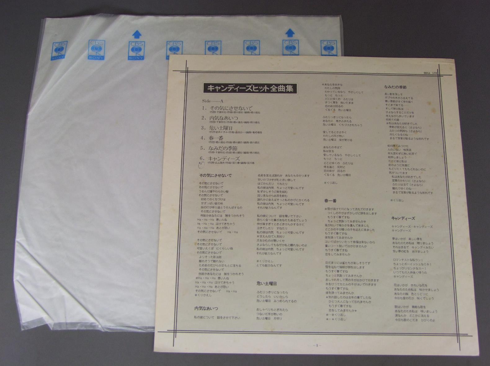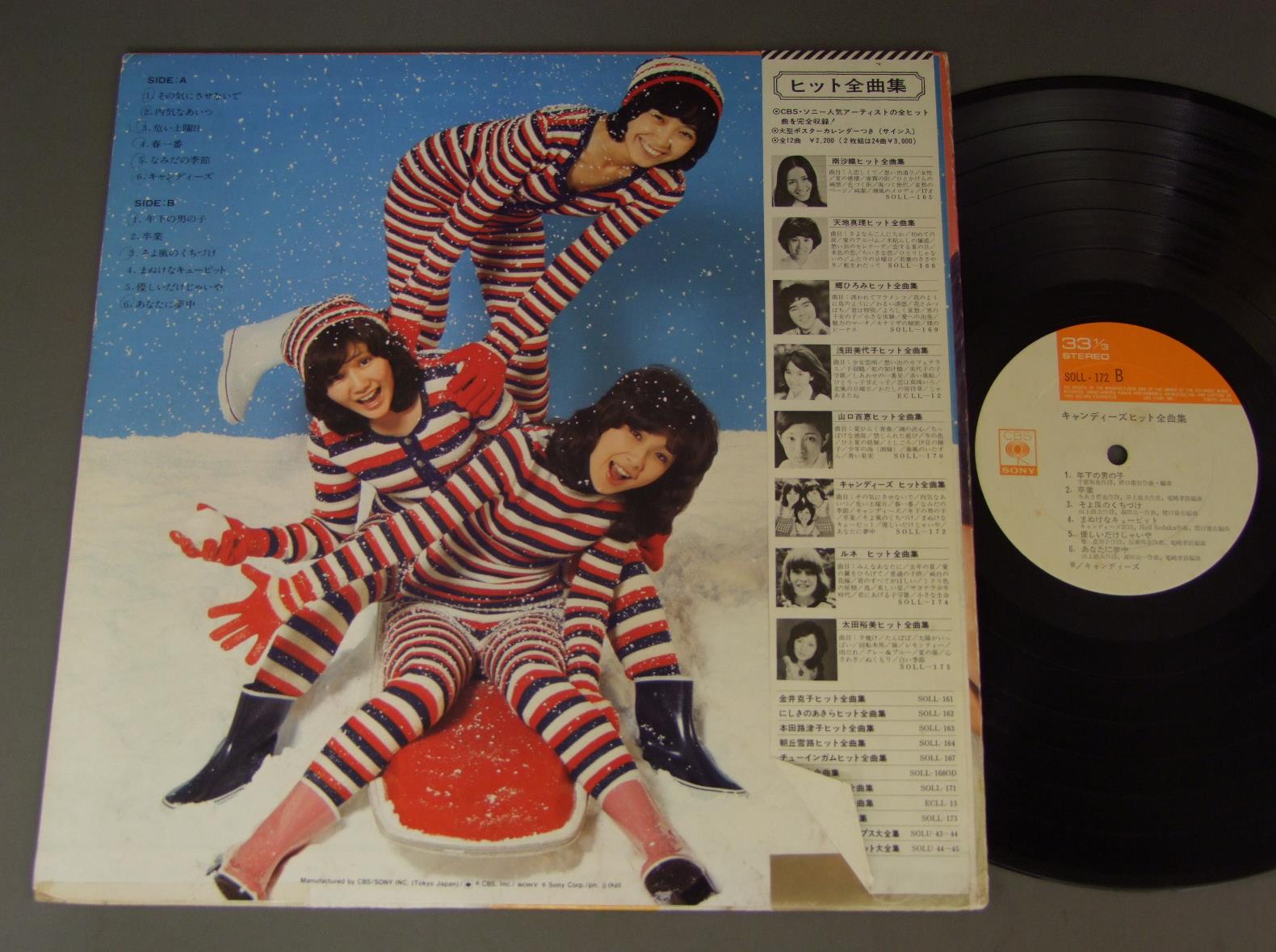 CANDIESキャンディーズ/BEST HITS CANDIESヒット全曲集 キャンディーズ SOLL172 製造国:日本盤 / Media:LP外観:EX-盤の状態:EX-帯:EX- 価格(税込):¥1,100(売約済) 送料 7inch:定形外郵便 360円~LP:定形外郵便 660円~送料は、注文の最終画面で確認頂けます。 > > CANDIES/BEST HITS CANDIES 外観 (EX-)特記事項:ヘリにスレ有。ジャケ表面にスレ有。付属品にシミ、よごれ有。外観EX-の共通説明:ダメージ軽度~多少。 中古品としては普通の状態。シミ、ヨゴレ、スレなど軽く~多少。 盤の状態 (EX-)特記事項:薄いスリキズ・細かい表面スレ多少ある感じ。殆どが軽微なものの様子です。盤EX-の共通説明:盤面のスリキズが多少有り。音に出そうなものは殆ど無いように見える~さほど気にならないぐらいの軽いプチ数カ所程度。 帯の状態 (EX-):ヨレ有。 Tweet それぞれの画像をクリックすると、大きい写真が見られます こちらの商品もお勧めです 770円 SEIKO MATSUDA松田聖子 / SEIKO TOWN 1,210円 PINK LADYピンク・レディー / AMERICA ! AMERICA ! AMERICA !アメリカ!アメリカ!アメリカ! 1,320円 YOSHIMI IWASAKI岩崎良美 / RING-A-DING (1st ALBUM)リング・ア・ディング (1st ALBUM) 990円 TOMOKO TAKABE高部知子 / AMEAGARI雨・ア・ガ・リ 1,870円 ATSUMI KURASAWA倉沢敦美 / MESSAGEメッセージ 990円 SONOKO KAWAI河合その子 / SIESTAシエスタ 1,210円 PINK LADYピンク・レディー / `78 JUMPING SUMMER CARNIVAL`78 ジャンピング・サマー・カーニバル 660円 YUKO ISHIKAWA石川優子 / SENTIMENTAL ROADセンチメンタル・ロード