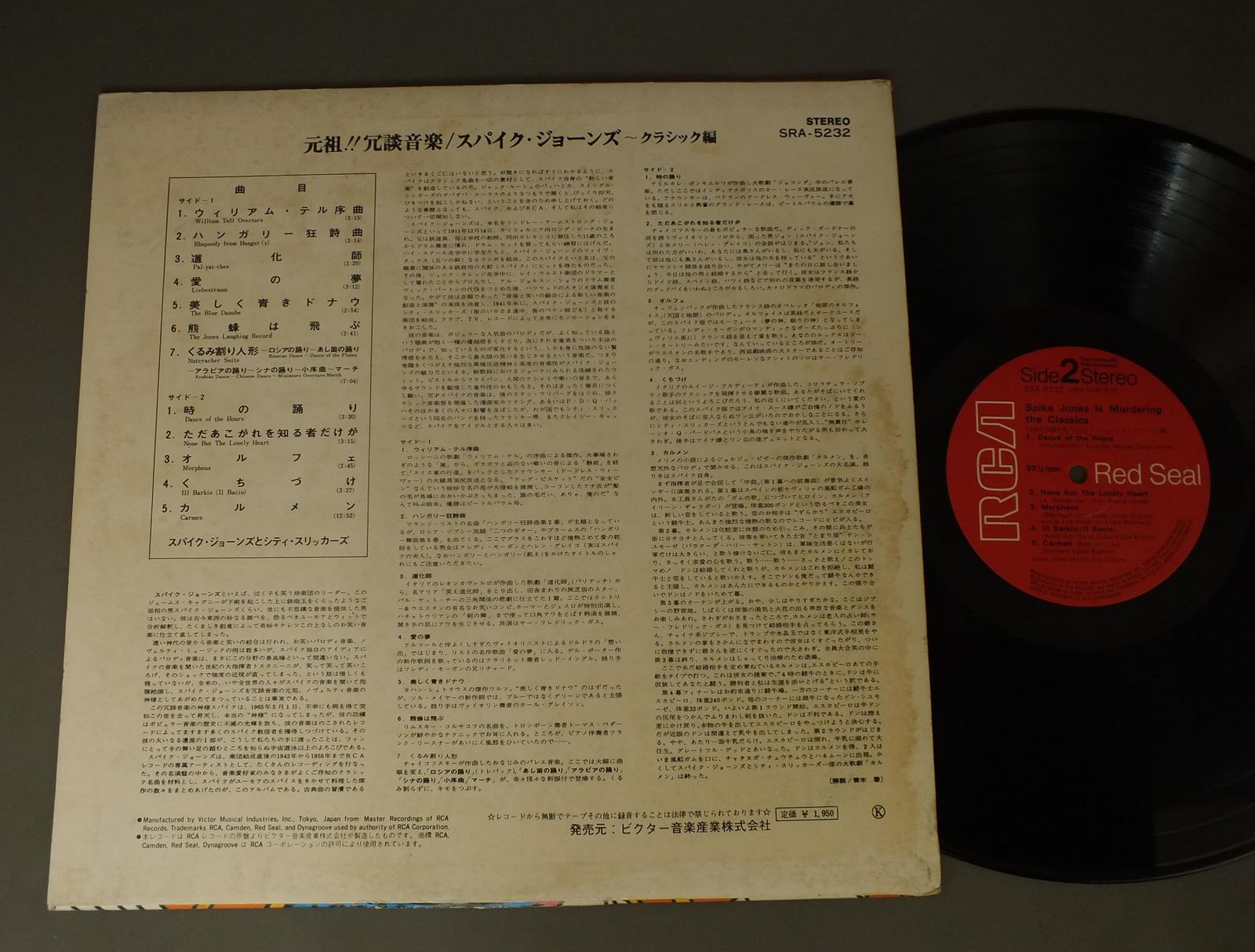 SPIKE JONESスパイク・ジョーンズ/SPIKE JONES IS MURDERING THE CLASSICS元祖!! 冗談音楽/スパイク・ジョーンズ-クラシック編- SRA5232 製造国:日本盤 / Media:LP外観:VG+盤の状態:EX+ 価格(税込):¥660(売約済) 送料 7inch:定形外郵便 360円~LP:定形外郵便 660円~送料は、注文の最終画面で確認頂けます。 > > SPIKE JONES/SPIKE JONES IS MURDERING THE CLASSICS 外観 (VG+)特記事項:ヘリにスレ有、底抜け有。ジャケ表面にシミ、よごれ有、スレ有。外観VG+の共通説明:ダメージやや有り。シミ、ヨゴレ、スレなど多少~やや多め。 盤の状態 (EX+)特記事項:薄いスリキズ・スレ少し。一見してきれいな状態です。盤EX+の共通説明:盤面の極薄いスリキズ、スレ少し程度 音に出そうなものは無いように見える(極軽微なソフトティック音は除く)。 Tweet それぞれの画像をクリックすると、大きい写真が見られます こちらの商品もお勧めです 1,320円 DON ELLIS ORCHESTRAドン・エリス楽団 / STUDY IN GREAT BIG BAND 20-LIVE AT MONTEREY !ライヴ・アット・モンタレー 770円 BRUCE FORMANブルース・フォアマン / COAST TO COASTコースト・トゥ・コースト 1,320円 McCOY TYNERマッコイ・タイナー / ECHOES OF A FRIENDエコーズ・オブ・ア・フレンド 1,980円 EIJI KITAMURA北村英治 / APRIL DATE ( MASTER SOUND PRESSING )エイプリル・デイト (マスターサウンド盤) 770円 AIRTOアイアート・モレイラ / FREEフリー 1,210円 BUCK CLAYTON SEPTETバック・クレイトン / BUCKIN`THE BLUESバッキン・ザ・ブルース 1,210円 BINGO MIKI & INNER GALAXY ORCHESTRA三木敏悟&インナー・ギャラクシー・オーケストラ / EVE(EIGHT LETTERS)出航前夜-一通の手紙 1,650円 DOLLAR BRANDダラー・ブランド / AFRICAN PIANOアフリカン・ピアノ