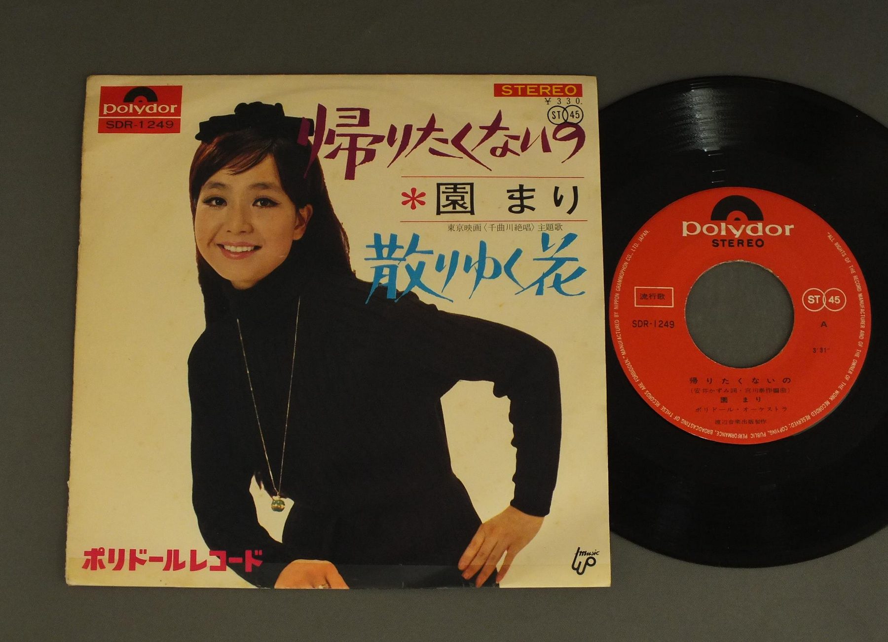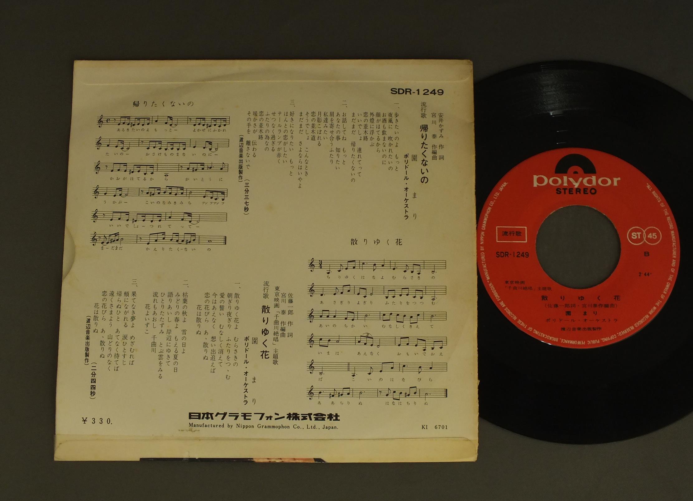 MARI SONO園まり/KAERITAKUNAINO帰りたくないの SOR1249 製造国:日本盤 / Media:7inch外観:VG盤の状態:EX 価格(税込):¥330 送料 7inch:定形外郵便 360円~LP:定形外郵便 660円~送料は、注文の最終画面で確認頂けます。 > > MARI SONO/KAERITAKUNAINO 外観 (VG)特記事項:背抜け。下ヘリにテープ補修。表側は薄い日焼け感。外観VGの共通説明:ダメージが見るからに多い。 盤の状態 (EX)特記事項:薄いスリキズ・スレ軽くある感じ。軽微なものの様子です。盤EXの共通説明:盤面のスリキズが薄いものが少し~軽度 音に出そうなものは無いように見える(軽微なソフトティック音は除く)。 Tweet それぞれの画像をクリックすると、大きい写真が見られます こちらの商品もお勧めです 770円 KOICHI MORITA & TOP GALLANTS森田公一 & トップギャラン / BEST HITSヒット全曲集 770円 KUMIKO YAMASHITA山下久美子 / DANCIN`IN THE KITCHEN 880円 YUKARI ITOH伊東ゆかり 布施 明 / DELUXE伊東ゆかりと布施 明-ふたりの愛の世界- 2,750円 STAGE 101ステージ101 / AKAI YANE NO IE赤い屋根の家 770円 SNAKEMAN SHOWスネークマン・ショー / SNAKEMAN SHOW-NO MORE FIGHTスネークマン・ショー-戦争反対 770円 YASUKO NAITOH内藤やす子 / NAINAI ZUKUSHIないないづくし 660円 CYGNUS白鳥座 / DENEB ( 2nd ALBUM )デネブ ( 2nd ALBUM ) 1,210円 ALFIEアルフィー / GREENHORN ( VICTOR YEARS 1974-76 ) + OUTER COVERGREENHORN ( VICTOR YEARS 1974-76 ) + オリジナル外袋