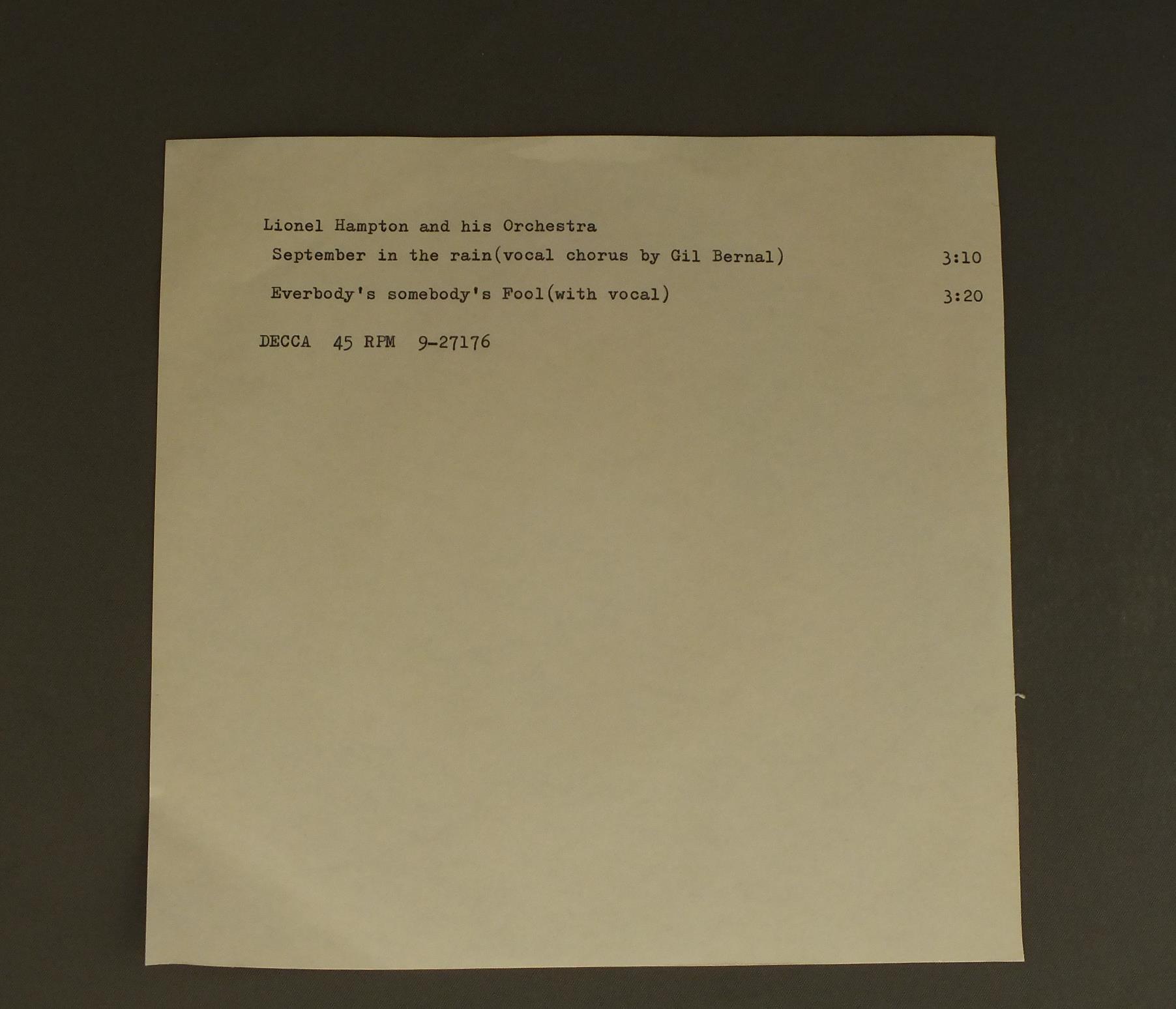 LIONEL HANMPTON/SEPTEMBER IN THE RAIN 9 27176 製造国:米国盤 / Media:7inch盤の状態:EX 価格(税込):¥550(売約済) 送料 7inch:定形外郵便 360円~LP:定形外郵便 660円~送料は、注文の最終画面で確認頂けます。 > > LIONEL HANMPTON/SEPTEMBER IN THE RAIN 盤の状態 (EX)特記事項:薄いスリキズ・スレ軽くある感じ。殆どが軽微なものの様子です。盤EXの共通説明:盤面のスリキズが薄いものが少し~軽度 音に出そうなものは無いように見える(軽微なソフトティック音は除く)。 Tweet それぞれの画像をクリックすると、大きい写真が見られます こちらの商品もお勧めです 660円 DUKE ELLINGTON etc / GRANDI ORCHESTRE 550円 BUNNY BERIGAN & ORIGINAL DIXIELAND JAZZ BAND / SATURDAY NIGHT SWING CLUB 1936 550円 DUKE ELLINGTON / DATE WITH THE DUKE VOL8 1945-46 1,100円 HARRY JAMESハリー・ジェイムズ / ALL ABOUT HARRY JAMES 1,210円 MONTE BALLOU AND HIS NEW CASTLE JAZZ BAND / THEY`RE MOVING WILLIE`S GRAVE TO DIG A SEWER (BUTCH THOMPSON AUTOGRAPHED )THEY`RE MOVING WILLIE`S GRAVE TO DIG A SEWER(BUTCH THOMPSONサイン付) 770円 LIONEL HAMPTON / NEWPORT UPROAR 1,100円 LIONEL HAMPTON / ROCK ROCK ROCK 1,210円 HARRY JAMES etc / BIG BANDS GREATEST HITS VOLUME 2