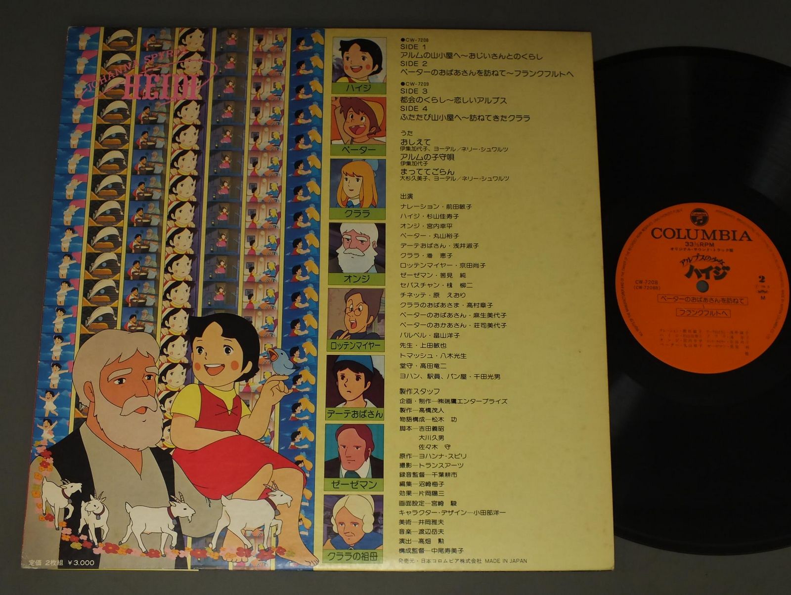 ANIME/JOHANNA SPYRI`S HEIDIアニメ「アルプスの少女ハイジ」オリジナルサウンドトラック盤 CW7208-9 製造国:日本盤 / Media:LP外観:EX盤の状態:EX帯:EX 価格(税込):¥1,540(売約済) 送料 7inch:定形外郵便 360円~LP:定形外郵便 660円~送料は、注文の最終画面で確認頂けます。 > > ANIME/JOHANNA SPYRI`S HEIDI 外観 (EX)特記事項:上ヘリにスレ。外観EXの共通説明:ダメージが限定的。中古品としては保存状態がよい方。シミ、ヨゴレ、スレ 少し~軽度。 盤の状態 (EX)特記事項:薄いスリキズ・スレ軽くある感じ。軽微なものの様子です。盤EXの共通説明:盤面のスリキズが薄いものが少し~軽度 音に出そうなものは無いように見える(軽微なソフトティック音は除く)。 帯の状態 (EX):特記なし。 Tweet それぞれの画像をクリックすると、大きい写真が見られます こちらの商品もお勧めです 1,320円 CYBORG 009アニメ サイボーグ009 / TV ORIGINAL SOUNDTRACK交響組曲サイボーグ009 1,650円 ANIMEアニメ / CYBORG 009サイボーグ009 770円 ROUND-VERNIAN VIFAM銀河漂流バイファム / ORIGINAL SOUND TRACK音楽集 770円 CRUSHER JOEクラッシャージョウ / SYMPHONIC SUITE交響組曲 1,320円 ANIME GATCHAMANアニメ 科学忍者隊 ガッチャマン / GATCHAMAN 2 VOL2ガッチャマン? VOL2 1,210円 ANIME MACROSSマクロス / MISS DJテレビドラマ篇 770円 TV ANIME AIM FOR THE ACEアニメ エースをねらえ ! / VOL2新エースをねらえ ! 770円 SPACE RUNAWAY IDEON伝説巨神イデオン / MOVIE SOUND TRACK映画イデオン