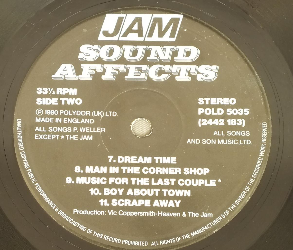 JAM/SOUND AFFECTS英国プレス盤 POLD5035 製造国:英国盤 / Media:LPMatrix:A//8 B//8外観:EX盤の状態:EX 価格(税込):¥5,500(売約済) 送料 7inch:定形外郵便 360円~LP:定形外郵便 660円~送料は、注文の最終画面で確認頂けます。 > > JAM/SOUND AFFECTS 外観 (EX)特記事項:ジャケ表面は全体的にスレやスリキズ、よごれ等の少ない良い状態です。オリジナルインナーはスレよごれ等は多少有りますが、ヨレ感のあまり無い状態。抜けも無いです。外観EXの共通説明:ダメージが限定的。中古品としては保存状態がよい方。シミ、ヨゴレ、スレ 少し~軽度。 盤の状態 (EX)特記事項:薄いスリキズ・スレ少しある程度。音に出そうなものもなく一見してきれいな状態です。曲間など、静かなところを中心に聴いて見ましたが、チリノイズ少ないきれいな再生具合でした。盤EXの共通説明:盤面のスリキズが薄いものが少し~軽度 音に出そうなものは無いように見える(軽微なソフトティック音は除く)。 Tweet それぞれの画像をクリックすると、大きい写真が見られます こちらの商品もお勧めです