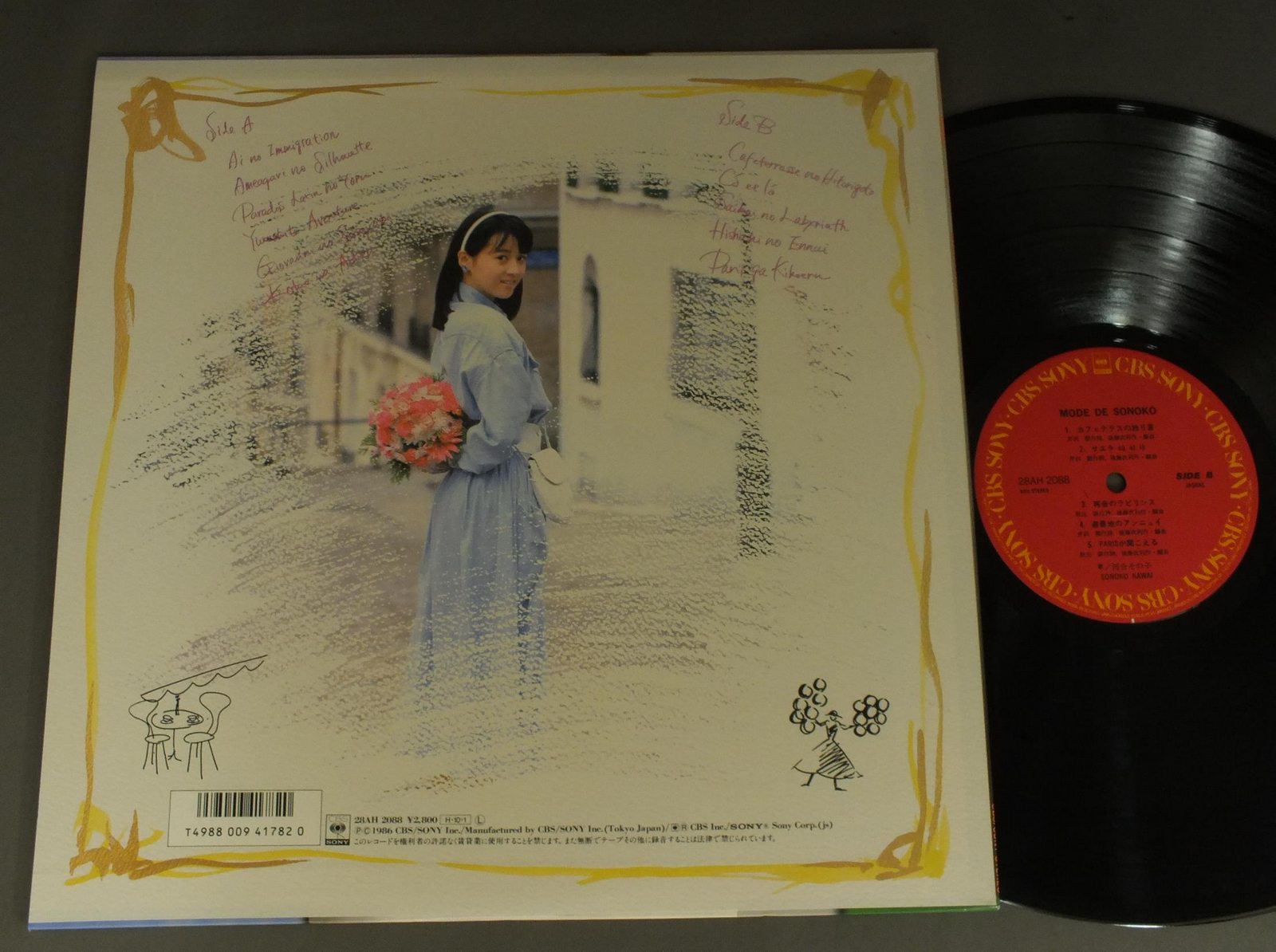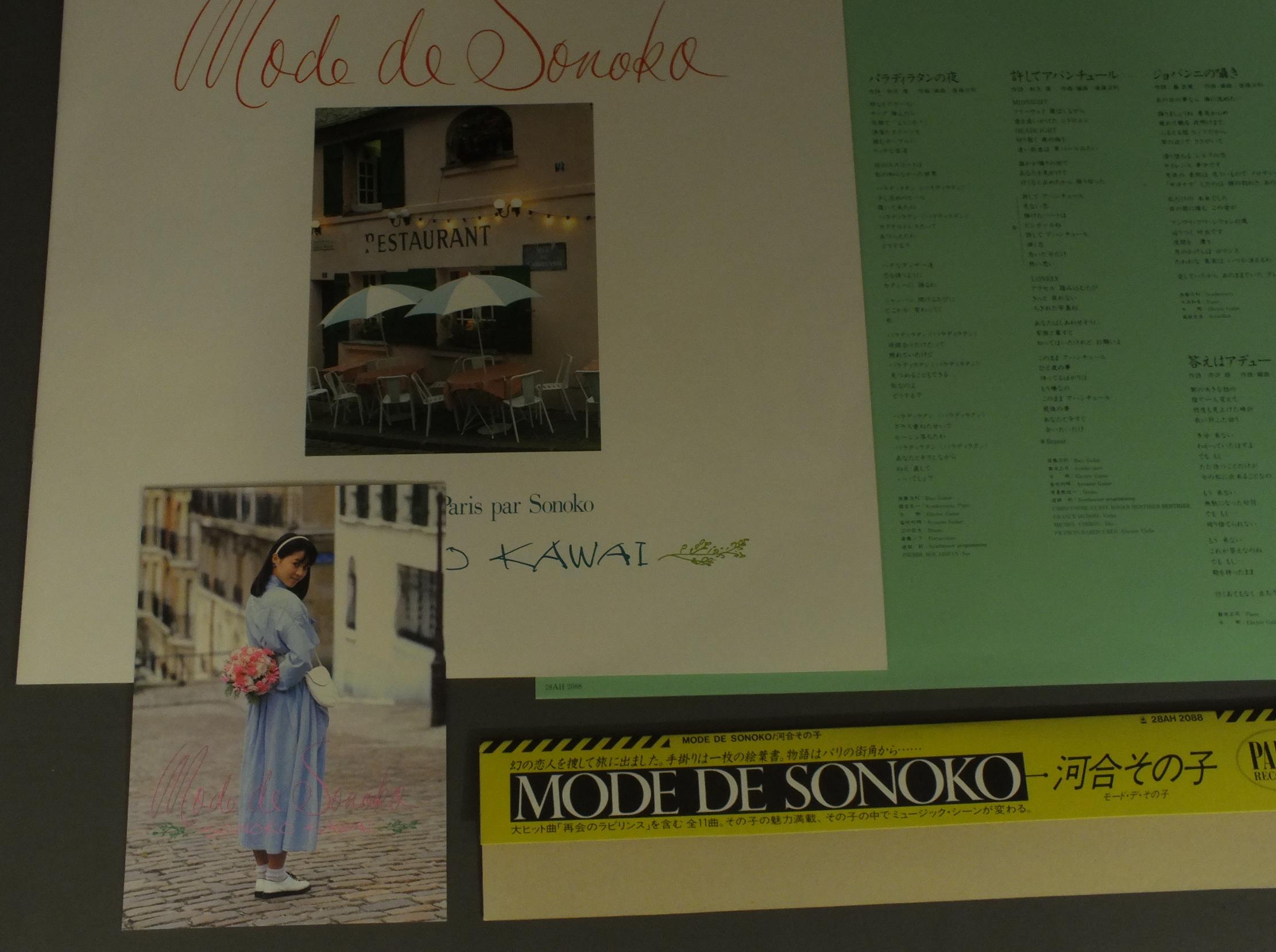 SONOKO KAWAI河合その子/MODE DE SONOKOモート・デ・その子 28AH2088 製造国:日本盤 / Media:LP外観:EX+盤の状態:EX+帯:EX+ 価格(税込):¥770(売約済) 送料 7inch:定形外郵便 360円~LP:定形外郵便 660円~送料は、注文の最終画面で確認頂けます。 > > SONOKO KAWAI/MODE DE SONOKO 外観 (EX+)特記事項:特記なし。外観EX+の共通説明:中古としては美品、一見してきれいでダメージが軽微。シミ、ヨゴレ、スレ有っても僅か~少し。 盤の状態 (EX+)特記事項:極薄いスリキズ・スレ少し。一見してきれいな状態です。盤EX+の共通説明:盤面の極薄いスリキズ、スレ少し程度 音に出そうなものは無いように見える(極軽微なソフトティック音は除く)。 帯の状態 (EX+):特記なし。 Tweet それぞれの画像をクリックすると、大きい写真が見られます こちらの商品もお勧めです 660円 YUKO ISHIKAWA石川優子 / SENTIMENTAL ROADセンチメンタル・ロード 770円 SHOKO SAWADA沢田聖子 / POTENTIALポテンシャル 770円 SEIKO MATSUDA松田聖子 / SEIKO TOWN 990円 PINK LADYピンク・レディー / CHALLENGE CONCERTチャレンジ・コンサート 1,320円 YOU HAYAMI早見優 / COLORFUL BOX 1,210円 ERI NITTA新田恵利 / ERI 1,210円 SAORI MINAMI南沙織 / HITOKAKERANO JUNJYOひとかけらの純情 990円 SONOKO KAWAI河合その子 / SIESTAシエスタ
