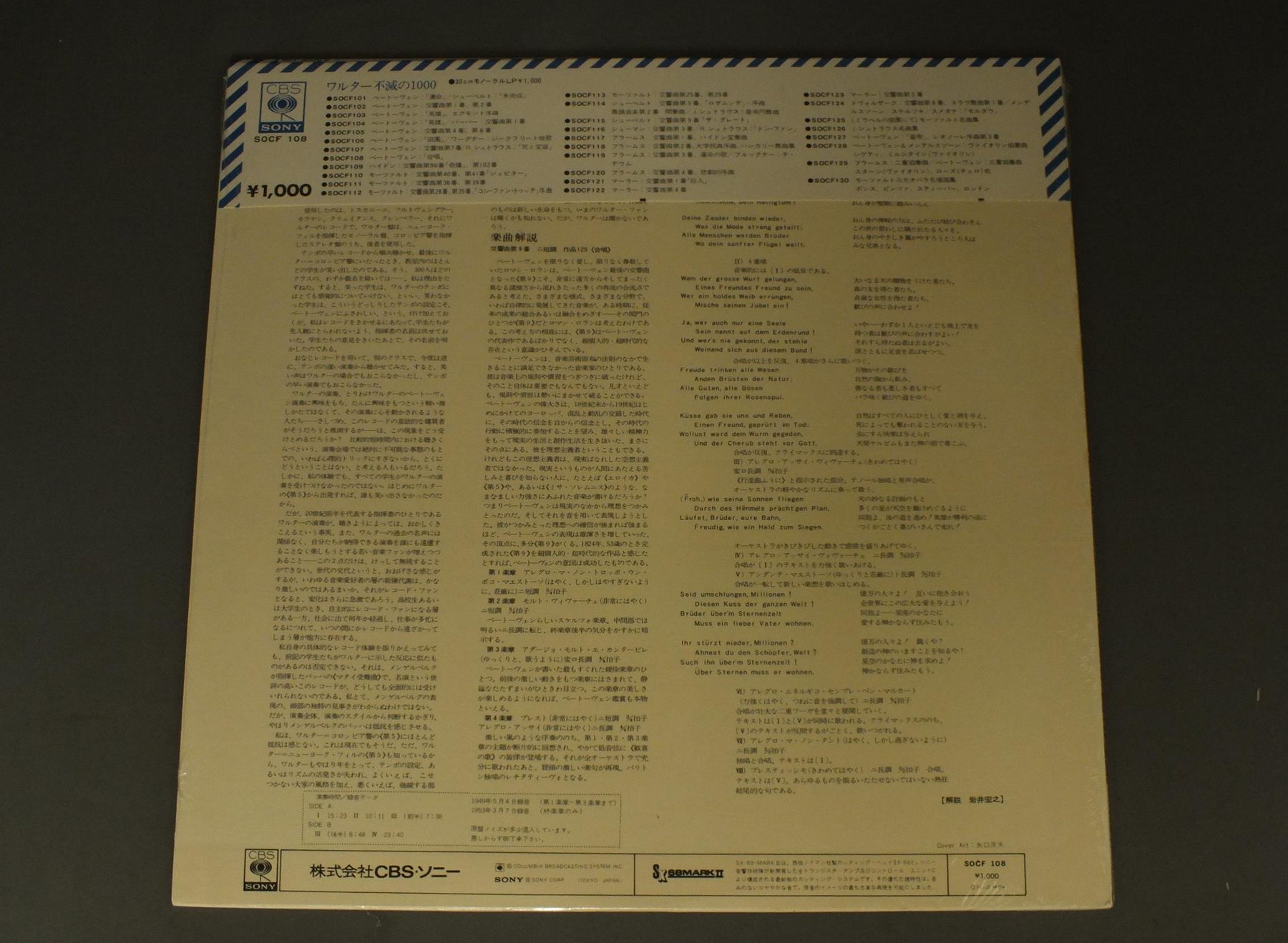 WALTERワルター/BEETHOVEN: SYM. NO.9 CHORALベートーヴェン/交響曲第9番「合唱」 SOCF108 製造国:日本盤 / Media:LP外観:M盤の状態:M 価格(税込):¥880(売約済) 送料 7inch:定形外郵便 360円~LP:定形外郵便 660円~送料は、注文の最終画面で確認頂けます。 > > WALTER/BEETHOVEN: SYM. NO.9 CHORAL 外観 (M)特記事項:特記なし。外観Mの共通説明:新品、シールドが切れていない状態。 盤の状態 (M)特記事項:未開封盤Mの共通説明:新品。 Tweet それぞれの画像をクリックすると、大きい写真が見られます こちらの商品もお勧めです 990円 KARAJAN - BERLIN PHILHARMONICカラヤン - ベルリン・フィル / DVORAK - SYMPHONY NO5ドボルザーク - 交響曲第5番新世界より 770円 NEUMANN - CZECH PHILHARMONICノイマン - チェコ・フィル / DVORAK - SYMPHONY NO9 FROM THE NEW WORLDドヴォルザーク - 新世界・モルダウ 990円 WALTER - VIENNA PHILHAMONIC ORCH.ワルター - ウィーン・フィルハーモニー管弦楽団 / MOZART - CONCERTO IN D MIN K466モーツァルト - ピアノ協奏曲第20番 1,320円 KARAJANカラヤン / TCHAIKOVSKY SWAN LAKEチャイコフスキー- バレエ組曲 白鳥の湖-バレエ組曲 眠りの森の美女 990円 GYORGY CZIFFRA VANDERNOOTジョルジ・シフラ ヴァンデルノート / LISZT PIANO CONC. リスト ピアノ協奏曲 第1番&第2番 1,320円 CLUYTENS - BERLIN PHILHARMONIC ORCH.クリュイタンス - ベルリン・フィル / BEETHOVEN - SYM. NO4 & NO8ベートーヴェン 交響曲 第4番 & 8番 990円 KARAJAN - BERLIN PHILHARMONICカラヤン - ベルリン・フィル / KARAJAN CONDUCTS WAGNER ALBUM 1ワーグナー管弦楽集第1集 990円 ASHKENAZY - SOLTI - CHICAGO SYM.アシュケナージ - ショルティ - シカゴ交響楽団 / BEETHOVEN - COMPLETE PIANO CONCERTOS 4LP BOXベートーヴェン - ピアノ協奏曲全集 4枚組
