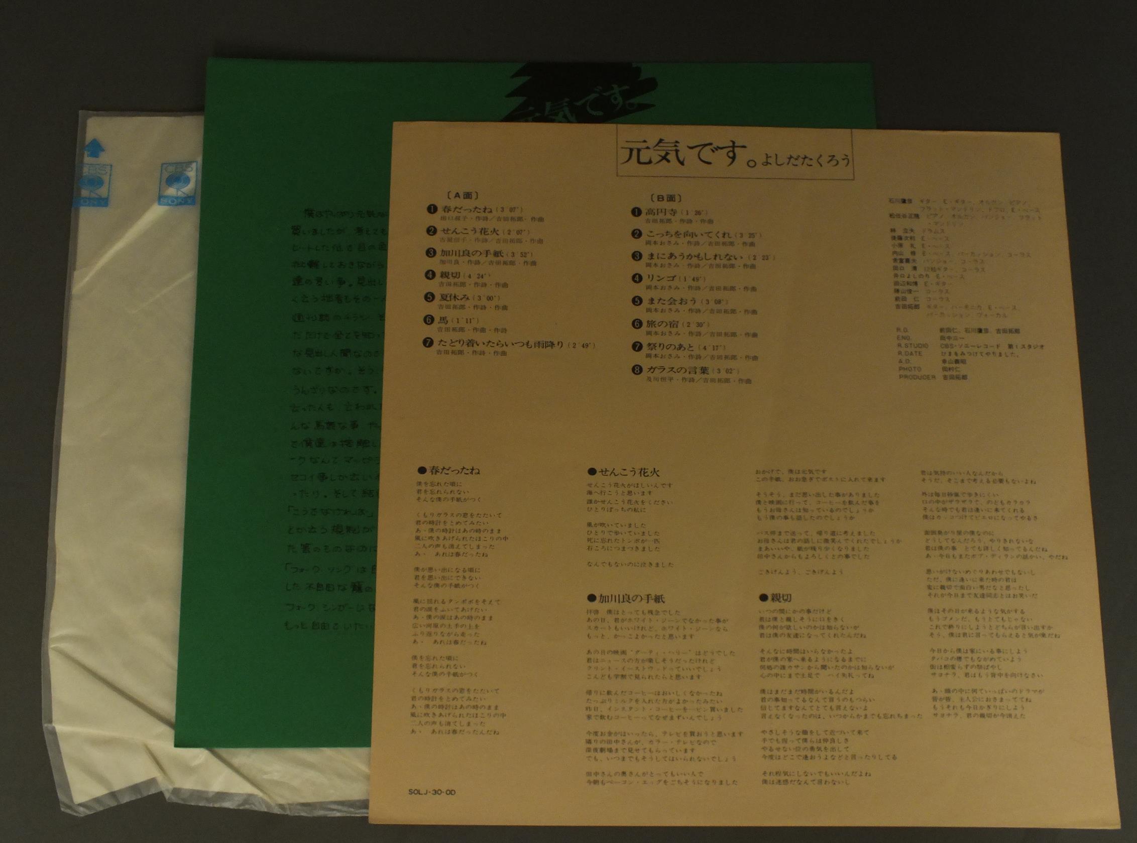 TAKURO YOSHIDAよしだたくろう/I`M FINE元気です。よしだたくろう SOLJ30OD 製造国:日本盤 / Media:LP外観:EX盤の状態:EX- 価格(税込):¥2,944(売約済) 送料 7inch:定形外郵便 360円~LP:定形外郵便 660円~送料は、注文の最終画面で確認頂けます。 > > TAKURO YOSHIDA/I`M FINE 外観 (EX)特記事項:特記なし。外観EXの共通説明:ダメージが限定的。中古品としては保存状態がよい方。シミ、ヨゴレ、スレ 少し~軽度。 盤の状態 (EX-)特記事項:薄いスリキズ・細かい表面スレ軽くある感じ。全体的には殆どが軽微なものの様子です。盤EX-の共通説明:盤面のスリキズが多少有り。音に出そうなものは殆ど無いように見える~さほど気にならないぐらいの軽いプチ数カ所程度。 Tweet それぞれの画像をクリックすると、大きい写真が見られます こちらの商品もお勧めです 770円 YOSHITAROU KANAZAKI加奈崎芳太郎 (古井戸) / AIGA MOSHI SUBETENARA愛がもしすべてなら 880円 NUMBER ONE BANDナンバーワン・バンド / TOKYO ATARI東京あたり 660円 MANABU MIYAHARA宮原学 / RUSH ! 770円 EIGO KAWASHIMA河島英五 / SHINBOU信望 770円 YUMI MATSUTOYA松任谷由実 / DA・DI・DA 770円 MIYUKI NAKAJIMA中島みゆき / OAKERINASAIおかえりなさい 1,210円 TULIPチューリップ / 10TH ODYSSEY 1,320円 NOA HORIGUCHI堀口ノア / NOA