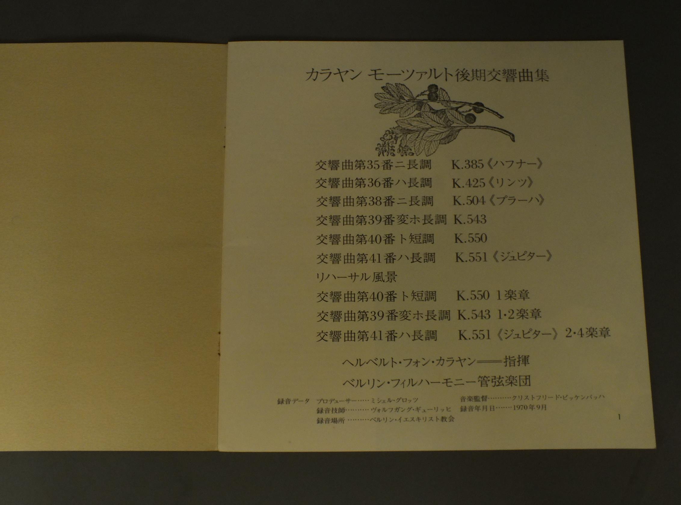 KARAJANカラヤン/MOZART/SYMPHONIESカラヤン モーツァルト後期交響曲集 AA9728-30 製造国:日本盤 / Media:LP外観:EX盤の状態:EX+ 価格(税込):¥5,500(売約済) 送料 7inch:定形外郵便 360円~LP:定形外郵便 660円~送料は、注文の最終画面で確認頂けます。 > > KARAJAN/MOZART/SYMPHONIES 外観 (EX)特記事項:特記なし。外観EXの共通説明:ダメージが限定的。中古品としては保存状態がよい方。シミ、ヨゴレ、スレ 少し~軽度。 盤の状態 (EX+)特記事項:薄いスリキズ・スレ少し。一見してきれいな状態です。盤EX+の共通説明:盤面の極薄いスリキズ、スレ少し程度 音に出そうなものは無いように見える(極軽微なソフトティック音は除く)。 その他:白見本盤 Tweet それぞれの画像をクリックすると、大きい写真が見られます こちらの商品もお勧めです 990円 KARAJANカラヤン / BIZET-CARMEN SUITEビゼー-カルメン 第1組曲-アルルの女 第1組曲 & 第2組曲 1,320円 WALTER - COLUMBIA SYM. ORCH.ワルター - コロンビア交響楽団 / MOZART - SYM. NO40 & NO41モーツァルト 交響曲第40番 & 41番 ジュピター 990円 MAAZELマゼール / SIBELIUS SYM. NO1シベリウス 交響曲第1番 990円 FURTWANGLER - BERLIN PHILHARMONICフルトヴェングラー - ベルリン・フィル / BRAHMS - SYMPHONY NO4ブラームス - 交響曲第4番 990円 SZELLセル / MOZART SYM. NO40 SYM. NO39モーツァルト 交響曲第39番&第40番 770円 DORATI - LONDON SYM. ORCH.ドラティ- ロンドン交響楽団 / BRAHMS - NHUNGARIAN DANCESブラームス - ハンガリー舞曲集 990円 KEMPEケンペ / R STRAUSS SUITE`LE BOURGEOIS GENTHIHOMME`OP.60R・シュトラウス 組曲 町人貴族他 770円 NEUMANN - CZECH PHILHARMONICノイマン - チェコ・フィル / DVORAK - SYMPHONY NO9 FROM THE NEW WORLDドヴォルザーク - 新世界・モルダウ