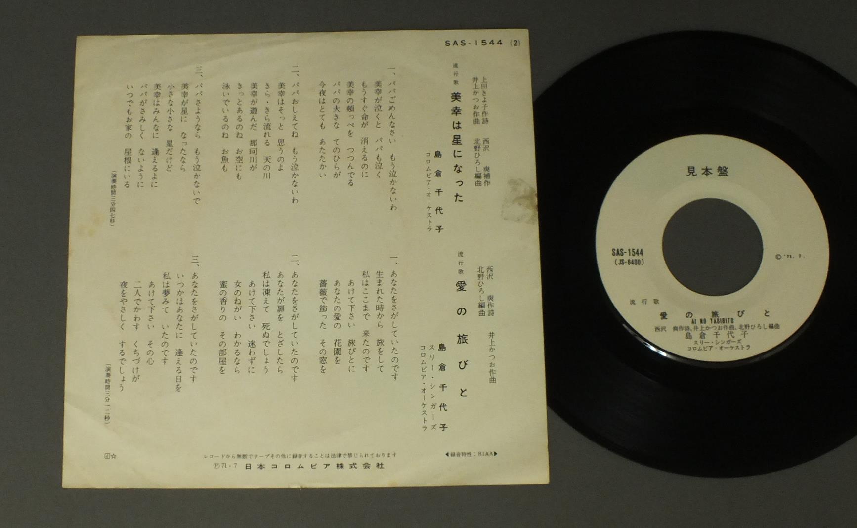 CHIYOKO SHIMAKURA島倉千代子/MIYUKI HA HOSHININATTA美幸は星になった SAS1544 製造国:日本盤 / Media:7inch外観:VG+盤の状態:EX 価格(税込):¥330 送料 7inch:定形外郵便 360円~LP:定形外郵便 660円~送料は、注文の最終画面で確認頂けます。 > > CHIYOKO SHIMAKURA/MIYUKI HA HOSHININATTA 外観 (VG+)特記事項:左側にテープ跡。ヨレやシミ軽く有り。外観VG+の共通説明:ダメージやや有り。シミ、ヨゴレ、スレなど多少~やや多め。 盤の状態 (EX)特記事項:薄いスリキズ・スレ軽くある感じ。軽微なものの様子です。盤EXの共通説明:盤面のスリキズが薄いものが少し~軽度 音に出そうなものは無いように見える(軽微なソフトティック音は除く)。 その他:白見本 Tweet それぞれの画像をクリックすると、大きい写真が見られます こちらの商品もお勧めです 1,210円 KEIICHIRO AKAGI赤木圭一郎 / EIEN-NO-TONY永遠のトニー 赤木圭一郎絶唱集 770円 MIEKO TAKAMINE高峰三枝子 / SONG ALBUM高峰三枝子 歌のアルバム 990円 YOSHIO TABATA田端義夫 / BEST ALBUM歌道ひと筋三十年 田端義夫の傑作全集 心の唄 550円 HISAO ITO伊藤久男 / BEST ALBUM懐しの歌声 伊藤久男と共に 880円 上原敏 / 憶い出の任侠・時代歌謡-ポリドール SP原盤 シリーズ 1,210円 HACHIRO KASUGA春日八郎 / HACHIRO KASUGA HIT ALBUM春日八郎 -魅力のすべて- 990円 YOSHIO TABATA田端義夫 / SHIMA SODACHI島育ち 880円 YUKIO HASHI橋幸夫 / FROM ITAKOGASA TO MUHYO黄金の声/潮来笠から霧氷まで