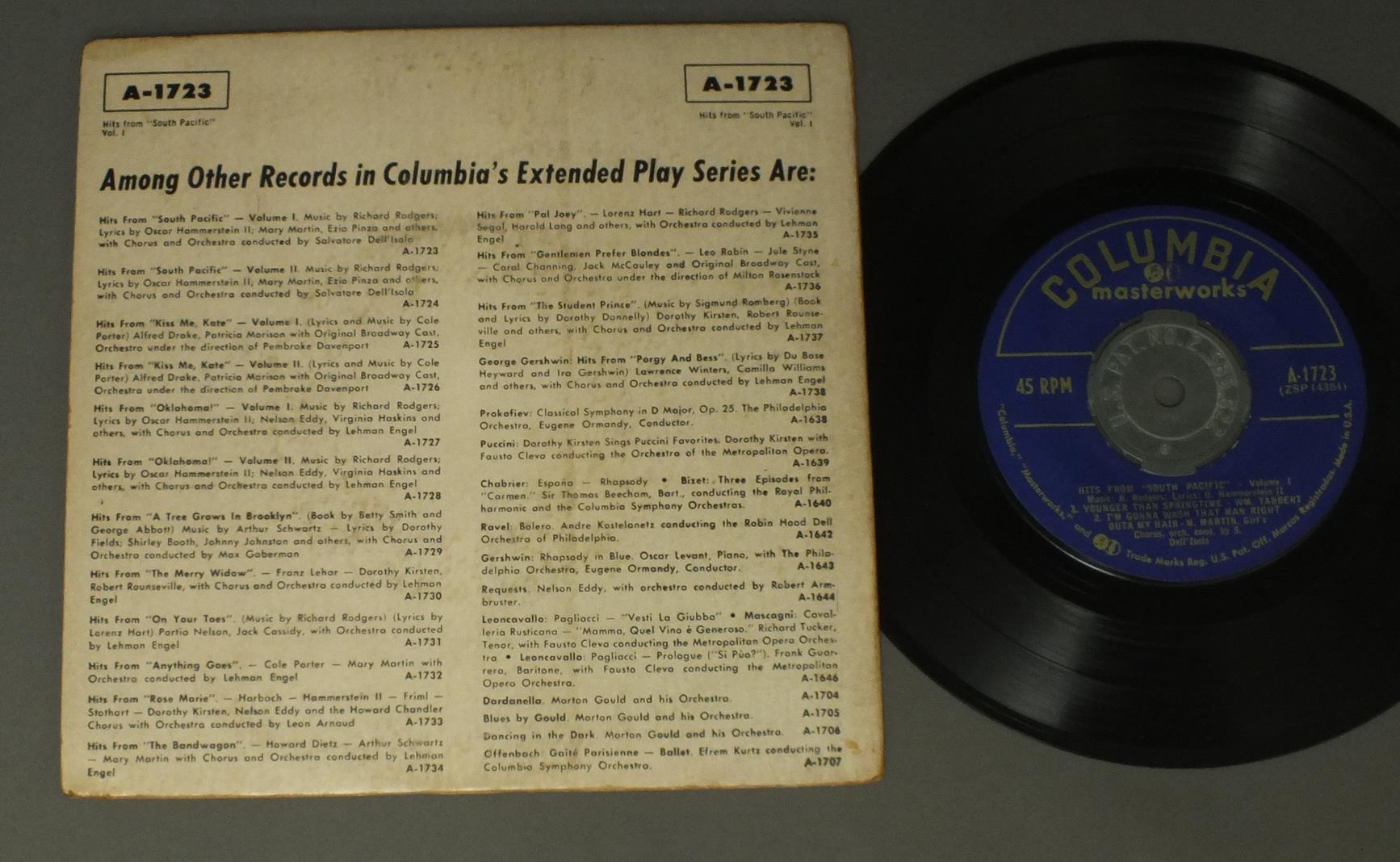MARY MARTIN/EZIO PINZA/HITS FROM SOUTH PACIFIC A1723 製造国:米国盤 / Media:7inch外観:VG+盤の状態:EX 価格(税込):¥550(売約済) 送料 7inch:定形外郵便 360円~LP:定形外郵便 660円~送料は、注文の最終画面で確認頂けます。 レコード検索 > ALL Genre > MARY MARTIN/EZIO PINZA/HITS FROM SOUTH PACIFIC 外観 (VG+)特記事項:角スレ大。背やヘリのスレ多め。取り出し口上下に割れ。割れに接着補修。内側は、経年風の日焼け感有り。外観VG+の共通説明:ダメージやや有り。シミ、ヨゴレ、スレなど多少~やや多め。 盤の状態 (EX)特記事項:薄いスリキズ・スレ軽くある感じ。殆どが軽微なものの様子です。盤EXの共通説明:盤面のスリキズが薄いものが少し~軽度 音に出そうなものは無いように見える(軽微なソフトティック音は除く)。 Tweet それぞれの画像をクリックすると、大きい写真が見られます こちらの商品もお勧めです 990円 CLANCY HAYES / SWINGIN` MINSTREL AUTOGRAPHED ( RALPH SUTTON )SWINGIN` MINSTREL (RALPH SUTTON サイン付) 770円 OSCAR PETERSON / GOLDEN ACHIVE SERIES 2,420円 RUBY BRAFF AND HIIS MEN / HI FI SALUTE TO BUNNY 660円 SAMMY KAYE / IF YOU`VE GOT THE TIME 770円 RICHIE COLEリッチー・コール / ALIVE AT THE VILALGE VANGUARD 770円 JELLY ROLL MORTON / PIANO ROLL SOLOS 1,100円 BILY TALOR / CROSS SECTION 3,850円 CHARLIE PARKER / HISTORICAL MASTERPIECES 3LP BOX