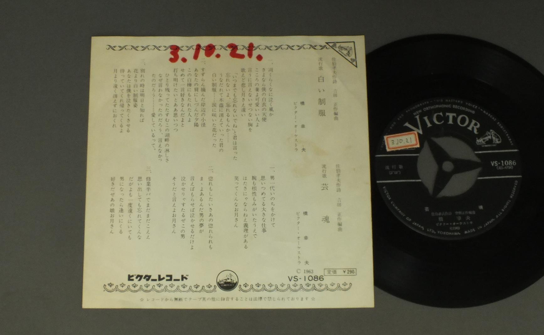 YUKIO HASHI橋幸夫/SHIROI SEIFUKU白い制服 VS1086 製造国:日本盤 / Media:7inch外観:EX-盤の状態:EX- 価格(税込):¥770 送料 7inch:定形外郵便 360円~LP:定形外郵便 660円~送料は、注文の最終画面で確認頂けます。 レコード検索 > J-POP > YUKIO HASHI/SHIROI SEIFUKU 外観 (EX-)特記事項:ヨレが少し。薄いシミ多少有り。裏側に書き込み。外観EX-の共通説明:ダメージ軽度~多少。 中古品としては普通の状態。シミ、ヨゴレ、スレなど軽く~多少。 盤の状態 (EX-)特記事項:薄いスリキズ・細かい表面スレ多少ある感じです。プチ出そうな所は少し。軽微なものが中心の様子です。盤EX-の共通説明:盤面のスリキズが多少有り。音に出そうなものは殆ど無いように見える~さほど気にならないぐらいの軽いプチ数カ所程度。 その他:レーベルにシール。 Tweet それぞれの画像をクリックすると、大きい写真が見られます こちらの商品もお勧めです 770円 YUJIRO ISHIHARA石原裕次郎 / YUJIRO ISHIHARA ORIGINAL BEST石原裕次郎オリジナルベスト 990円 YOSHIO TABATA田端義夫 / BEST ALBUM歌道ひと筋三十年 田端義夫の傑作全集 心の唄 1,210円 KEIICHIRO AKAGI赤木圭一郎 / EIEN-NO-TONY永遠のトニー 赤木圭一郎絶唱集 880円 KEN TSUMURA津村謙 / KAYO ALBUM津村謙歌謡アルバム 880円 TOSHIRO OKAMOTO岡本敦朗 / SHIROI HANA NO SAKUKORO白い花の咲く頃 660円 KOJO TSURUTA鶴田浩二 / RED AND BLACK BLUES赤と黒のブルース 1,210円 高峰秀子-橋幸夫 他 / 続 日本流行歌史 660円 MISAO MATSUBARA松原操 / COLLECTION VOL2第ニ集-浮草の唄