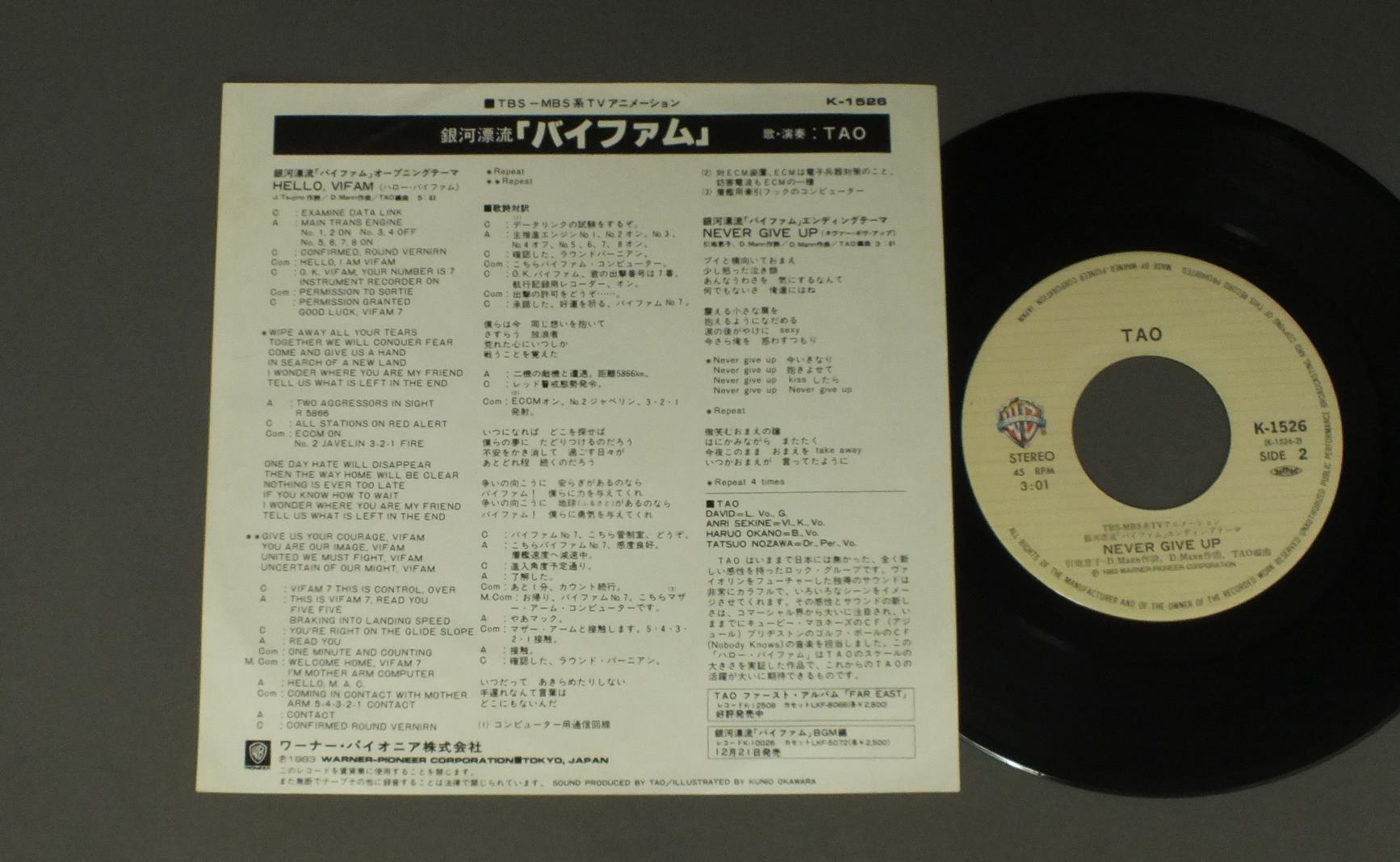 ANIME VIFAM THEME/HELLO. VAIFAMアニメ「銀河漂流「バイファム」 K1526 製造国:日本盤 / Media:7inch外観:EX盤の状態:EX+ 価格(税込):¥660(売約済) 送料 7inch:定形外郵便 360円~LP:定形外郵便 660円~送料は、注文の最終画面で確認頂けます。 > > ANIME VIFAM THEME/HELLO. VAIFAM 外観 (EX)特記事項:ヨレ軽く有り。外観EXの共通説明:ダメージが限定的。中古品としては保存状態がよい方。シミ、ヨゴレ、スレ 少し~軽度。 盤の状態 (EX+)特記事項:薄いスリキズ・スレ少し。一見してきれいな状態です。盤EX+の共通説明:盤面の極薄いスリキズ、スレ少し程度 音に出そうなものは無いように見える(極軽微なソフトティック音は除く)。 Tweet それぞれの画像をクリックすると、大きい写真が見られます こちらの商品もお勧めです 550円 ROUND-VERNIAN VIFAM銀河漂流バイファム / MUSIC & DRAMAMUSIC & DRAMA 1,320円 ANIME GATCHAMANアニメ 科学忍者隊 ガッチャマン / GATCHAMAN 2 VOL2ガッチャマン? VOL2 1,650円 ANIME URUSEI YATSURA 3うる星やつら 3 / REMEMBER MY LOVEリメンバー・マイ・ラヴ 770円 ROUND-VERNIAN VIFAM銀河漂流バイファム / ORIGINAL SOUND TRACK音楽集 1,210円 SPACE BATTLE SHIP YAMATO宇宙戦艦ヤマト / SOUNDTRACK GOODBY YAMATOさらば宇宙戦艦ヤマト (愛の戦士たちドラマ編) 1,650円 ANIME HEAVY METAL L GAIM重戦機エルガイム / ODYSSEYオデッセイ 550円 AURA BATTLER DUNBINE聖戦士ダンバイン / ORIGINAL SOUND TRACKダンバイン2 550円 MOBILE SUIT GUNDAM 3機動戦士ガンダム 3 / ORIGINAL BGM COLLECTIONアムロよ