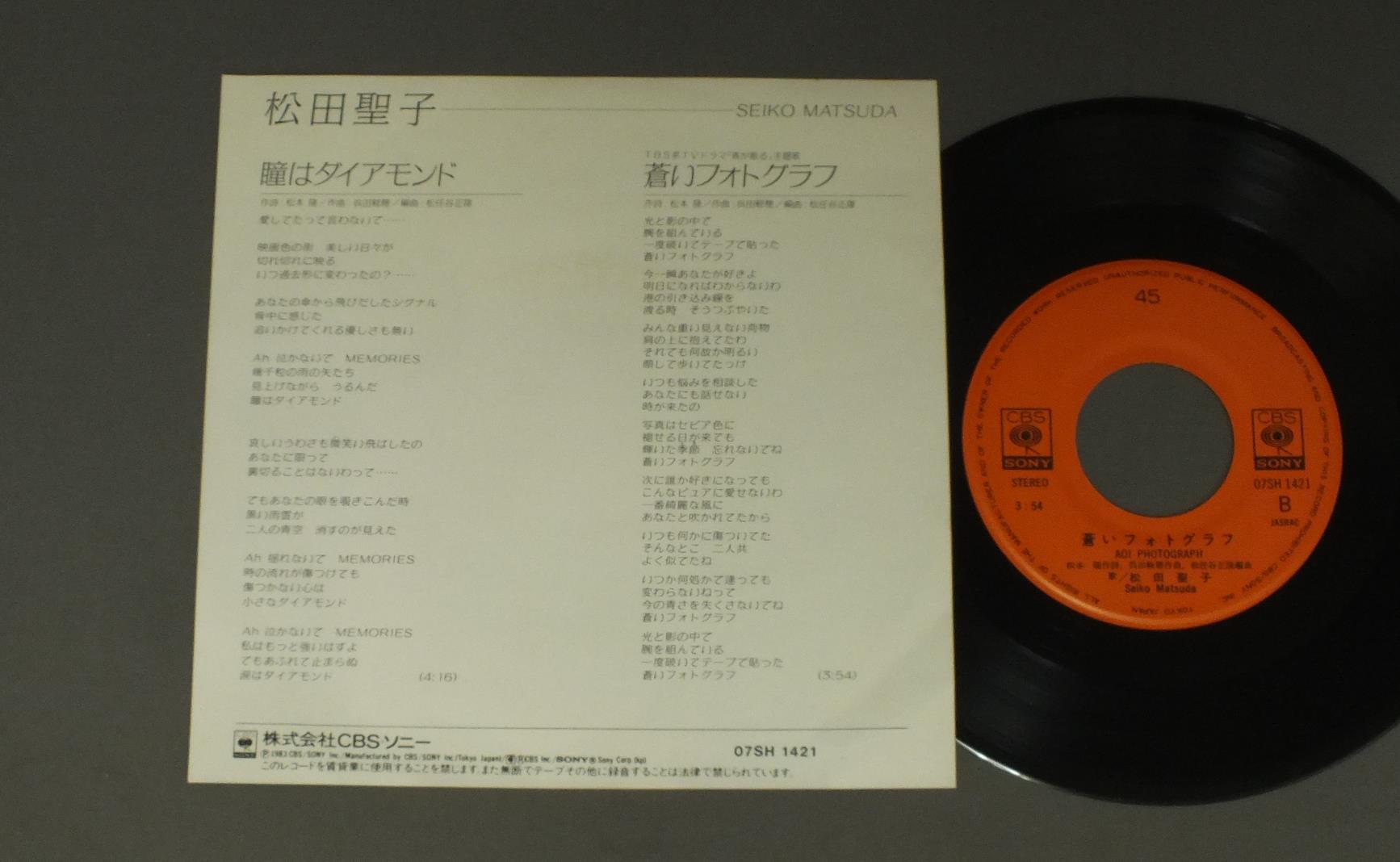 SEIKO MATSUDA松田聖子/HITOMI WA DIAMOND瞳はダイアモンド 07SH1421 製造国:日本盤 / Media:7inch外観:EX盤の状態:EX+ 価格(税込):¥330(売約済) 送料 7inch:定形外郵便 360円~LP:定形外郵便 660円~送料は、注文の最終画面で確認頂けます。 > > SEIKO MATSUDA/HITOMI WA DIAMOND 外観 (EX)特記事項:ヨレが少し有りますが、全体的にはきれいな感じ。外観EXの共通説明:ダメージが限定的。中古品としては保存状態がよい方。シミ、ヨゴレ、スレ 少し~軽度。 盤の状態 (EX+)特記事項:薄いスリキズ・スレ少し。一見してきれいな状態です。盤EX+の共通説明:盤面の極薄いスリキズ、スレ少し程度 音に出そうなものは無いように見える(極軽微なソフトティック音は除く)。 Tweet それぞれの画像をクリックすると、大きい写真が見られます こちらの商品もお勧めです 990円 PINK LADYピンク・レディー / CHALLENGE CONCERTチャレンジ・コンサート 1,210円 TSUKASA ITOH伊藤つかさ / SAYONARA KONNICHIWAさよなら、こんにちは 770円 NAOKO KAWAI河合奈保子 / STARDUST GARDEN千年庭園 770円 NAOKO KAWAI河合奈保子 / NAOKO IN CONCERT河合奈保子 カナリー・コンサート PART 2 770円 MIKI ASAKURA麻倉末稀 / LOVE AGAIN 550円 SONOKO KAWAI河合その子 / SONOKOその子 770円 SEIKO MATSUDA松田聖子 / CANDYキャンディー 880円 SONOKO KAWAI河合その子 / SONOKOその子