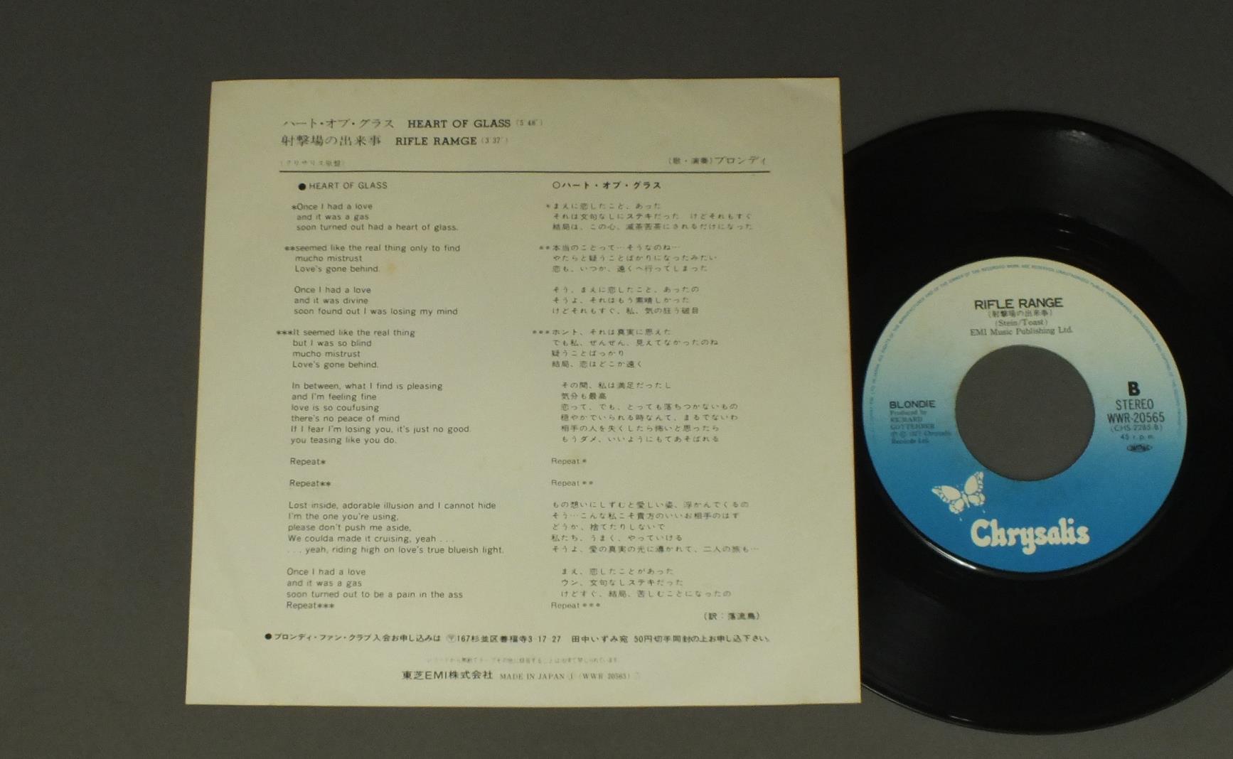 BLONDIEブロンディ/HEART OF GLASSハート・オブ・グラス WWR20565 製造国:日本盤 / Media:7inch外観:EX盤の状態:EX+ 価格(税込):¥440(売約済) 送料 7inch:定形外郵便 360円~LP:定形外郵便 660円~送料は、注文の最終画面で確認頂けます。 > > BLONDIE/HEART OF GLASS 外観 (EX)特記事項:ヨレが少し。外観EXの共通説明:ダメージが限定的。中古品としては保存状態がよい方。シミ、ヨゴレ、スレ 少し~軽度。 盤の状態 (EX+)特記事項:薄いスリキズ・スレ少し。一見してきれいな状態です。盤EX+の共通説明:盤面の極薄いスリキズ、スレ少し程度 音に出そうなものは無いように見える(極軽微なソフトティック音は除く)。 Tweet それぞれの画像をクリックすると、大きい写真が見られます こちらの商品もお勧めです 1,320円 KEVIN ROWL & DEXYS MIDNIGHT RUNNERSテキシーズ・ミッドナイト・ランナーズ / TOO-RYE-AY女の泪はワザモンだ!! 770円 ADAM AND THE ANTS / KINGS OF THE WILD FRONTIER 880円 SNIFF `N` THE TEARSスニッフ&ザ・ティアーズ / LOVE ACTION夜の眩暈 1,320円 ELVIS COSTELLOエルヴィス・コステロ / GOODBYE CRUEL WORLDグッバイ・クルエル・ワールド 1,320円 BLONDIEブロンディ / AUTOAMERICANオート・アメリカン 770円 CULTURE CLUB / KISSING TO BE CLEVER 1,320円 DOOL BY DOOLドール・バイ・ドール / GYPSY BLOODジプシー・ブラッド 440円 TUBESチューブス / OUTSIDE INSIDEアウトサイド・インサイド