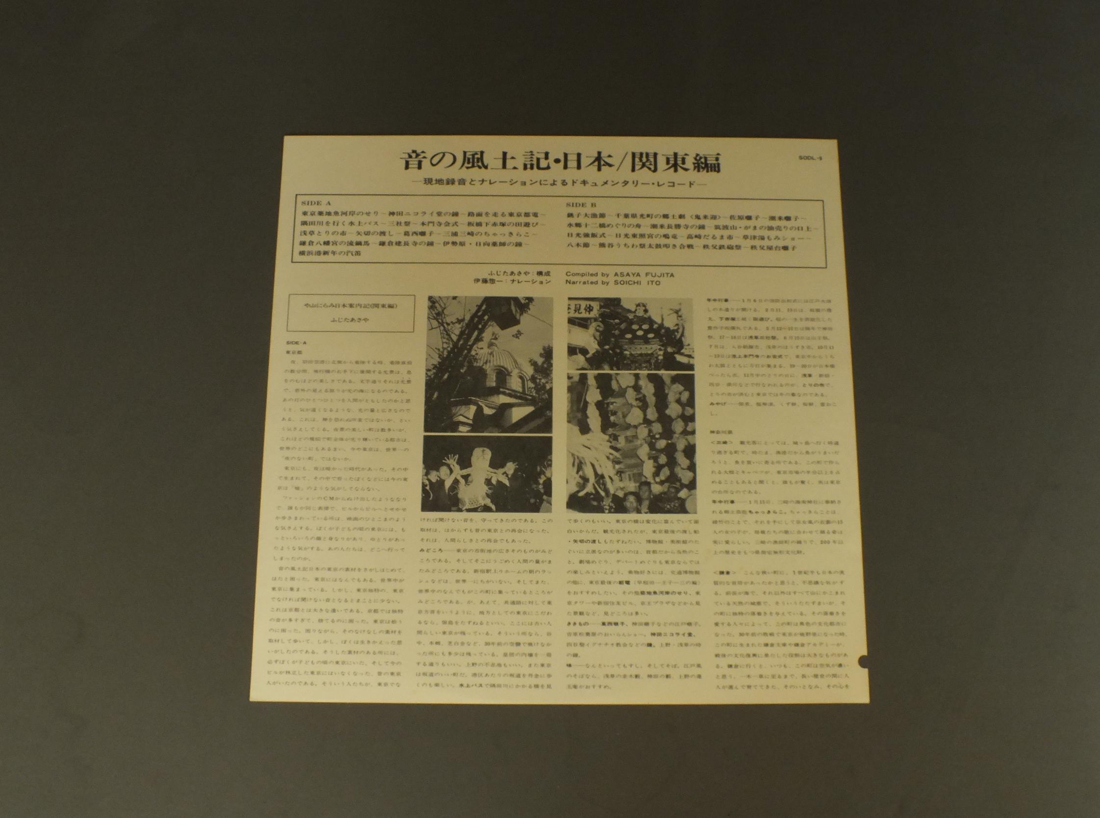 伊藤惣一/JAPANESE TRAD FEAST INSTRUMENTS & SONGS音の風土記 日本・関東編 SODL9 製造国:日本盤 / Media:LP外観:EX盤の状態:EX帯:EX 価格(税込):¥990(売約済) 送料 7inch:定形外郵便 360円~LP:定形外郵便 660円~送料は、注文の最終画面で確認頂けます。 > > /JAPANESE TRAD FEAST INSTRUMENTS & SONGS 外観 (EX)特記事項:ジャケ右下にパンチ穴外観EXの共通説明:ダメージが限定的。中古品としては保存状態がよい方。シミ、ヨゴレ、スレ 少し~軽度。 盤の状態 (EX)特記事項:薄いスリキズ・スレ少しある感じ。一見してきれいな感じです。盤EXの共通説明:盤面のスリキズが薄いものが少し~軽度 音に出そうなものは無いように見える(軽微なソフトティック音は除く)。 帯の状態 (EX):特記なし。 Tweet それぞれの画像をクリックすると、大きい写真が見られます こちらの商品もお勧めです 2,200円 SHINICHI YUIZE唯是震一 / MUSIC OF SHINICHI YUIZE VOL3 QUADRAPHONIC唯是震一の音楽第3集(4チャンネル盤) 770円 YUKO MIKASA三笠優子 / ENKA GEKIJO歌謡浪曲・艶歌劇場 550円 JAPANESE TRADITIONAL FOLK SONG / BEST 35津軽じょんから節/日本の民謡ベスト35 1,210円 YASUKO NAKAJIMA中島靖子 / COLLECTION VOL3中島靖子の音楽第3集 990円 HOZAN YAMAMOTO山本邦山 / BEST SELECTION VOL4古典名曲選集第3集 550円 KOTO MUSIC日本の旋律 箏曲 / BEST 30お茶の間箏曲ベスト30 440円 TOHO KAGESAWA影澤藤峰 / JAPANESE TRADITIONAL FOLK SONG (HOKKAIDO & TOHOKU)民謡おさらい集(東北・北海道編) 440円 JAPANESE TRADITIONAL SONGS民謡決定盤 日本民謡全集1 / HOKAKIDO & AOMORI北海道・青森編