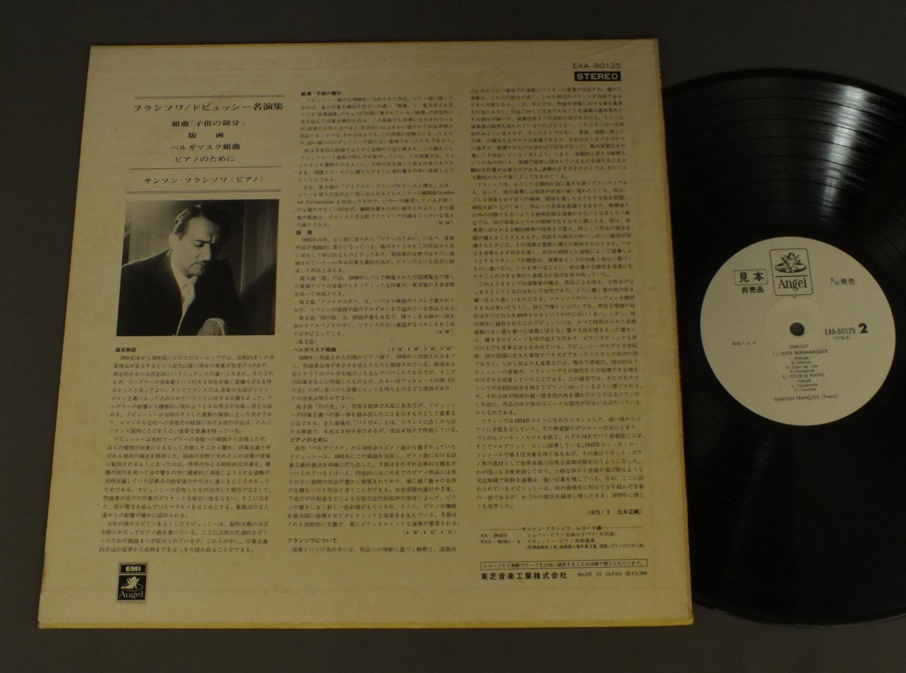 FRANCOISフランソワ/DEBUSSY/OEUVRES POUR PIANOドビュッシー名演集 EAA80125 製造国:日本盤 / Media:LP外観:EX-盤の状態:EX+ 価格(税込):¥550(売約済) 送料 7inch:定形外郵便 360円~LP:定形外郵便 660円~送料は、注文の最終画面で確認頂けます。 > > FRANCOIS/DEBUSSY/OEUVRES POUR PIANO 外観 (EX-)特記事項:特記なし。外観EX-の共通説明:ダメージ軽度~多少。 中古品としては普通の状態。シミ、ヨゴレ、スレなど軽く~多少。 盤の状態 (EX+)特記事項:薄いスリキズ・スレ少し。一見してきれいな状態です。盤EX+の共通説明:盤面の極薄いスリキズ、スレ少し程度 音に出そうなものは無いように見える(極軽微なソフトティック音は除く)。 その他:白見本盤 Tweet それぞれの画像をクリックすると、大きい写真が見られます こちらの商品もお勧めです 990円 STERNスターン / BARTOK - VIOLIN SONATASバルトーク - ヴァイオリン・ソナタ第1番2番 990円 DAVISデイヴィス / MOZART DIVERTIMENTO DIVERTIMENTOモーツァルト ディヴェルティメント第10番-第11番 1,320円 MUNCHINGERカール・ミュンヒンガー / VIVALDI FOUR SEASONSヴィヴァルディ `四季` 作品8の第1-第4 1,430円 MUNROWマンロウ / SUSATO DANSERYE 1551 MORLEY CONSORT LESSONS 1599涙のパヴァーヌ ルネッサンス舞曲の楽しみ 990円 DANZI - STAMITZ - REICHA - BLASER DER BERLINER PHILHARMONIKERベルリン・フィル管弦アンサンブル / MUSIC FOR WINDSベルリン・フィルの名手たちによる木管アンサンブル 990円 FRITZ WERNERF・ヴェルナー / BACH-DIE GROBEN KANTATENバッハ-宗教音楽名盤選 990円 JOG DEMUS - SCHUBERT QUARTETデームス / SCHUBERT - TROUT QUINTETシューベルト - ピアノ5重奏曲ます 990円 R. FESANO - VIRTUOSI DI ROMAレナート・ファザーノ - ローマ合奏団 / VIVALDI - IL CIMENTO DELL`ARMONIA E DELL` INVENTIONEヴィヴァルディ - 合奏協奏曲(和声と創意への試み)全曲