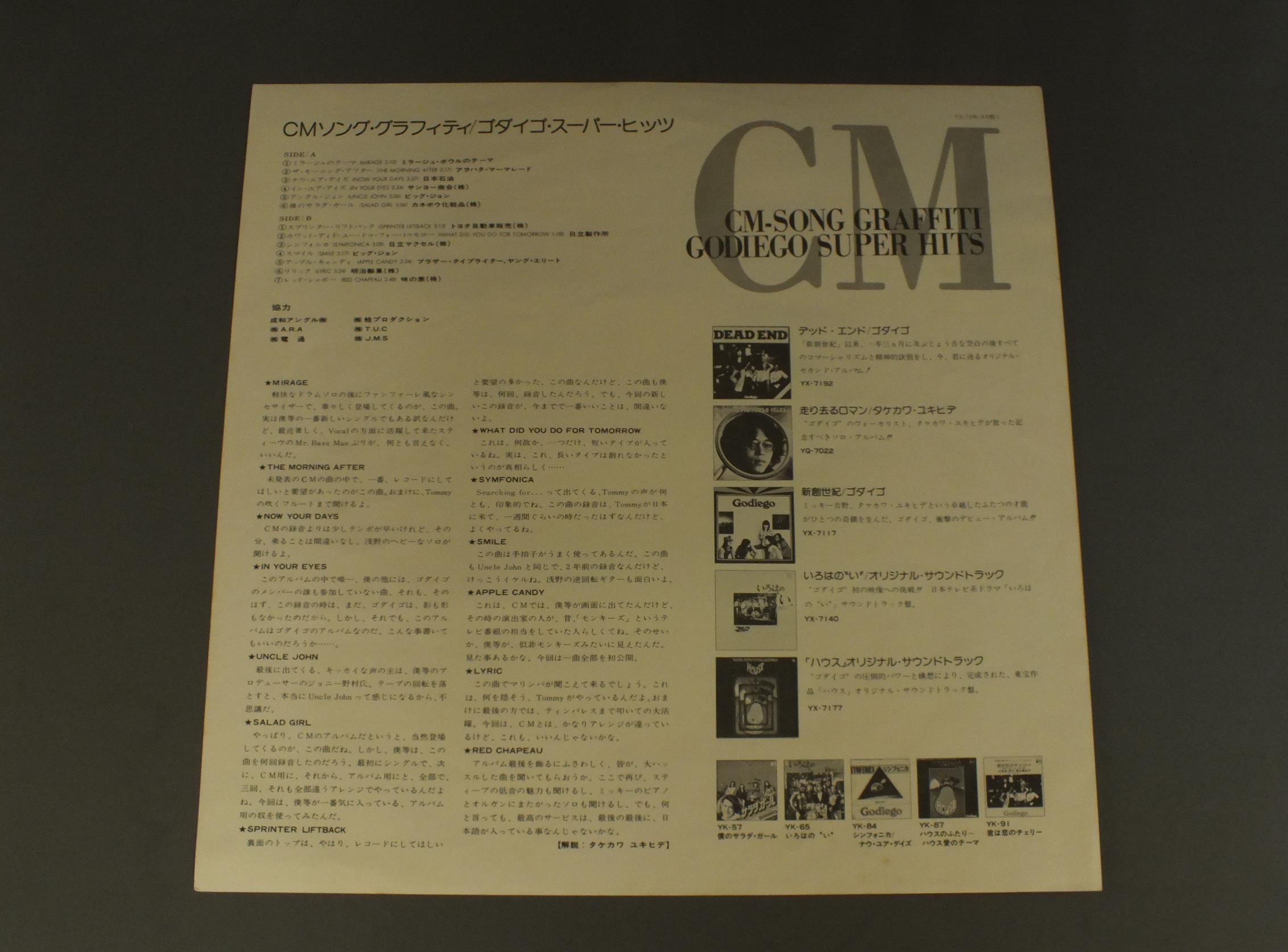 GODIEGOゴダイゴ/CM-SONG GRAFFITI GODIEGO SUPER HITSCMソング・グラフィティ ゴダイゴ スーパー・ヒッツ YX7196AX 製造国:日本盤 / Media:LP外観:EX盤の状態:EX-帯:EX 価格(税込):¥770(売約済) 送料 7inch:定形外郵便 360円~LP:定形外郵便 660円~送料は、注文の最終画面で確認頂けます。 > > GODIEGO/CM-SONG GRAFFITI GODIEGO SUPER HITS 外観 (EX)特記事項:特記なし。外観EXの共通説明:ダメージが限定的。中古品としては保存状態がよい方。シミ、ヨゴレ、スレ 少し~軽度。 盤の状態 (EX-)特記事項:薄いスリキズ・細かい表面スレ軽くある感じ。全体的には殆どが軽微なものの様子です。盤EX-の共通説明:盤面のスリキズが多少有り。音に出そうなものは殆ど無いように見える~さほど気にならないぐらいの軽いプチ数カ所程度。 帯の状態 (EX):特記なし。 Tweet それぞれの画像をクリックすると、大きい写真が見られます こちらの商品もお勧めです 1,870円 TAKURO YOSHIDAよしだたくろう / ON STAGEオン・ステージ ともだち 770円 CANDIESキャンディーズ / CANDY LABELキャンディ・レーベル 440円 MARI AMACHI天地真理 / BRIDGE OF A RAINBOW虹をわたって 660円 MASAMICHI SUGI杉真理 / SYMPHONY #10シンフォニー10 880円 MASA TAKAGI高木麻早 / 1st ALBUM高木麻早 1,320円 MASAAKI HIRAO平尾昌晃 / SING MASAAKI HIRAO平尾昌晃を歌う 770円 CIRCUSサーカス / NEW HORIZON 660円 LILYりりィ / TAEKOタエコ
