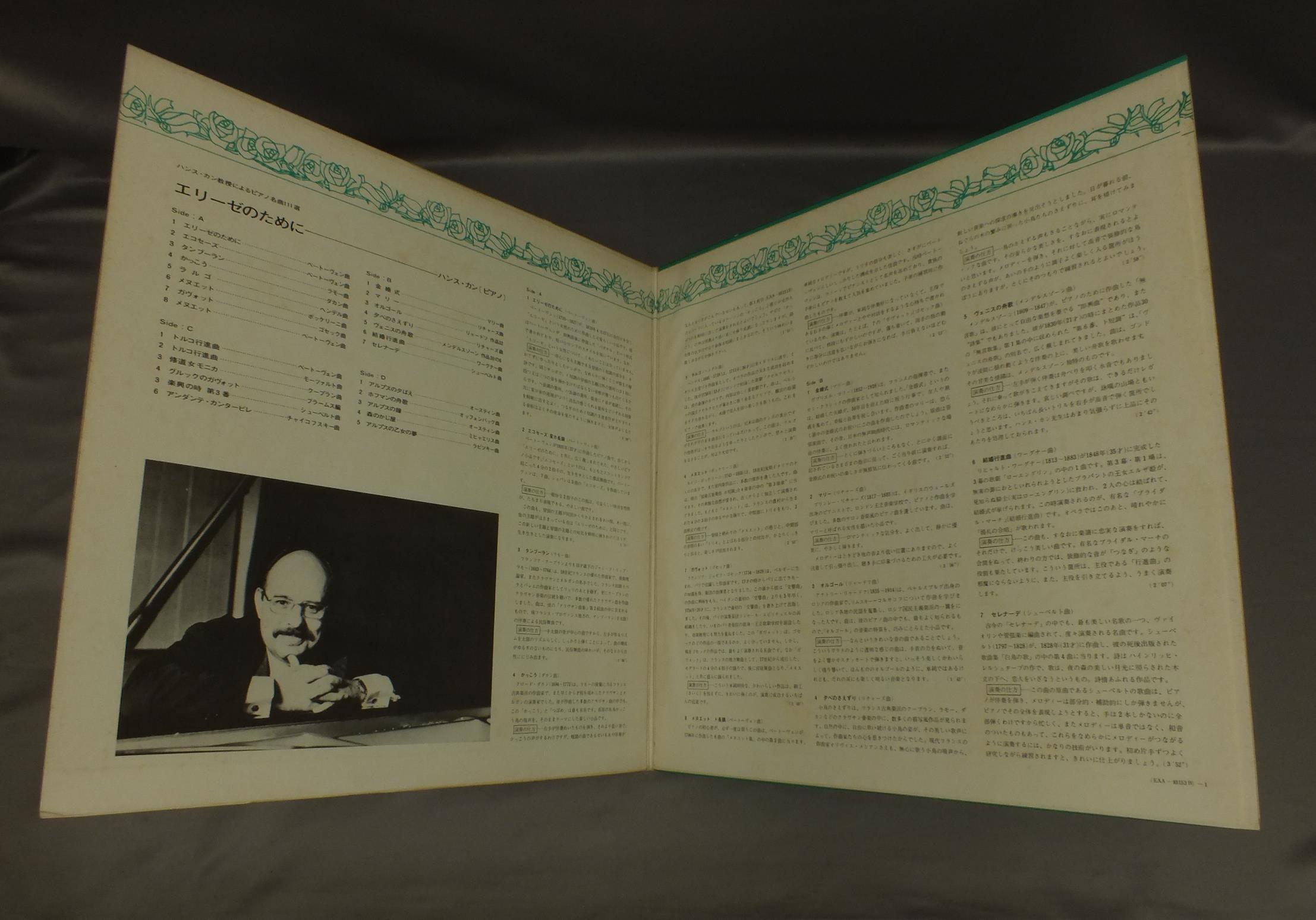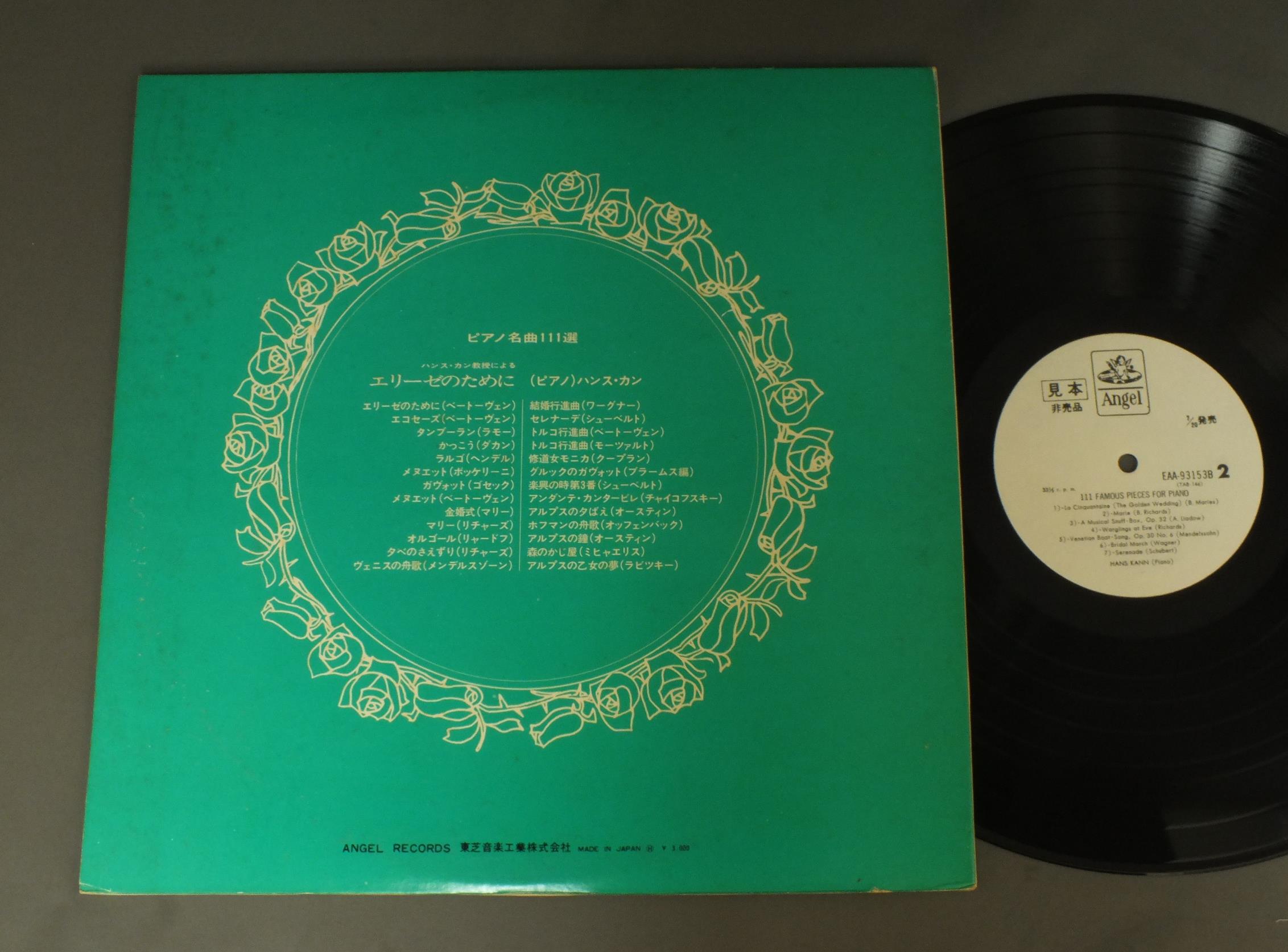 HANS KANNハンス・カン/FUR ELISE/111 FAMOUS PIECES FOR PIANOエリーゼのために/ピアノ名曲111選 EAA93153B 製造国:日本盤 / Media:LP外観:EX-盤の状態:EX+ 価格(税込):¥825(売約済) 送料 7inch:定形外郵便 360円~LP:定形外郵便 660円~送料は、注文の最終画面で確認頂けます。 > > HANS KANN/FUR ELISE/111 FAMOUS PIECES FOR PIANO 外観 (EX-)特記事項:特記なし。外観EX-の共通説明:ダメージ軽度~多少。 中古品としては普通の状態。シミ、ヨゴレ、スレなど軽く~多少。 盤の状態 (EX+)特記事項:極薄いスリキズ・スレ少し。一見してきれいな状態です。盤EX+の共通説明:盤面の極薄いスリキズ、スレ少し程度 音に出そうなものは無いように見える(極軽微なソフトティック音は除く)。 その他:白見本盤 Tweet それぞれの画像をクリックすると、大きい写真が見られます こちらの商品もお勧めです 1,320円 CZECH PHILHARMONICチェコ・フィルハーモニー管弦アンサンブル / MOZART - CHEMBER MUSIC FOR WINDSモーツァルト - 管楽のための室内楽集 990円 SUK-HLAVACEKスーク-フラヴァーチェック / MOZART HAFFNER SERENADE KV250モーツァルト ハフナー・セレナード第7番 KV250 1,320円 PAILLARD - SOLISTES ET ORCHESTRE DE CHAMBREパイヤール - パイヤール室内管弦楽団ソリストたち / BACH - L`OFFRANDE MUSICALEバッハ 音楽の捧げもの 990円 SEVERINO GAZZELLONI-I MUSICIイ・ムジチ合奏団 / VIVALDI-CONCERTI FOR FLUTEヴィヴァルディ-海の嵐 フルート協奏曲集 990円 GRUMIAUX & HASKILグリュミオー & ハスキル / MOZART - SONATAS FOR VIOLIN & PIANOモーツアルト - ヴァイオリン・ソナタ第40番42番 990円 ROSAND-FLISSLERローザンド-フリッスラー / BEETHOVEN VIOLIN SONATAS KREUTZERベートーヴェン ヴァイオリン・ソナタ `クロエツェル``スプリング` 990円 VALENTIN ZVEREVワレンチン・ズヴェルフ / VIRTUUOSITY OF FLUTEフルートの名技 990円 JOHN WUMMER-FERNANDO VALENTIジョン・ウンマー-フェルナンド・ヴァレンティ / BACH-SONATAS FOR FLUTE&HARPSICHORD VOL2バッハ-フルートとハープシコードのための奏鳴曲 第2集