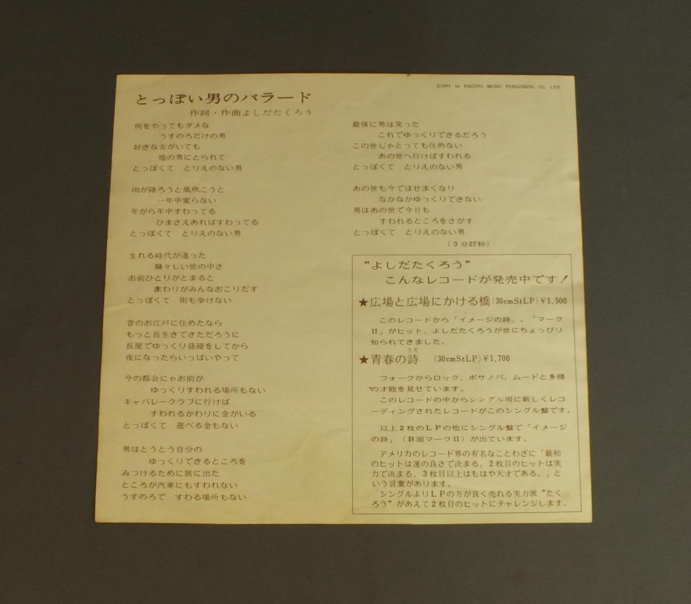 TAKURO YOSHIDAよしだたくろう/SEISHUN NO UTA青春の詩 EB1006 製造国:日本盤 / Media:7inch外観:EX盤の状態:EX- 価格(税込):¥2,200 送料 7inch:定形外郵便 360円~LP:定形外郵便 660円~送料は、注文の最終画面で確認頂けます。 > > TAKURO YOSHIDA/SEISHUN NO UTA 外観 (EX)特記事項:特記なし。外観EXの共通説明:ダメージが限定的。中古品としては保存状態がよい方。シミ、ヨゴレ、スレ 少し~軽度。 盤の状態 (EX-)特記事項:薄いスリキズ・細かい表面スレ軽くある感じ。全体的には殆どが軽微なものの様子です。盤EX-の共通説明:盤面のスリキズが多少有り。音に出そうなものは殆ど無いように見える~さほど気にならないぐらいの軽いプチ数カ所程度。 Tweet それぞれの画像をクリックすると、大きい写真が見られます こちらの商品もお勧めです 770円 KIMIHIKO SATO佐藤公彦 / KEME VOL.2ケメ2 明日天気になあれ 1,980円 TAKURO YOSHIDA吉田拓郎 / SEISHUN-NO UTA青春の詩 1,980円 HAKO YAMAZAKI山崎ハコ / TUNAWATARI綱渡り 1,980円 SHOEBERTSはしだのりひことシューベルツ / MEET THE SHOEBERTS FEATURING NORIHIKO HASHIDA未完成 880円 TETSUO SAITOH斉藤哲夫 / BYE BYE GOODBYEバイバイグッドバイサラバイ 1,210円 SHIGERU IZUMIYA泉谷しげる / EARLY IZUMIYA WORKS初期の泉谷しげる メモリアル 1,320円 RYO KAGAWA加川良 / DEAR Q親愛なるQに捧ぐ 1,210円 KIMIHIKO SATO佐藤公彦 / KEME VOL.11st ALBUM 午後のふれあい