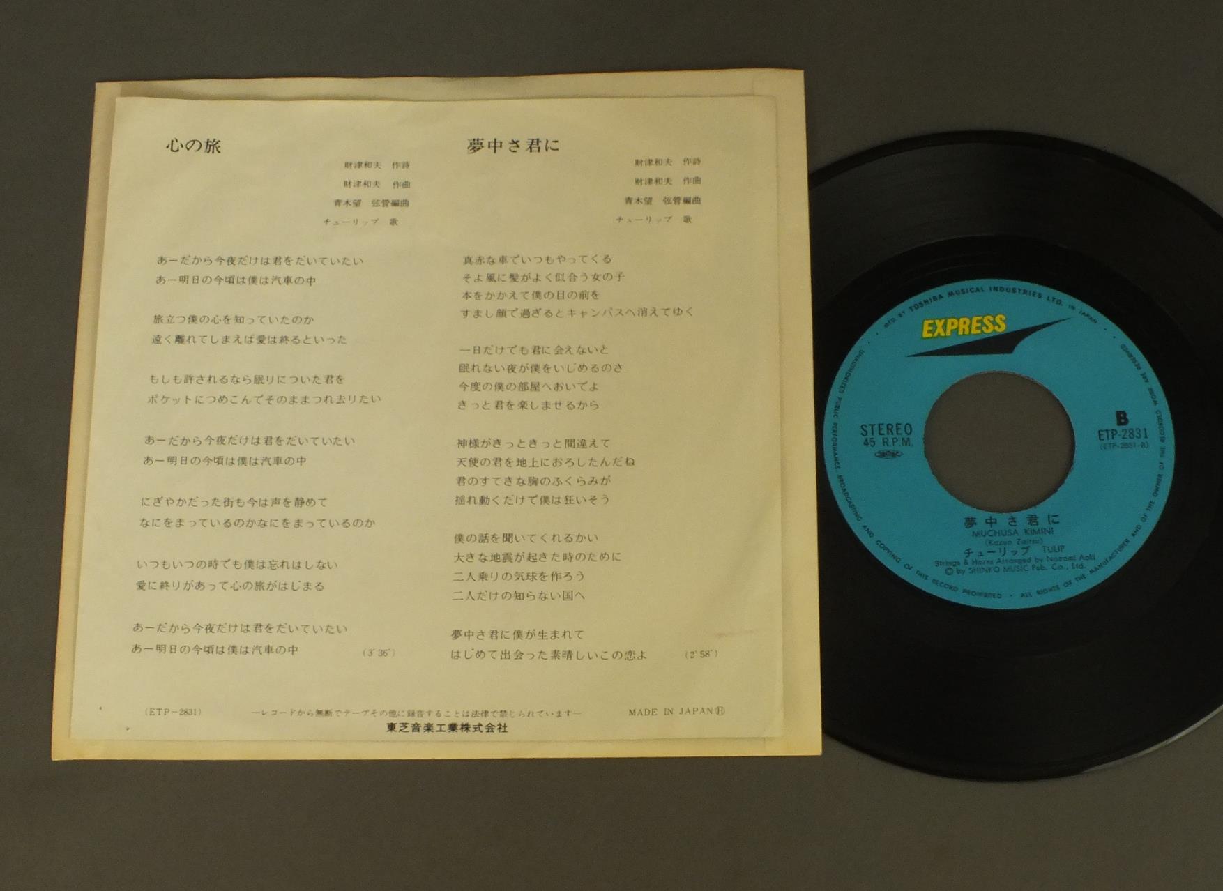 TULIPチューリップ/KOKORO NO TABI心の旅 ETP2831 製造国:日本盤 / Media:7inch外観:EX盤の状態:EX 価格(税込):¥550(売約済) 送料 7inch:定形外郵便 360円~LP:定形外郵便 660円~送料は、注文の最終画面で確認頂けます。 > > TULIP/KOKORO NO TABI 外観 (EX)特記事項:特記なし。外観EXの共通説明:ダメージが限定的。中古品としては保存状態がよい方。シミ、ヨゴレ、スレ 少し~軽度。 盤の状態 (EX)特記事項:薄いスリキズ・スレ少しある感じ。一見してきれいな感じです。盤EXの共通説明:盤面のスリキズが薄いものが少し~軽度 音に出そうなものは無いように見える(軽微なソフトティック音は除く)。 Tweet それぞれの画像をクリックすると、大きい写真が見られます こちらの商品もお勧めです 990円 MASAMICHI SUGI杉真理 / STARGAZERスターゲイザー 880円 TWIST世良公則 &ツイスト / ファースト・アルバム 550円 KEIKO MARUYAMA丸山圭子 / HARU SHIGURE春しぐれ 770円 TAKURO YOSHIDA吉田拓郎 / ONLY YOUオンリー・ユー 1,210円 MASAKO OHYA大屋政子 / LIVE CONCERT 990円 YUKO TOMITAとみたゆう子 / CLASSICAL HEARTクラシカル・ハート 1,650円 MASABUMI KUROSAKA黒坂正文 / MO DO MESSAGE (AUTOGRAPHED)茂道 メッセージ (サイン付) 660円 LILYりりィ / TAEKOタエコ