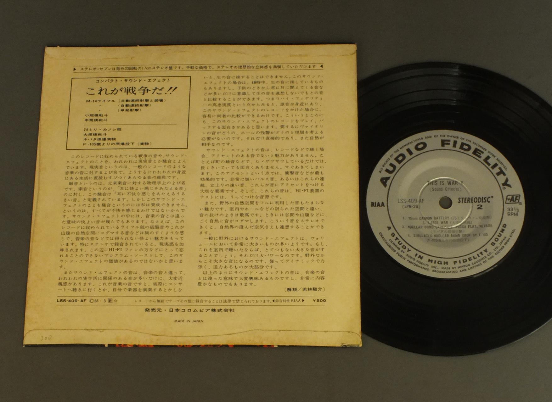 SOUND EFFECTS音響/THIS IS WAR!!これが戦争だ!! LSS409AF 製造国:日本盤 / Media:7inch外観:VG+盤の状態:EX 価格(税込):¥770(売約済) 送料 7inch:定形外郵便 360円~LP:定形外郵便 660円~送料は、注文の最終画面で確認頂けます。 > > SOUND EFFECTS/THIS IS WAR!! 外観 (VG+)特記事項:シミ有り外観VG+の共通説明:ダメージやや有り。シミ、ヨゴレ、スレなど多少~やや多め。 盤の状態 (EX)特記事項:薄いスリキズ・スレ少しある感じ。一見してきれいな感じです。盤EXの共通説明:盤面のスリキズが薄いものが少し~軽度 音に出そうなものは無いように見える(軽微なソフトティック音は除く)。 Tweet それぞれの画像をクリックすると、大きい写真が見られます こちらの商品もお勧めです 990円 JAPANESE STEAM TRAIN鉄道100年 / 蒸機 (保存蒸気機関車のとどろき) 1,320円 DOCUMENTARYNHK海外取材番組 / WORLD TRAIN世界の鉄道