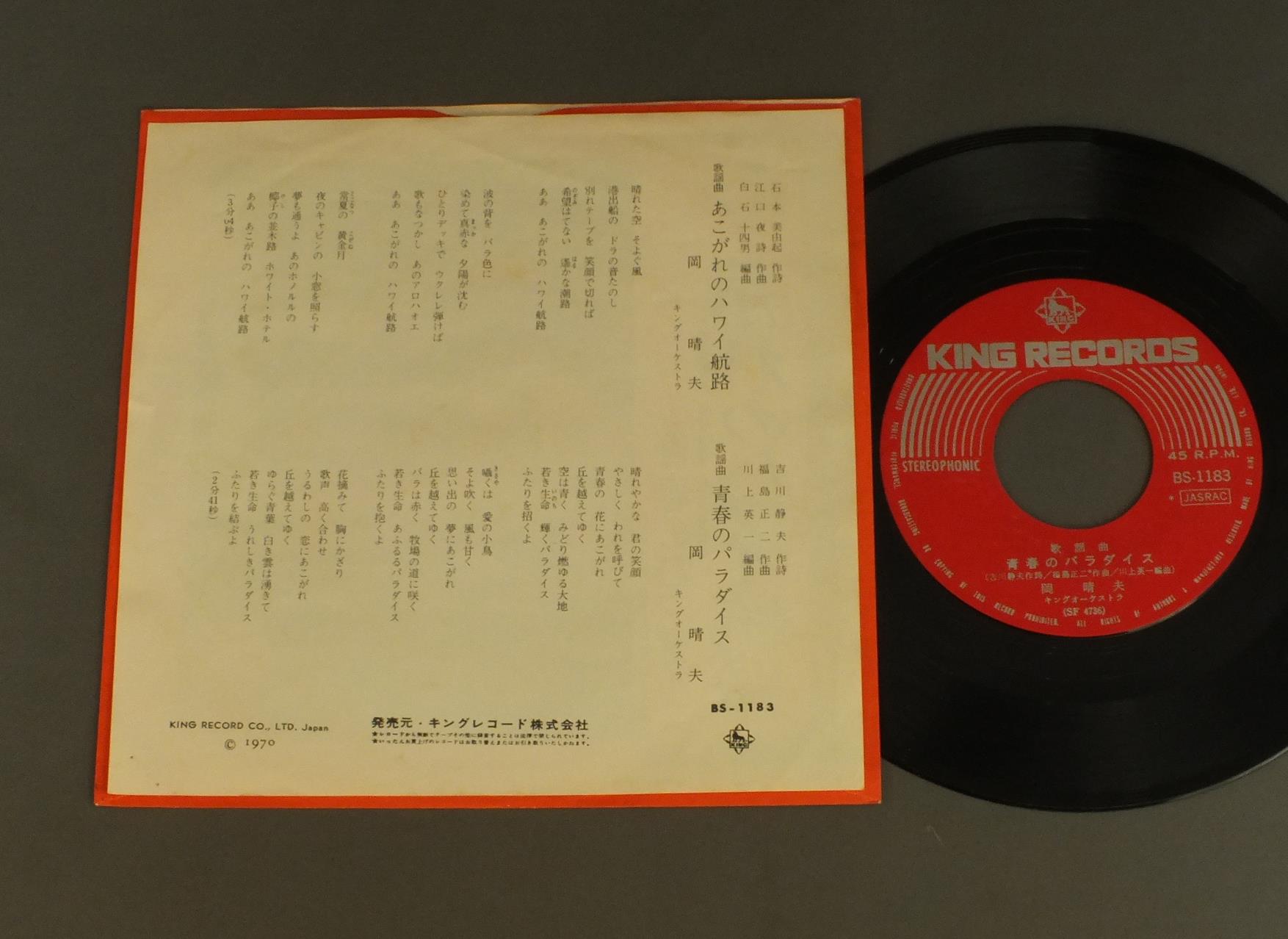 岡晴夫/あこがれのハワイ航路 BS1183 製造国:日本盤 / Media:7inch外観:EX盤の状態:EX 価格(税込):¥550(売約済) 送料 7inch:定形外郵便 360円~LP:定形外郵便 660円~送料は、注文の最終画面で確認頂けます。 > > / 外観 (EX)特記事項:角にホッチキス穴。裏側にシミ有り外観EXの共通説明:ダメージが限定的。中古品としては保存状態がよい方。シミ、ヨゴレ、スレ 少し~軽度。 盤の状態 (EX)特記事項:薄いスリキズ・スレ少しある感じ。一見してきれいな感じです。盤EXの共通説明:盤面のスリキズが薄いものが少し~軽度 音に出そうなものは無いように見える(軽微なソフトティック音は除く)。 Tweet それぞれの画像をクリックすると、大きい写真が見られます こちらの商品もお勧めです 1,210円 高峰秀子-橋幸夫 他 / 続 日本流行歌史 880円 上原敏 / ポリドール(SP原盤)シリーズ -第6集- 哀愁の抒情・マドロス歌謡 880円 村田英雄-青山和子-安達明 他 / コロムビア歌のハイライト (第五集) 550円 HISAO ITO伊藤久男 / BEST ALBUM懐しの歌声 伊藤久男と共に 770円 三浦洸一 / ゴールデン・ヒット 660円 CHIEKO SATOH佐藤千夜子 / BEST COLLECTIONオリジナル原盤による懐しの歌声シリーズ4 東京行進曲 770円 YUJIRO ISHIHARA石原裕次郎 / YUJIRO ISHIHARA ORIGINAL BEST石原裕次郎オリジナルベスト 770円 MIDORI SASA笹みどり / BEST HITS下町育ち 笹みどりヒット集
