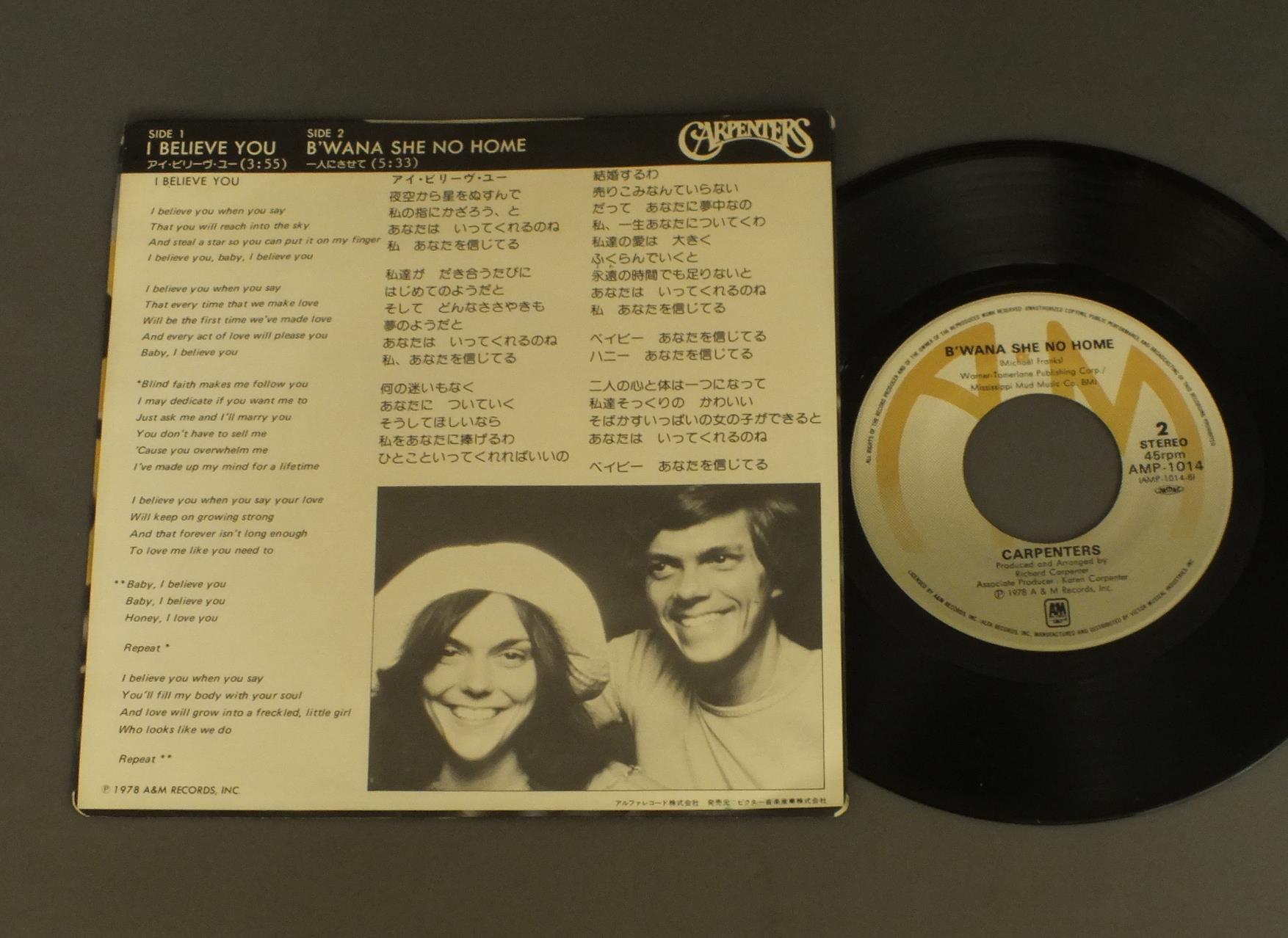 CARPENTERSカーペンターズ/I BELIEVE YOUアイ・ビリーヴ・ユー AMP1014 製造国:日本盤 / Media:7inch外観:EX+盤の状態:EX+ 価格(税込):¥660(売約済) 送料 7inch:定形外郵便 360円~LP:定形外郵便 660円~送料は、注文の最終画面で確認頂けます。 > > CARPENTERS/I BELIEVE YOU 外観 (EX+)特記事項:特記なし。外観EX+の共通説明:中古としては美品、一見してきれいでダメージが軽微。シミ、ヨゴレ、スレ有っても僅か~少し。 盤の状態 (EX+)特記事項:極薄いスリキズ・スレ少し。一見してきれいな状態です。盤EX+の共通説明:盤面の極薄いスリキズ、スレ少し程度 音に出そうなものは無いように見える(極軽微なソフトティック音は除く)。 Tweet それぞれの画像をクリックすると、大きい写真が見られます こちらの商品もお勧めです 990円 VERONIQUE SANSONヴェロニック・サンソン / LIVE AT THE OLYMPIAライヴ・アット・オランピア 1,320円 CYNDI LAUPERシンディ・ローパー / TRUE COLORSトゥルー・カラーズ 880円 DAMIAダミア / CHANSON DE PARIS VOL5 `DAMIA`シャンソン・ド・パリ 第5集 ダミア 1,320円 KARLA BONOFFカーラ・ボノフ / WILD HEART OF THE YOUNG麗しの女 770円 MARLENE DIETRICHマレーネ・ディートリッヒ / LILI MARLENEリリー・マルレーン 770円 PAT BENATARパット・べネター / LIVE FROM EARTHライブ・フロム・アース 1,210円 OLIVIA NEWTON-JOHNオリビア・ニュートンジョン / LET ME BE THEREレット・ミー・ビー・ゼア 1,320円 OLIVIA NEWTON-JOHNオリビア・ニュートン・ジョン / PHYSICAL虹色の扉