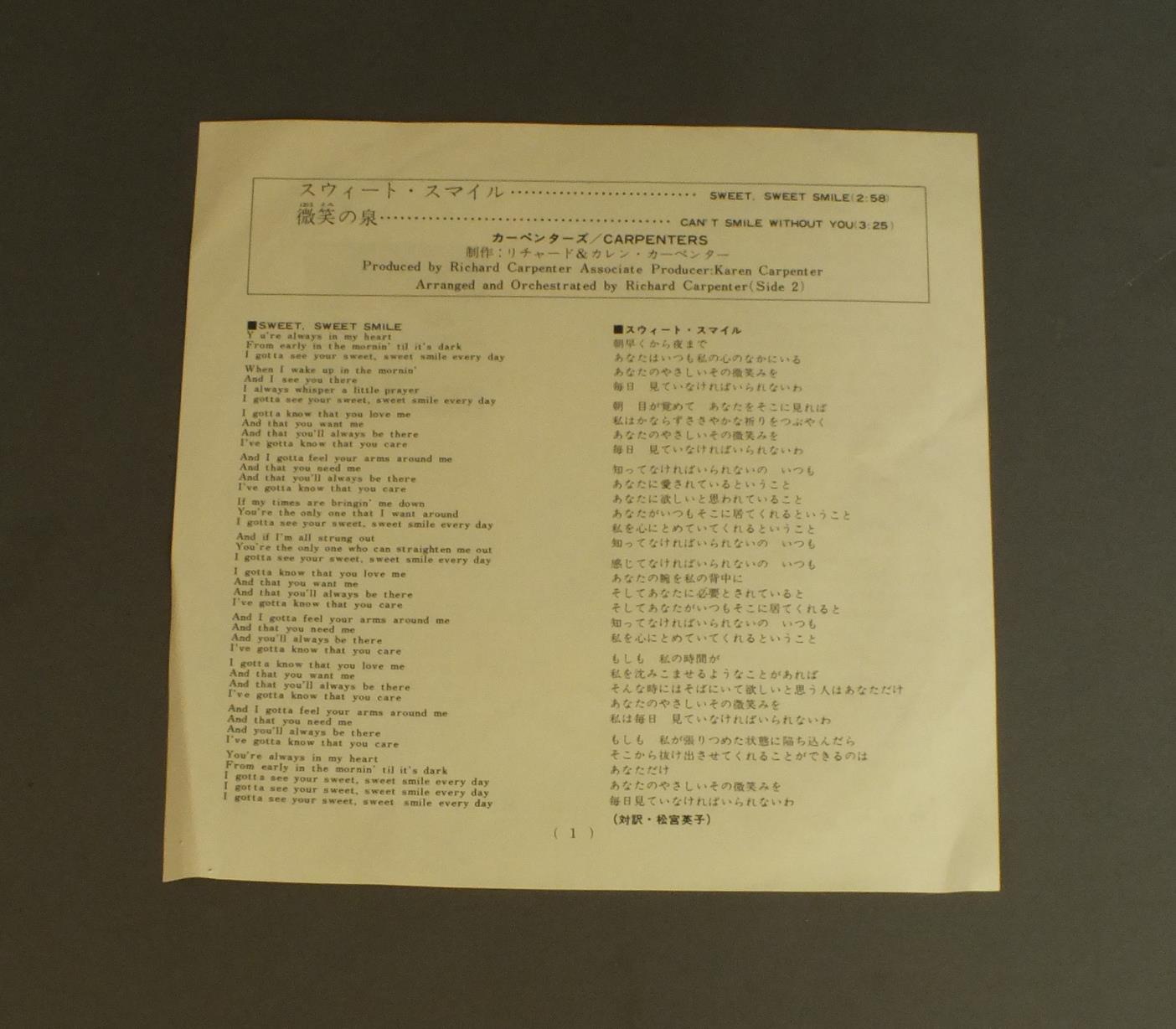 CARPENTERSカーペンターズ/SWEET.SWEET SMILEスウィート・スマイル CM2045 製造国:日本盤 / Media:7inch外観:EX-盤の状態:EX 価格(税込):¥440(売約済) 送料 7inch:定形外郵便 360円~LP:定形外郵便 660円~送料は、注文の最終画面で確認頂けます。 > > CARPENTERS/SWEET.SWEET SMILE 外観 (EX-)特記事項:特記なし。外観EX-の共通説明:ダメージ軽度~多少。 中古品としては普通の状態。シミ、ヨゴレ、スレなど軽く~多少。 盤の状態 (EX)特記事項:薄いスリキズ・スレ少しある感じ。一見してきれいな感じです。盤EXの共通説明:盤面のスリキズが薄いものが少し~軽度 音に出そうなものは無いように見える(軽微なソフトティック音は除く)。 Tweet それぞれの画像をクリックすると、大きい写真が見られます こちらの商品もお勧めです 1,980円 LOUISE GOFFINルイーズ・ゴーフィン / LOUISE GOFFIN堕天使 990円 DORIS DAY - ROBERT GOULETドリス・デイ - ロバート・グーレ / ANNIE GET YOUR GUN 60s ISSUEアニーよ銃をとれ ペラジャケ 770円 OLIVIA NEWTON-JOHNオリビア・ニュートン・ジョン / PHYSICAL虹色の扉 880円 MIREILLE MATHIEUミレイユ・マチュー / GOLDEN HOUR OF MIREILLE MATHIEUゴールデン・アワー・オブ・ミレイユ・マチュー 660円 RITA COOLIDGEリタ・クーリッジ / ALL ABOUT RITA COOLIDGEあなたしか見えない リタ・クーリッジの全て 1,650円 MIREILLE MATHIEUミレイユ・マチュー / MIREILLE MATHIEU GOLDEN COLLECTION VOL2ミレイユ・マチュー・ゴールデン・コレクション第2集 770円 MERINA MERCOURIメリナ・メルクーリ / MERINA MERCOURIギリシャへの郷愁 770円 PAT BENATARパット・べネター / PRECIOUS TIMEプレシャス・タイム