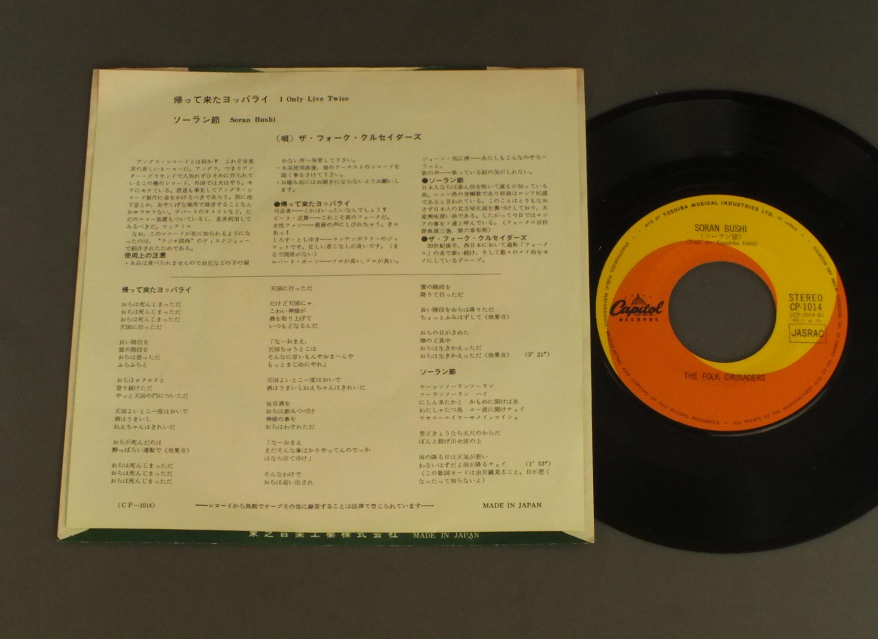 FOLK CRUSADERSフォーク・クルセイダーズ/I ONLY LIVE TWICE帰ってきたヨッパライ CP1014 製造国:日本盤 / Media:7inch外観:EX+盤の状態:EX 価格(税込):¥550(売約済) 送料 7inch:定形外郵便 360円~LP:定形外郵便 660円~送料は、注文の最終画面で確認頂けます。 > > FOLK CRUSADERS/I ONLY LIVE TWICE 外観 (EX+)特記事項:特記なし。外観EX+の共通説明:中古としては美品、一見してきれいでダメージが軽微。シミ、ヨゴレ、スレ有っても僅か~少し。 盤の状態 (EX)特記事項:薄いスリキズ・スレ軽くある感じ。殆どが軽微なものの様子です。盤EXの共通説明:盤面のスリキズが薄いものが少し~軽度 音に出そうなものは無いように見える(軽微なソフトティック音は除く)。 Tweet それぞれの画像をクリックすると、大きい写真が見られます こちらの商品もお勧めです 1,320円 SHIGERU IZUMIYA泉谷しげる / 3rd ALBUM第三集 地球はお祭りさわぎ 1,320円 JIRO`Sジローズ / FOR THE LOVE & YOU JIRO`S 1ジローズ登場 戦争を知らない子供たち 赤盤 770円 KATSUYUKI MIYAZAWA宮沢勝之 / LIVE IN KIYOSE 81 AUTOGRAPHED陽気に生きようこの人生をさ LIVE IN 清瀬 サイン付 1,980円 SHINTARO GODO五堂新太郎 / FADE INフェイド・イン 770円 N.S.P. (NEW SADISTIC PINK)N.S.P. / ORIRO NAOSHIおいろなおし 770円 TAKASHI NISHIOKA西岡たかし / SOUPスープ 770円 JIRO SUGITA杉田二郎 / DAIMEI NO NAI AI NO UTA題名のない愛の唄 770円 IRUKAイルカ / NOEL`S FANTASTIC TRIPノエルの不思議な冒険