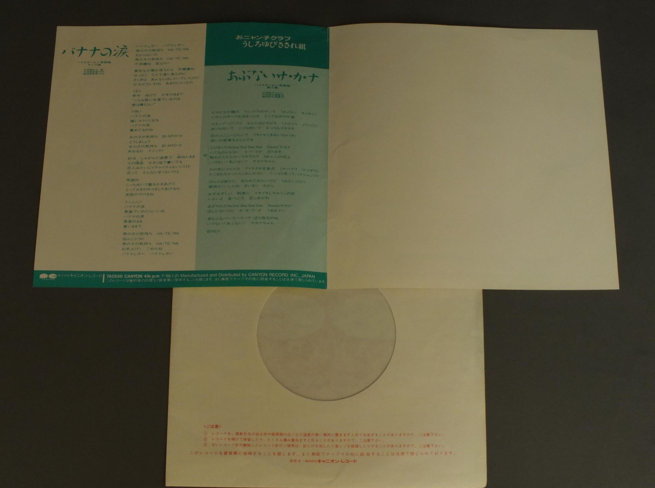 USHIROYUBI SASARE GUMIおニャン子クラブ・うしろ指さされ組/ANIME HISCHOOL KIMENNGUMIアニメ「ハイスクール!奇面組」バナナの涙 7A0550 製造国:日本盤 / Media:7inch外観:EX盤の状態:EX+ 価格(税込):¥330(売約済) 送料 7inch:定形外郵便 360円~LP:定形外郵便 660円~送料は、注文の最終画面で確認頂けます。 > > USHIROYUBI SASARE GUMI/ANIME HISCHOOL KIMENNGUMI 外観 (EX)特記事項:特記なし。外観EXの共通説明:ダメージが限定的。中古品としては保存状態がよい方。シミ、ヨゴレ、スレ 少し~軽度。 盤の状態 (EX+)特記事項:薄いスリキズ・スレ少し。一見してきれいな状態です。盤EX+の共通説明:盤面の極薄いスリキズ、スレ少し程度 音に出そうなものは無いように見える(極軽微なソフトティック音は除く)。 Tweet それぞれの画像をクリックすると、大きい写真が見られます こちらの商品もお勧めです 660円 HIROKO TANIYAMA谷山浩子 / MOUHITORI NO ALICEもうひとりのアリス 770円 CHIEMI KAI甲斐智枝美 / WINK ( 1st ALBUM )ウインク 770円 SHOKO SAWADA沢田聖子 / 1st ALBUM坂道の少女 990円 YOU HAYAMI早見優 / RECESSリーセス 770円 ERI NITTA新田恵利 / E-AREA 1,210円 NAOKO KAWAI河合奈保子 / DIARYダイアリー 1,320円 YOU HAYAMI早見優 / COLORFUL BOX 880円 SONOKO KAWAI河合その子 / SONOKOその子