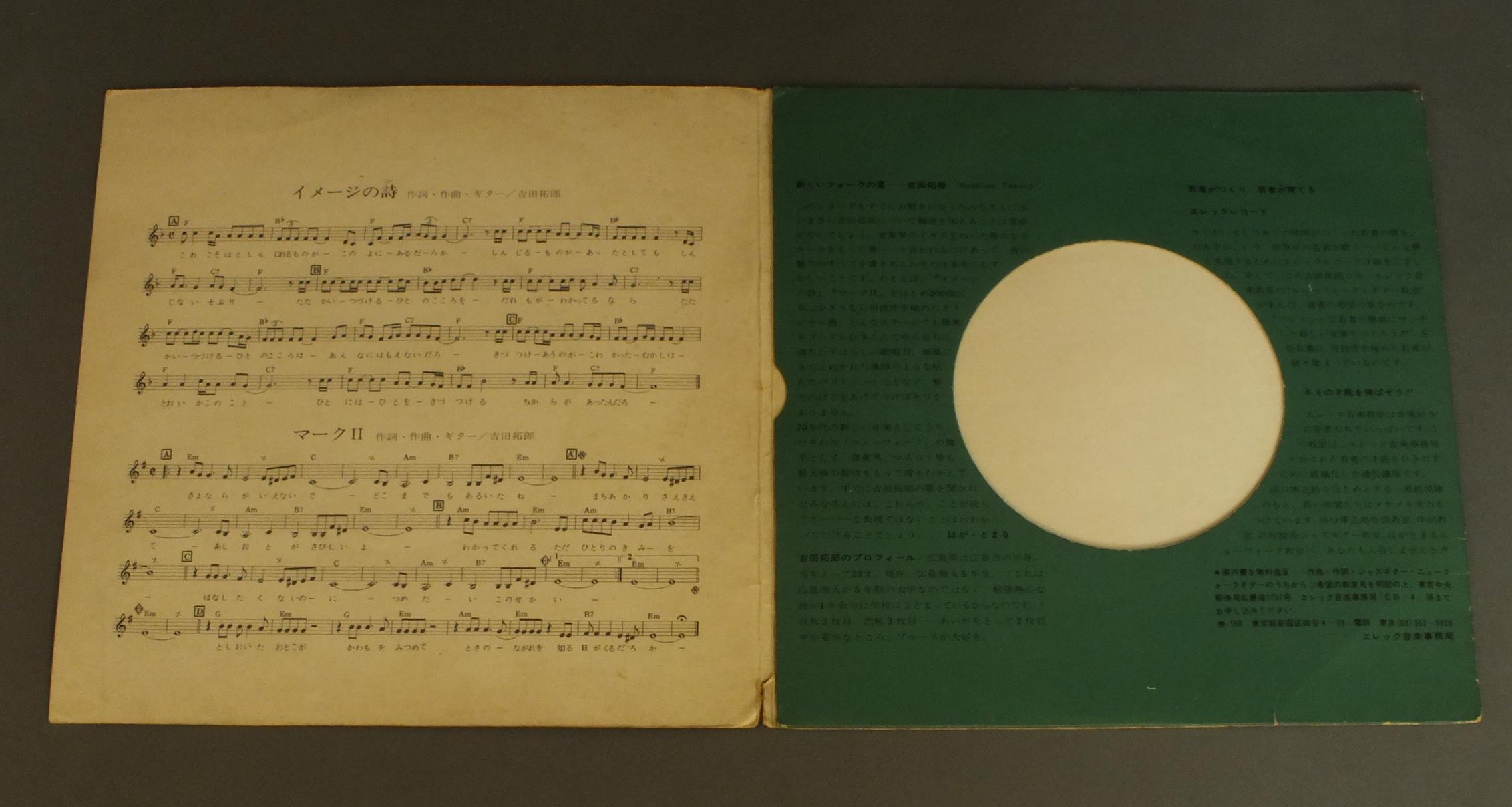 吉田拓郎/イメージの詩 EB1004 製造国:日本盤 / Media:7inch外観:VG+盤の状態:EX 価格(税込):¥2,750(売約済) 送料 7inch:定形外郵便 360円~LP:定形外郵便 660円~送料は、注文の最終画面で確認頂けます。 > > / 外観 (VG+)特記事項:特記なし。外観VG+の共通説明:ダメージやや有り。シミ、ヨゴレ、スレなど多少~やや多め。 盤の状態 (EX)特記事項:薄いスリキズ・スレ少しある感じ。一見してきれいな感じです。盤EXの共通説明:盤面のスリキズが薄いものが少し~軽度 音に出そうなものは無いように見える(軽微なソフトティック音は除く)。 Tweet それぞれの画像をクリックすると、大きい写真が見られます こちらの商品もお勧めです 880円 KEM佐藤公彦 / KEME VOL3千羽鶴 3,080円 UTANOICHI唄の市 / 2nd ALBUMセカンド 2,420円 ALL JAPAN FOLK JAMBORRE全日本フォークジャンボリー / LIVE 19711971 (出逢いの記録 その燃焼) 2,200円 KOHEI OIKAWA及川恒平 / 1st ALBUM忘れたお話 及川恒平1 1,980円 KOMURO HITOSHI小室等 / KOMURO HITOSHI FIRST ALBUM小室等ファースト・アルバム-私は月には行かないだろう 1,320円 ITSUTSUNO AKAI FUSEN五つの赤い風船 / FOLK ALBUM VOL1フォーク・アルバム第1集 990円 RANBO MINAMIみなみ らんぼう / KATARITUKUSENAI MAY語り尽くせない五月 990円 MINAMI RANBOみなみらんぼう / BEST COLLECTIONベスト・コレクション 人生と旅