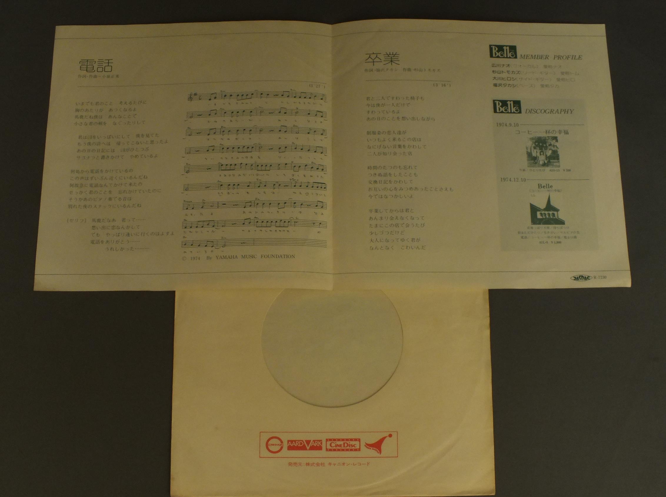 BELLEベル/TELEPHONE電話 AIS19 製造国:日本盤 / Media:7inch外観:EX盤の状態:EX 価格(税込):¥330(売約済) 送料 7inch:定形外郵便 360円~LP:定形外郵便 660円~送料は、注文の最終画面で確認頂けます。 > > BELLE/TELEPHONE 外観 (EX)特記事項:特記なし。外観EXの共通説明:ダメージが限定的。中古品としては保存状態がよい方。シミ、ヨゴレ、スレ 少し~軽度。 盤の状態 (EX)特記事項:薄いスリキズ・スレ軽くある感じ。軽微なものの様子です。盤EXの共通説明:盤面のスリキズが薄いものが少し~軽度 音に出そうなものは無いように見える(軽微なソフトティック音は除く)。 Tweet それぞれの画像をクリックすると、大きい写真が見られます こちらの商品もお勧めです 770円 IRUKAイルカ / JULIAジュリア 1,650円 ITSUTSUNO AKAI FUSEN五つの赤い風船 / FOLK ALBUM NO1フォーク・アルバム第1集 880円 N.S.Pニュー・サディスティック・ピンク / N.S.P. FIRSTN.S.P. I 2,200円 FLUID古井戸 / FLUID VOL.4四季の詩 1,210円 KIMIHIKO SATO佐藤公彦 / KEME VOL.11st ALBUM 午後のふれあい 1,980円 KOMURO HITOSHI小室等 / KOMURO HITOSHI FIRST ALBUM小室等ファースト・アルバム-私は月には行かないだろう 770円 TAKASHI NISHIOKA西岡たかし / SOUPスープ 1,210円 NOBUYASU OKABAYASHI岡林信康 / OOINARU ISAN大いなる遺産