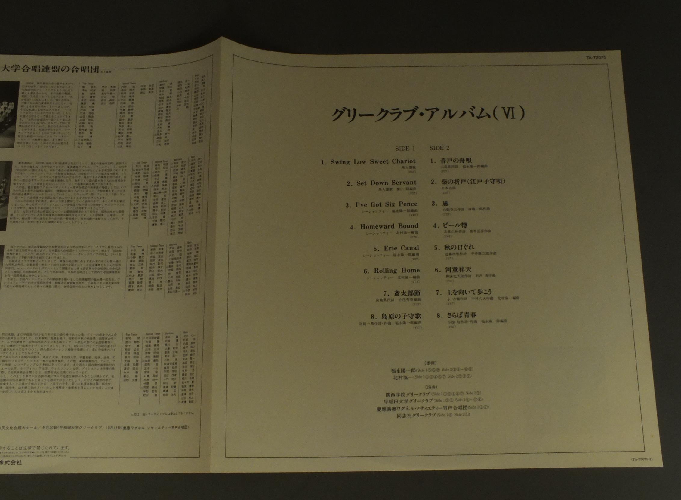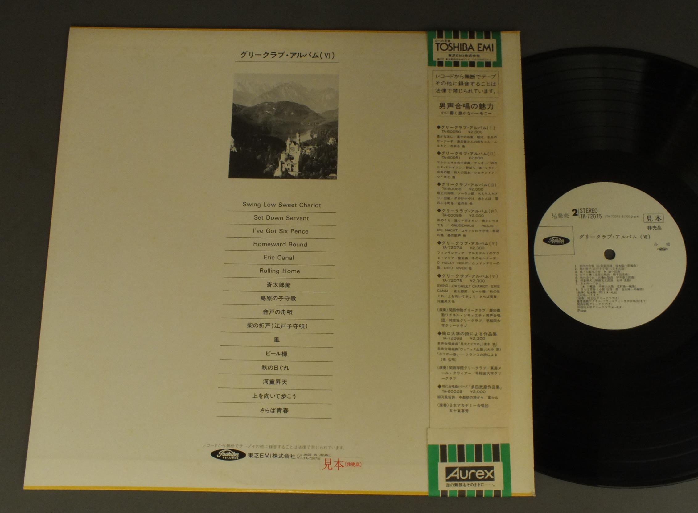 福永陽一郎/北村協一/GLEE CLUB ALBUM(6)グリークラブ・アルバム(6) TA72075 製造国:日本盤 / Media:LP外観:EX盤の状態:EX+ 価格(税込):¥1,100(売約済) 送料 7inch:定形外郵便 360円~LP:定形外郵便 660円~送料は、注文の最終画面で確認頂けます。 > > /GLEE CLUB ALBUM(6) 外観 (EX)特記事項:特記なし。外観EXの共通説明:ダメージが限定的。中古品としては保存状態がよい方。シミ、ヨゴレ、スレ 少し~軽度。 盤の状態 (EX+)特記事項:極薄いスリキズ・スレ少し。一見してきれいな状態です。盤EX+の共通説明:盤面の極薄いスリキズ、スレ少し程度 音に出そうなものは無いように見える(極軽微なソフトティック音は除く)。 帯の状態 ():特記なし。 その他:見本盤 Tweet それぞれの画像をクリックすると、大きい写真が見られます こちらの商品もお勧めです 1,320円 ELLY AMELINGエリー・アメリンク / SINGT LIEDER BRAHMSブラームス歌曲集 990円 YURLOV-SVETLANOVユルロフ-スヴェトラノフ / PROKOFIEV ALEXANDER NEVSKYプロコフィエフ カンタータ `アレクサンドル・ネフスキー` 1,320円 DIMTROVAディミトローヴァ / OPERA ARIASオペラ・アリア集 990円 NICOLAI GHIAUROV-ZLATINA GHIAUROVニコライ・ギャウロフ-ズラティーナ・ギャウロフ / RUSSIAN SONGSロシア歌曲リサイタル 770円 MIWAKO MATSUMOTO松本美和子 / ARIE ANTICHE ITALIANEイタリア古典歌曲集(1)カロ ミオ ベン 990円 PREY-RICHTERプライ-リヒター / HUGO WOLF-EICHENDORFF-LIEDERヴォルフ-アイヒェンドルフ歌曲集 990円 STEPHANE CAILLAT - PAILLARD CHAMBER ORCHステファンヌ・カイヤー - パイヤール室内管弦楽団 / DELALANDE - DE PROFUNDISドラランド - 大モテット 深き淵より 2,420円 SERAFIN - CALLASセラフィン - カラス - ミラノ・スカラ座管弦楽団 / VERDI - RIGOLETTO 2LP BOXヴェルディ - リゴレット 2枚組