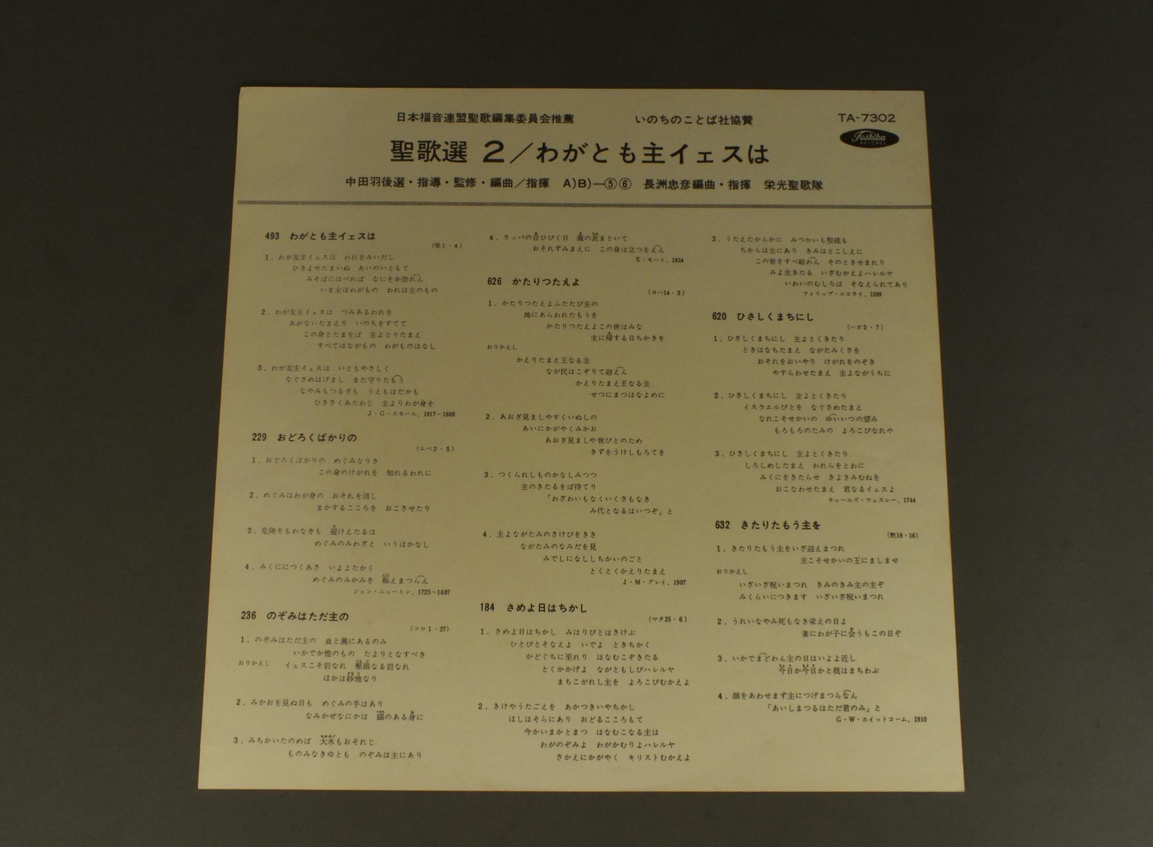 長州忠彦/中田羽後/聖歌選(2)わがとも主イェスは TA7302 製造国:日本盤 / Media:LP外観:EX-盤の状態:EX 価格(税込):¥1,100(売約済) 送料 7inch:定形外郵便 360円~LP:定形外郵便 660円~送料は、注文の最終画面で確認頂けます。 > > / 外観 (EX-)特記事項:シミや日焼け有り外観EX-の共通説明:ダメージ軽度~多少。 中古品としては普通の状態。シミ、ヨゴレ、スレなど軽く~多少。 盤の状態 (EX)特記事項:薄いスリキズ・スレ少しある感じ。一見してきれいな感じです。盤EXの共通説明:盤面のスリキズが薄いものが少し~軽度 音に出そうなものは無いように見える(軽微なソフトティック音は除く)。 帯の状態 ():底で切れ Tweet それぞれの画像をクリックすると、大きい写真が見られます こちらの商品もお勧めです 990円 HEINZ WALLBERGハインツ・ワルベルク / BALTSA-OPERN-RECITALバルツァ-オペラ・リサイタル 990円 WALLBERGワルベルク ビルギット・ニルソン / BEETHOVEN. WEBER & MOZARTビルギット・ニルソン名唱集 990円 PAILLARD - ORCHESTRE DE CHAMBRE JEAN FRANCOIS PAILLARDステファヌ・カイヤー - パイヤール室内管弦楽団 / DELALANED - PROFUNDISドゥラランド - 大モテト 深き淵より 990円 HELMUT KOCHヘルムート・コッホ / HAYDN-DIE SCHOPFUNGハイドン-オラトリオ 天地創造 全曲 990円 ENRICO CARUSOエンリコ・カルーソー / ENRICO CARUSO SINGT OPERN VOL.2エンリコ・カルーソー名唱集第2集 1,320円 VICTORIA DE LOS ANGELESヴィクトリア・デ・ロス・アンヘレス / A WOELD OF SONG珠玉の世界愛唱曲集 1,320円 FISCHER-DIESKAUフィッシャーディースカウ / SCHUBERT - SCHWANENGESANGシューベルト - 白鳥の歌 990円 LILY PONS - JAN PEERCE etcリリー・ポンス - ジャン・ピアース 他 / GOLDEN VOICES SING LIGHT MUSIC名歌手の饗宴
